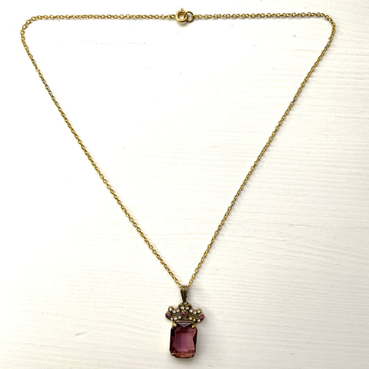 ヴィンテージ 1950-60 年代 紫の長方形ガラスとラインストーンの王冠ネックレス