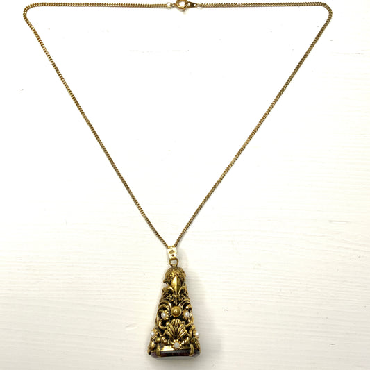 ヴィンテージ 1950 年代 ゴールドトーン 装飾 コーン & アメジスト アート ガラス フォブ スタイル ペンダント ネックレス