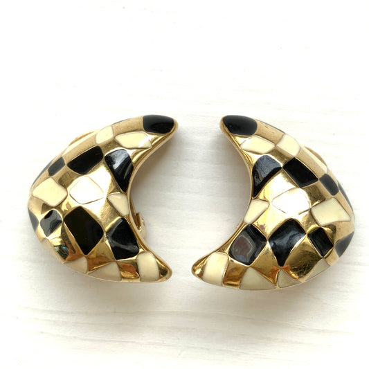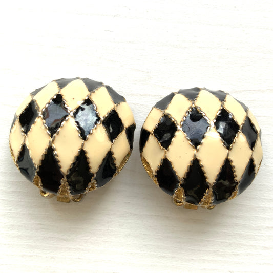 ヴィンテージ 1980年代 ブラック&ホワイトエナメル ハーレクインパターン クリップイヤリング