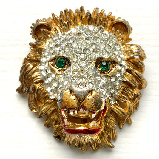 ヴィンテージ 1970 年代 スフィンクス ゴールドトーン & ラインストーン ライオンヘッド ブローチ