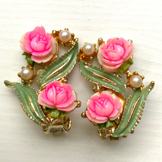 ヴィンテージ ピンク プラスチック ローズ&パール クリップイヤリング
