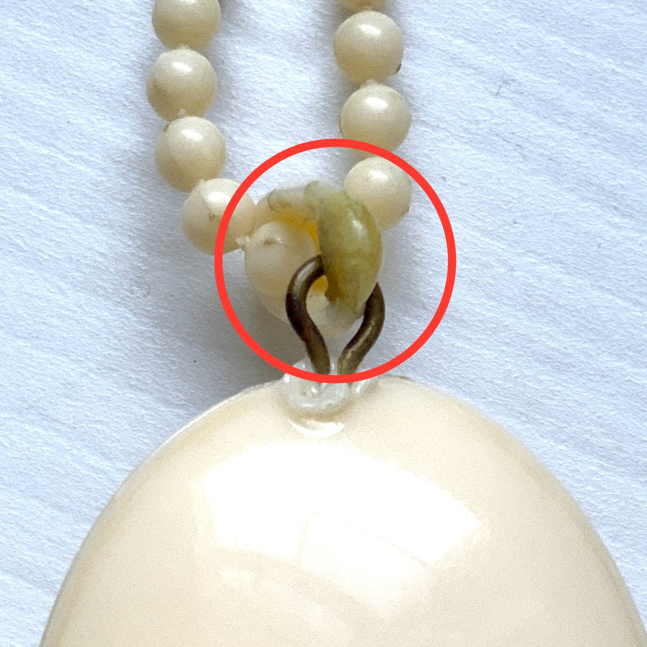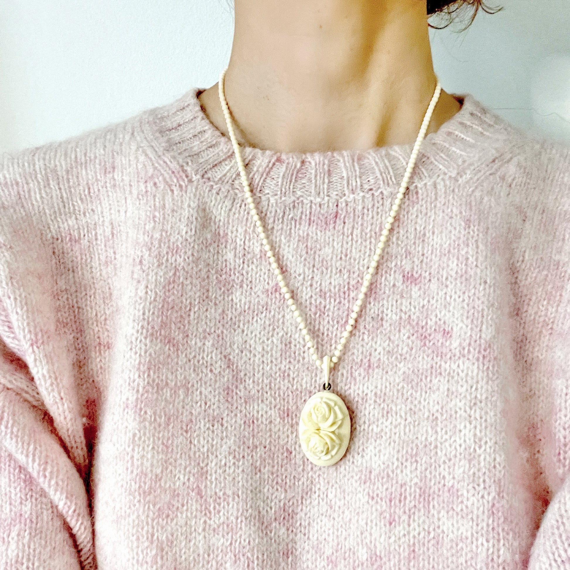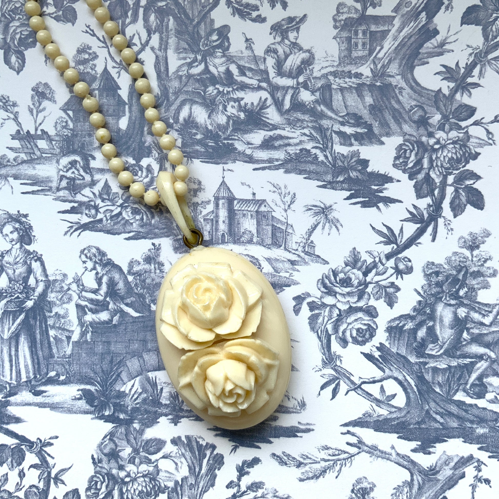 バラの花の形をしたアイボリー色のプラスチック製のペンダントが付いたネックレスです。