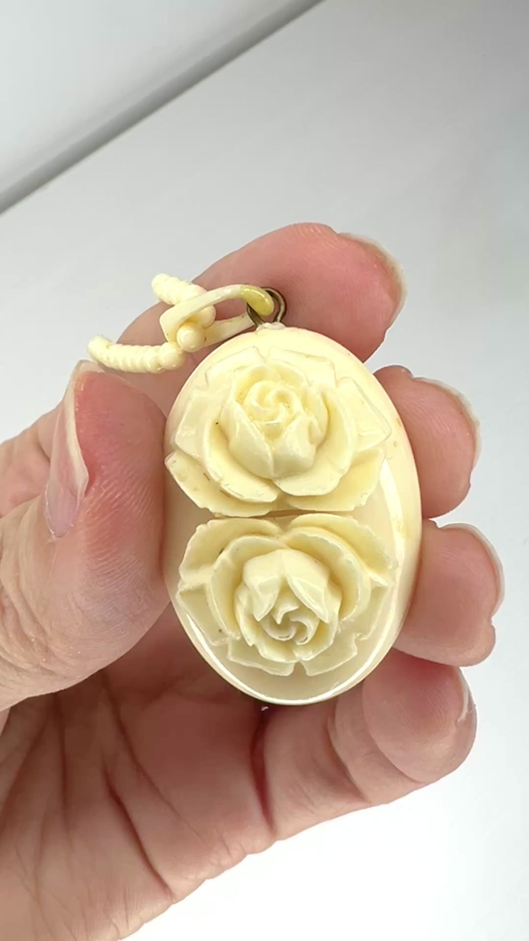 アイボリーカラーのプラスチックでバラの花が象られたペンダントがついた。