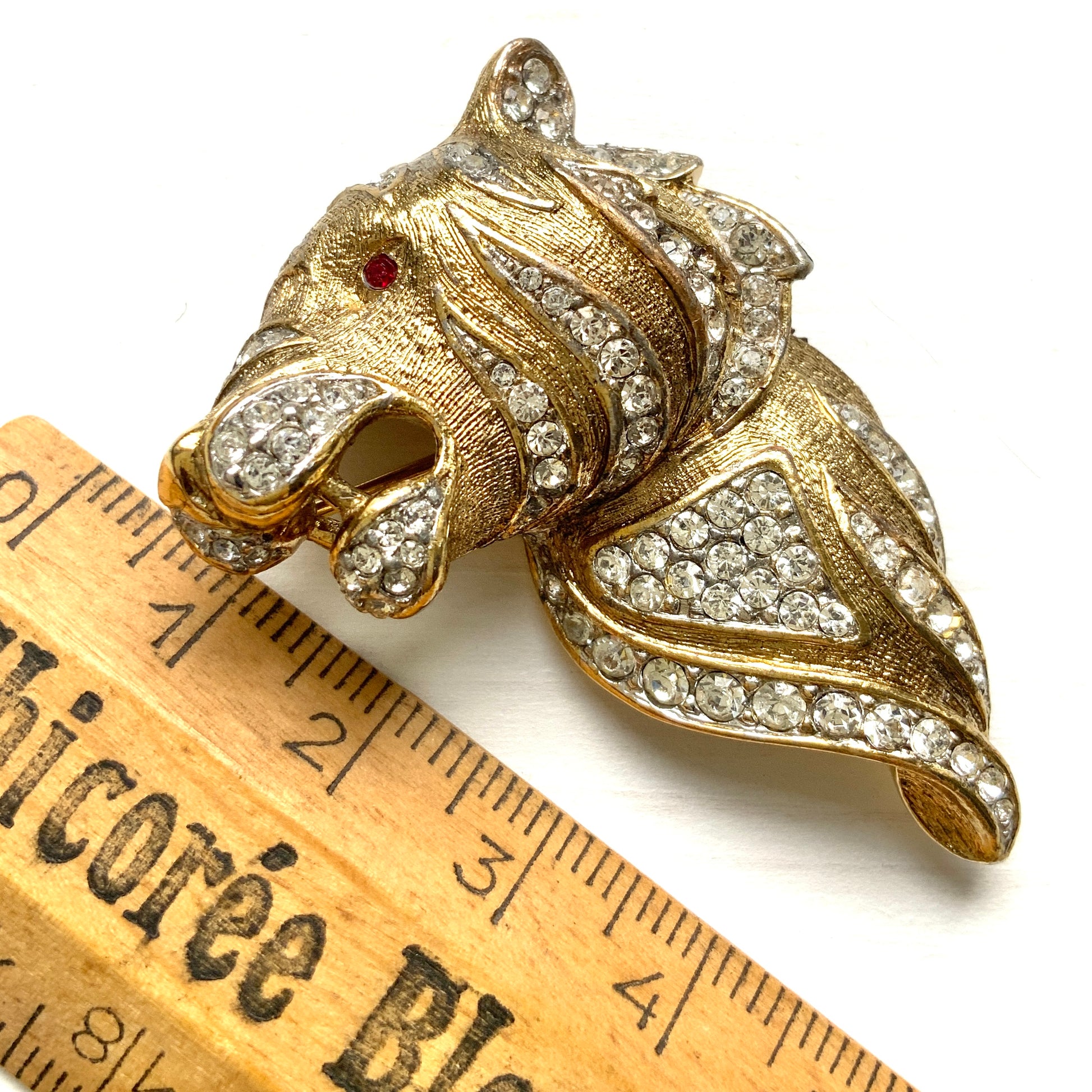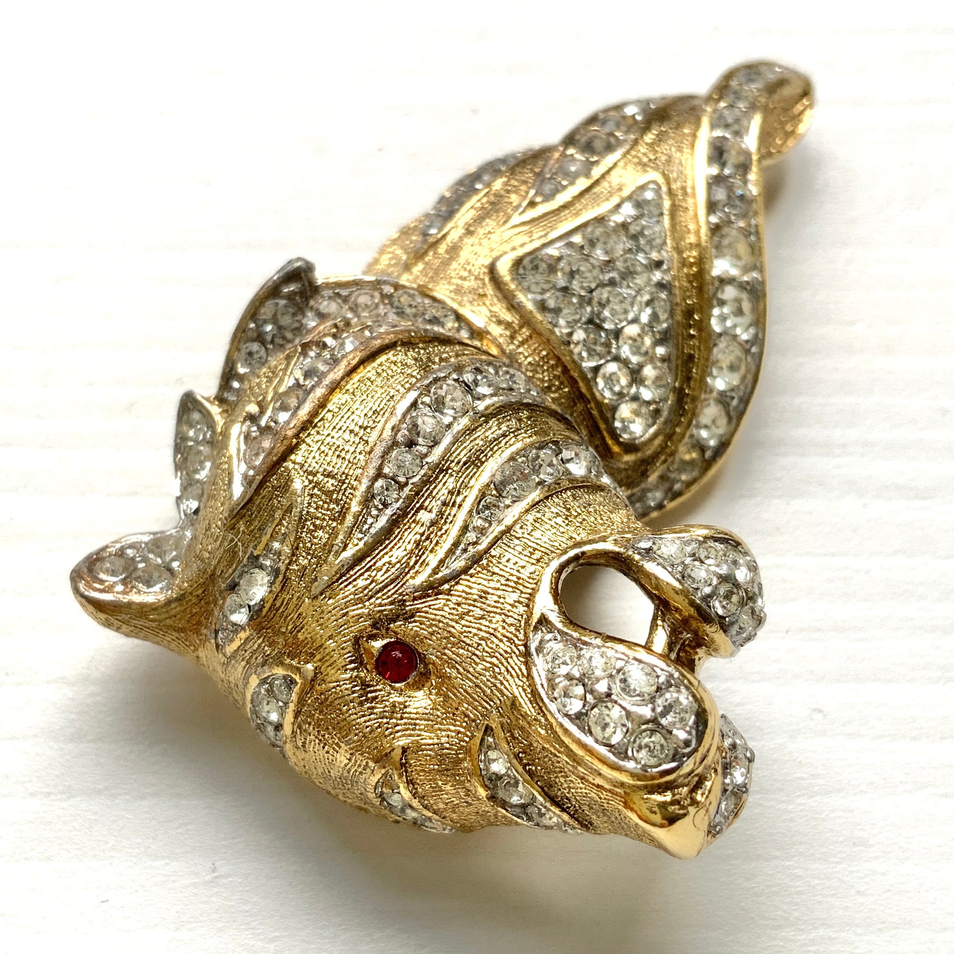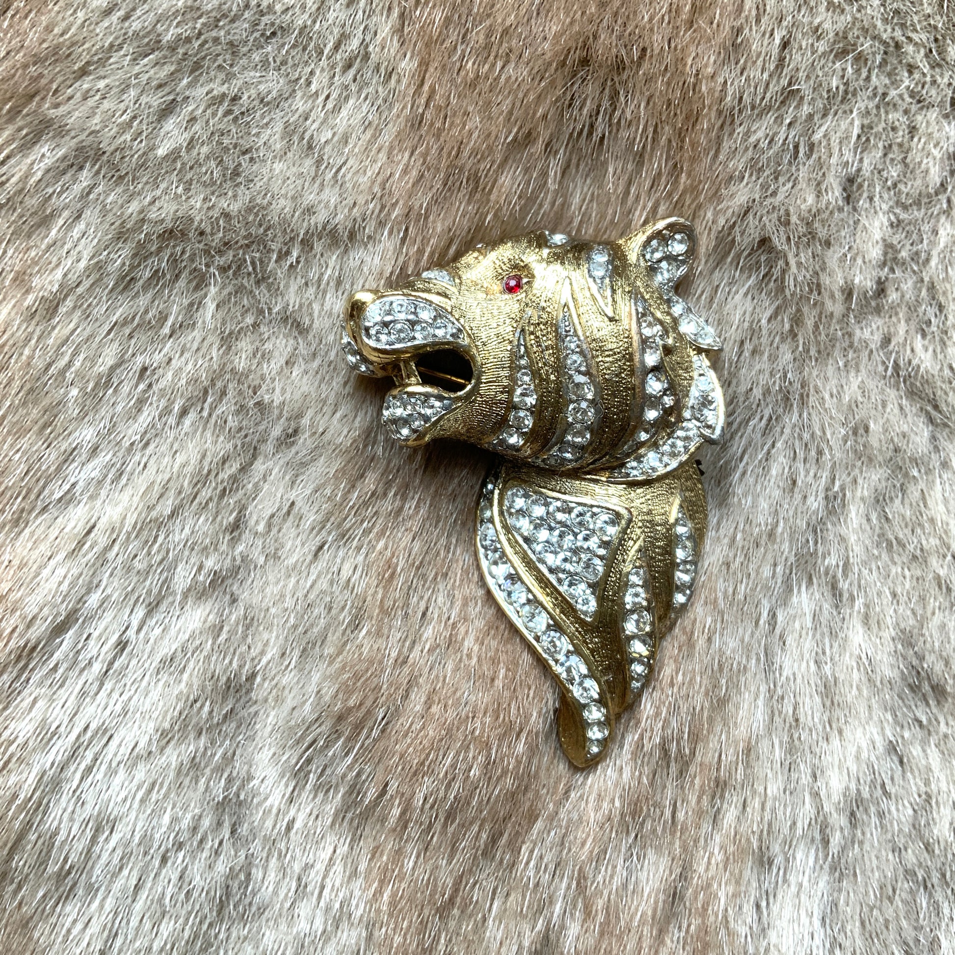 ラインストーンのストライプが入ったゴールドトーンの虎のブローチ。