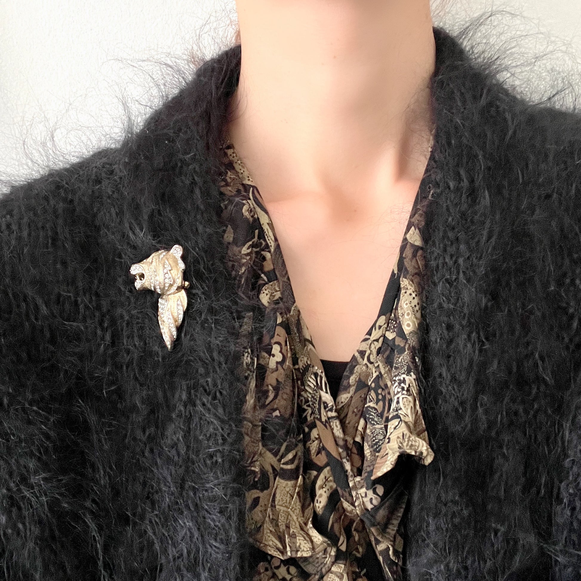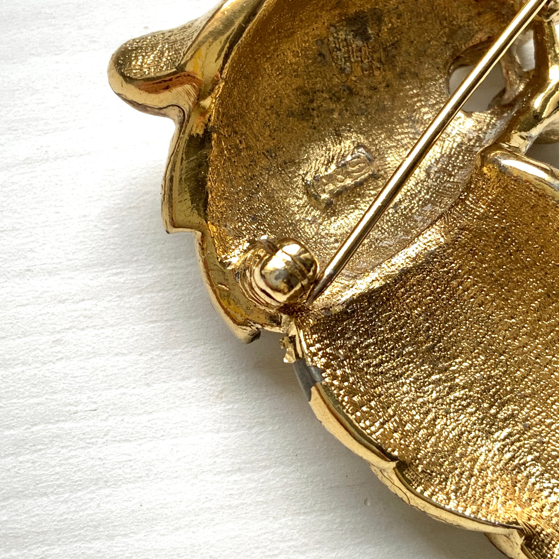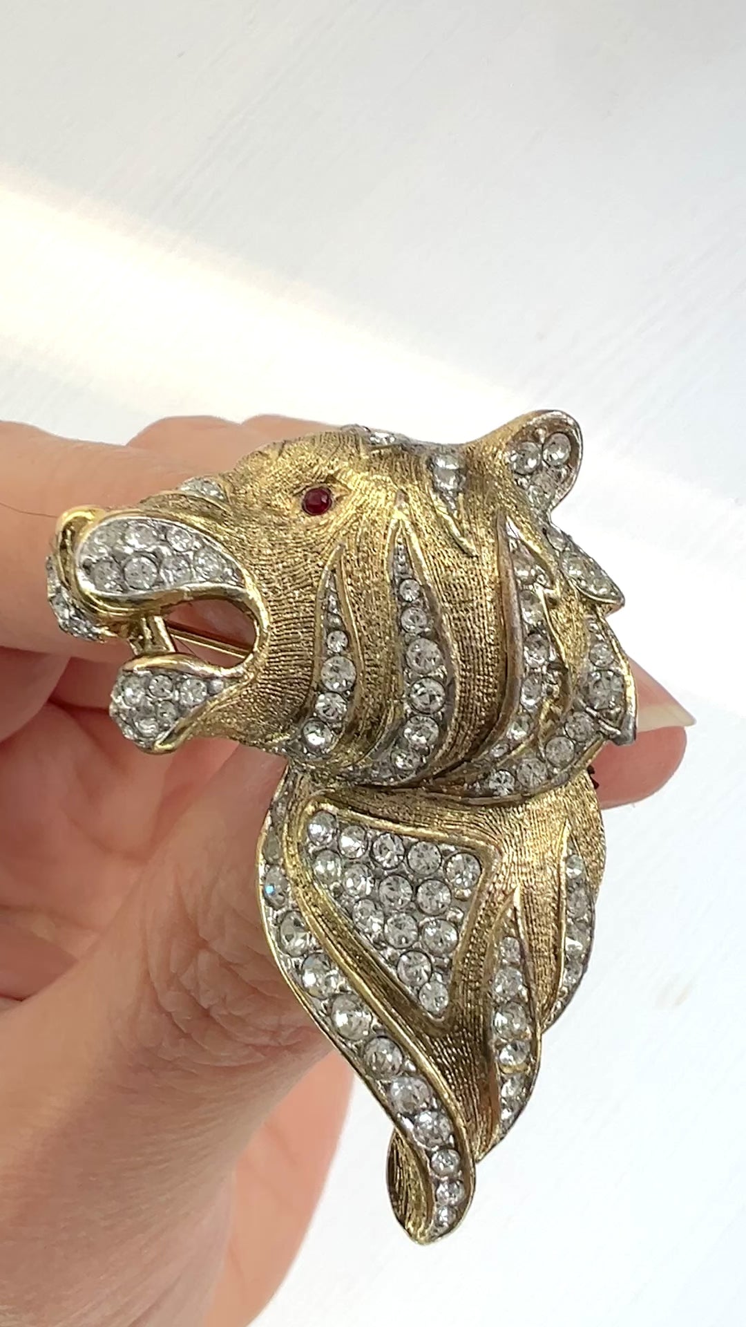 ラインストーンのストライプが入ったゴールドトーンの虎のブローチ。