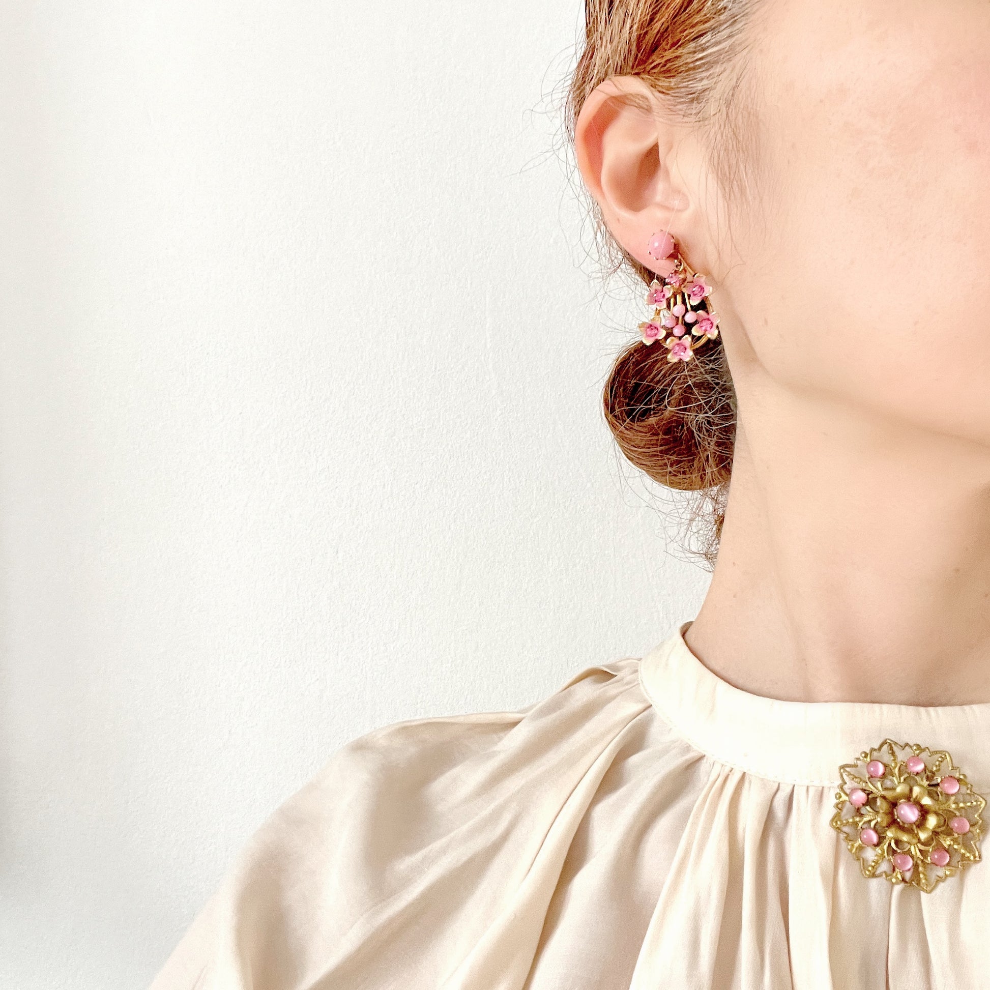 エナメル のお花にはピンクのラインストーン、トップとリース中央にはパステルピンクのグラスがあしらわれて、春らしいかわいいイヤリングです。