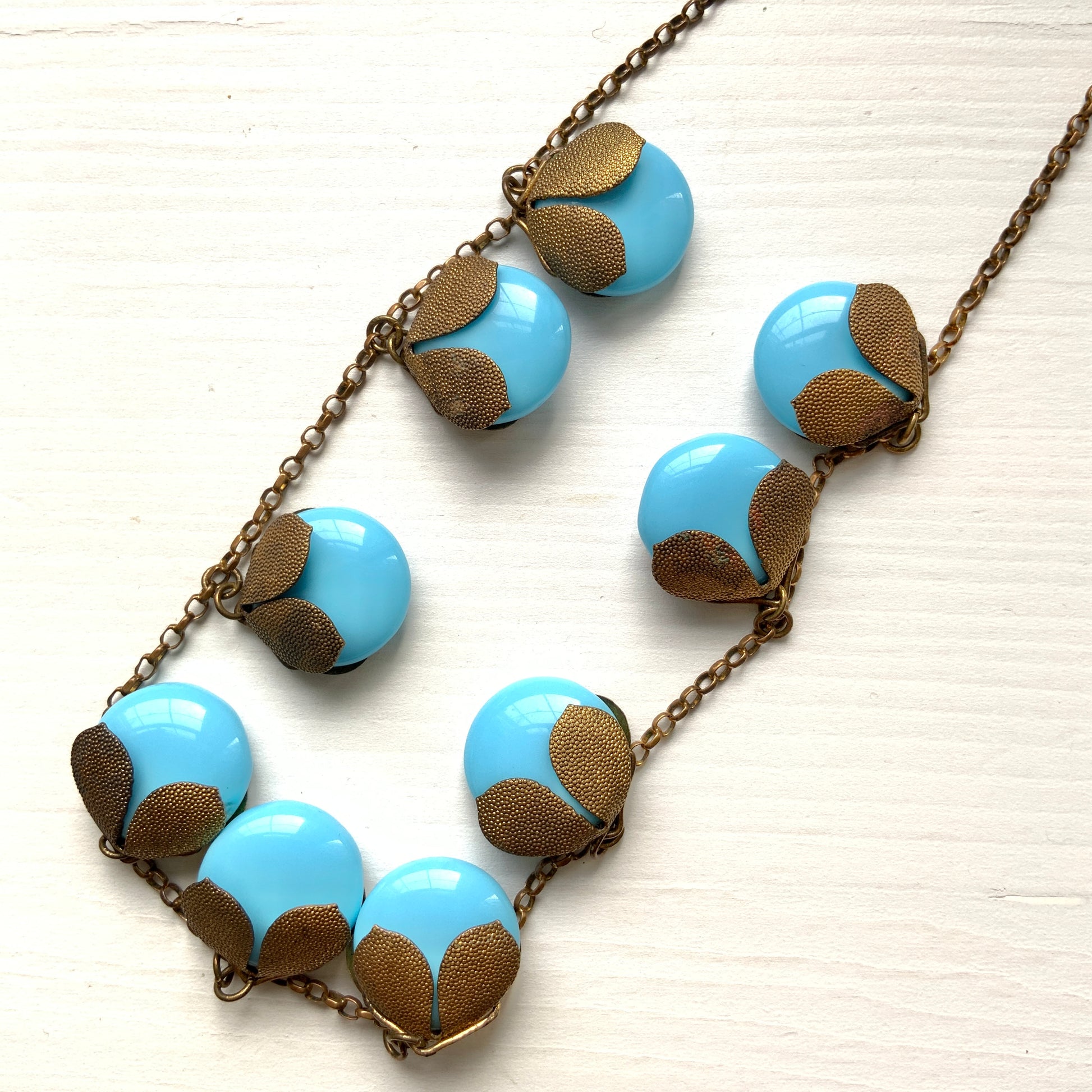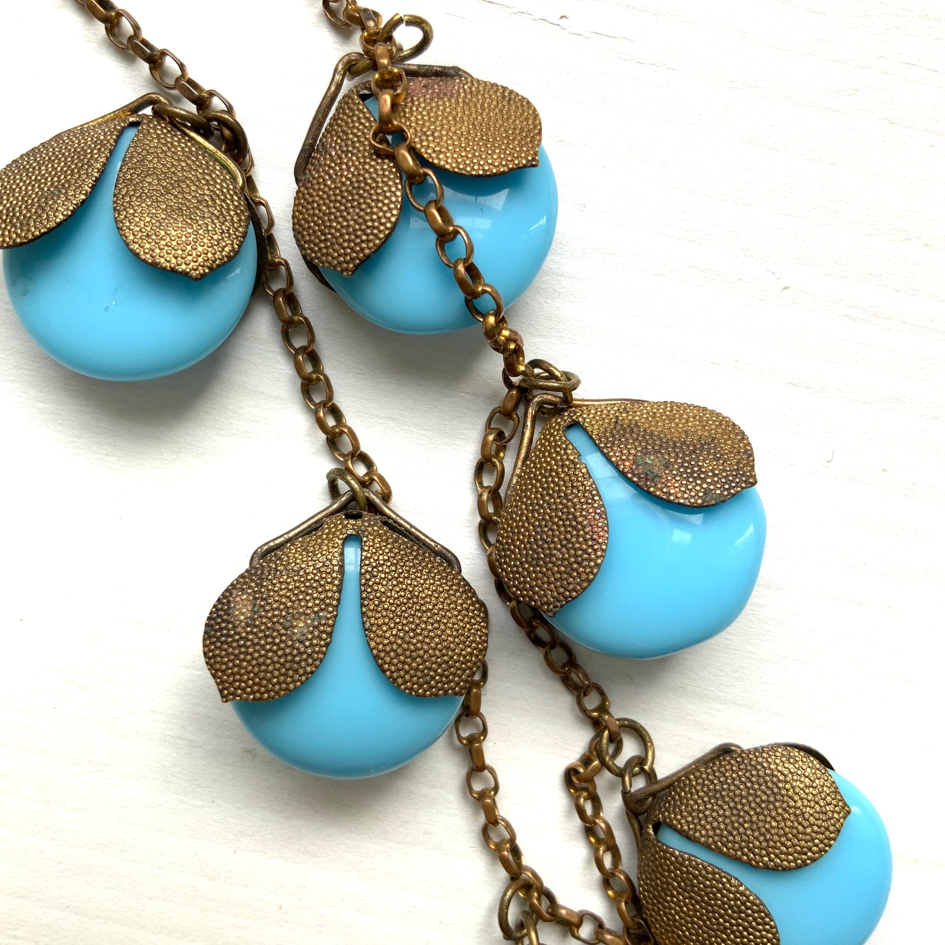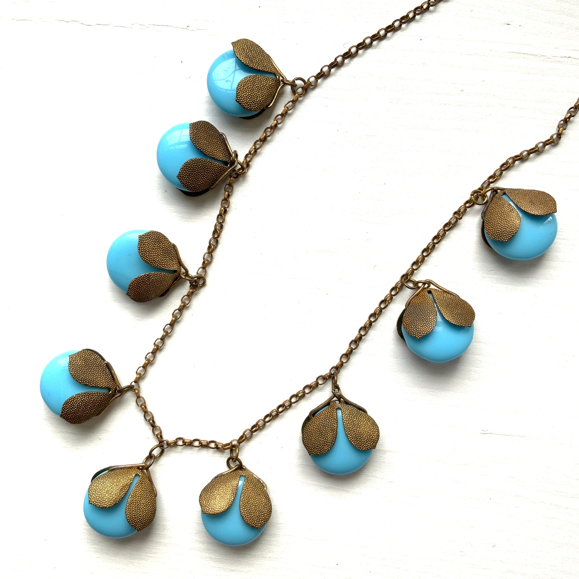 ヴィンテージ アールデコ ターコイズ フラット ラウンド ガラス & ゴールド トーン リーフ ネックレス