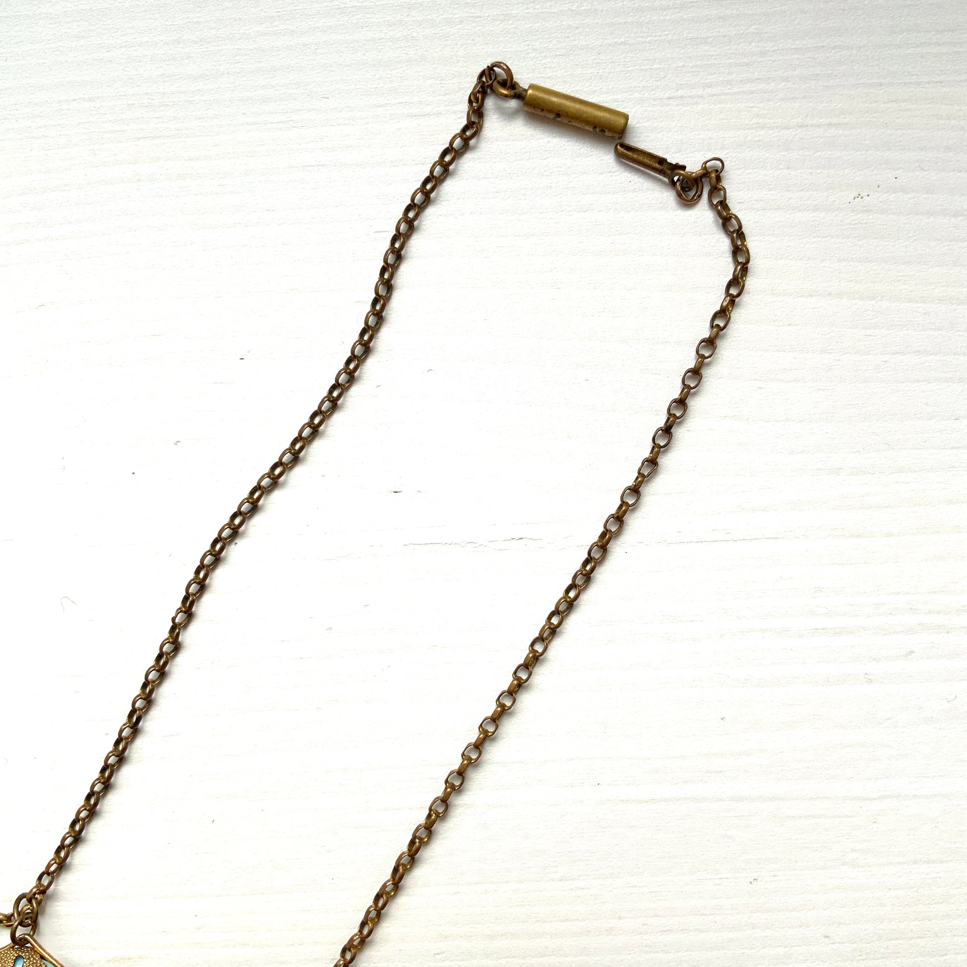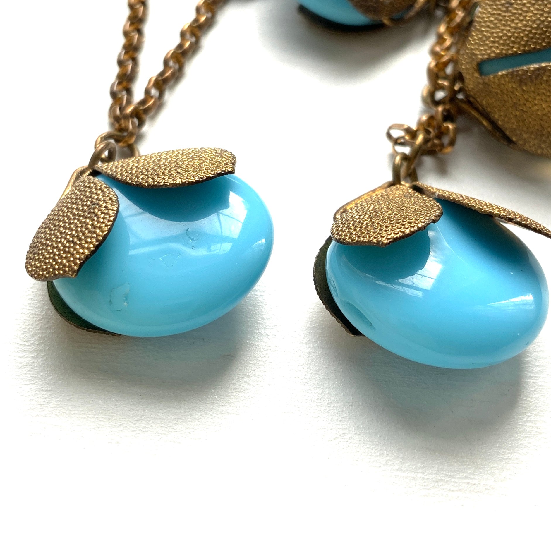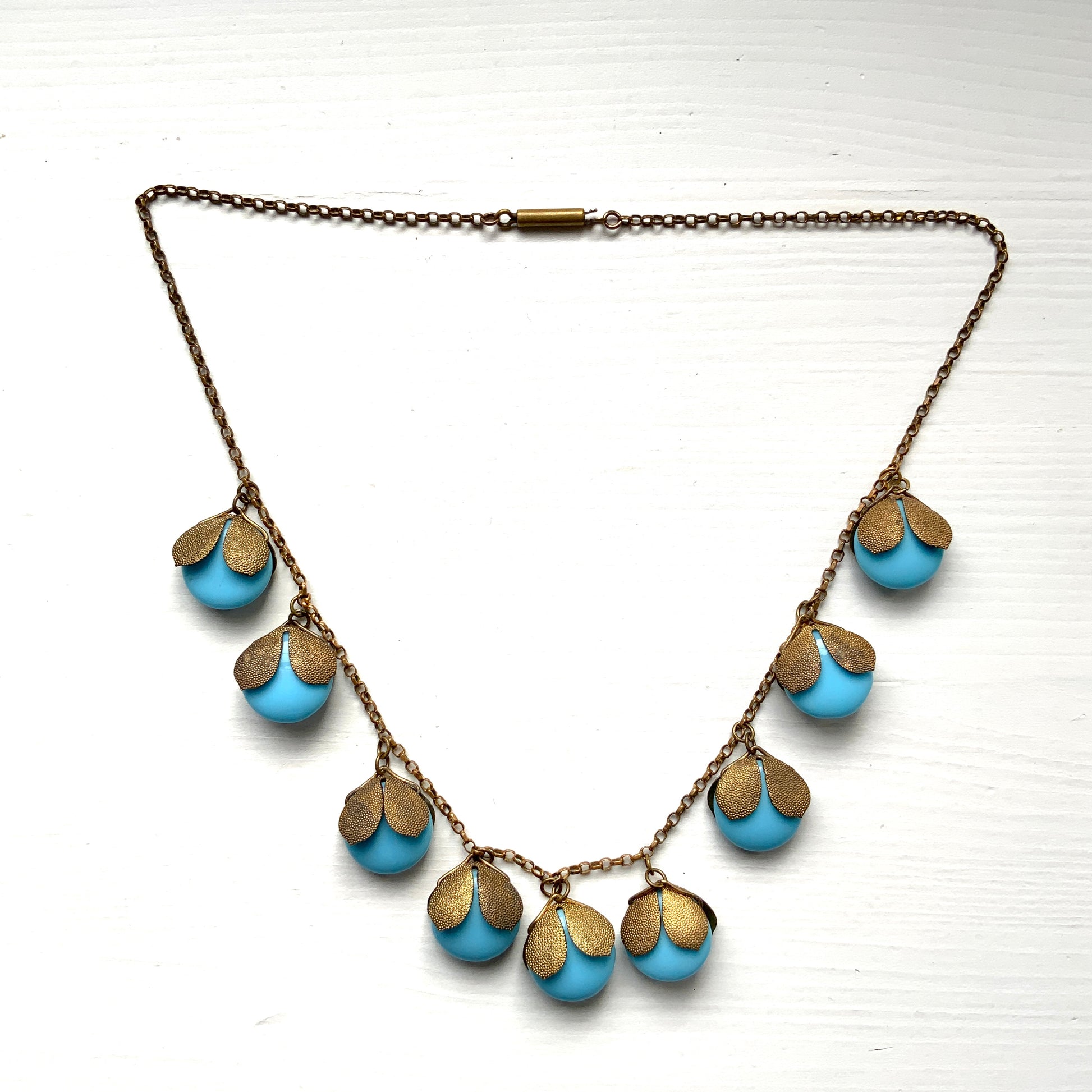 ヴィンテージ アールデコ ターコイズ フラット ラウンド ガラス & ゴールド トーン リーフ ネックレス