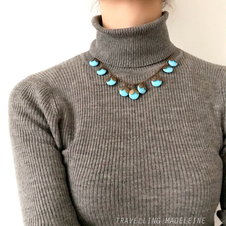 つるつるのターコイズブルーのおはじき型グラスに、メタルリーフがついたネックレス。