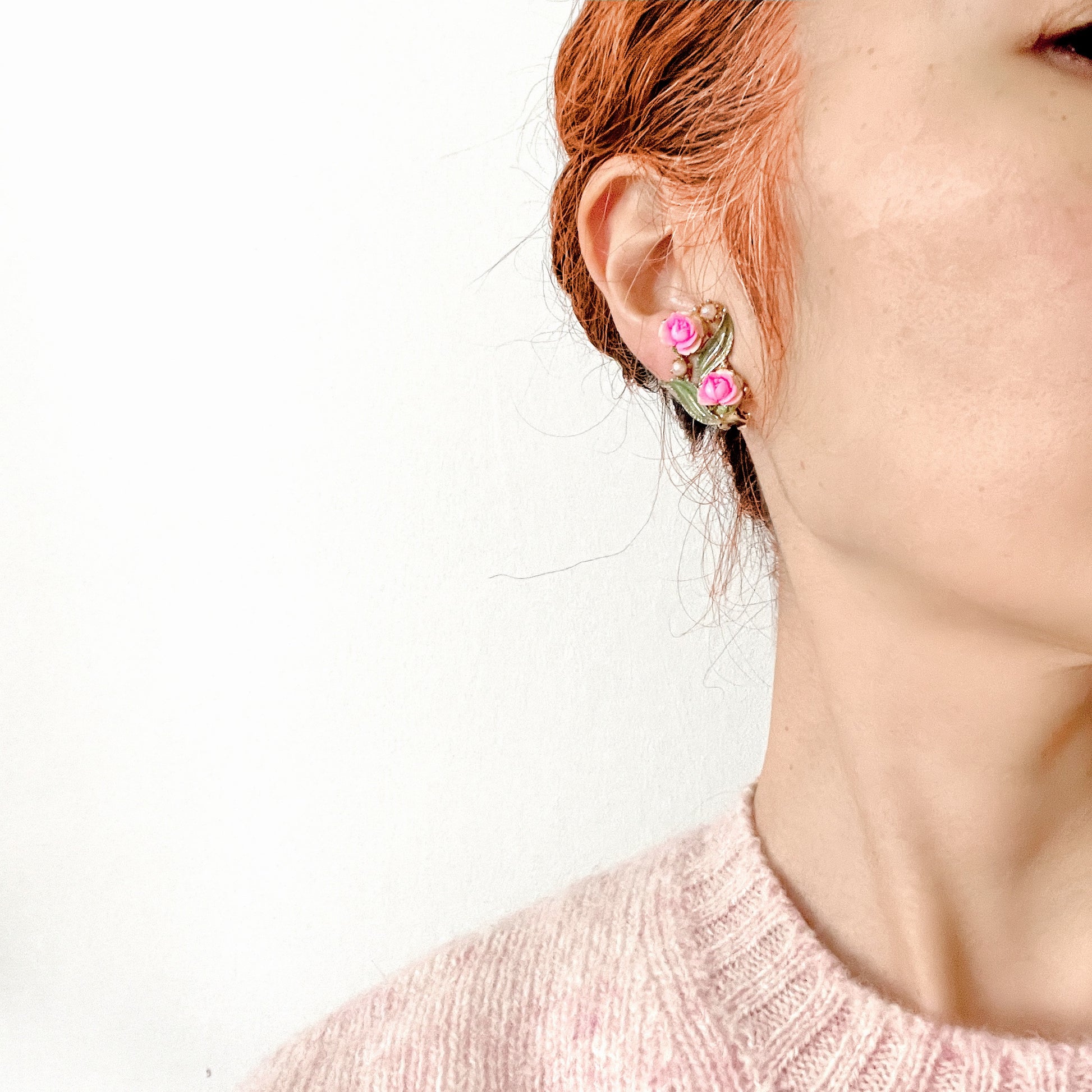 パープルなプラスチックのピンクローズとフォーパールのクリップイヤリング。