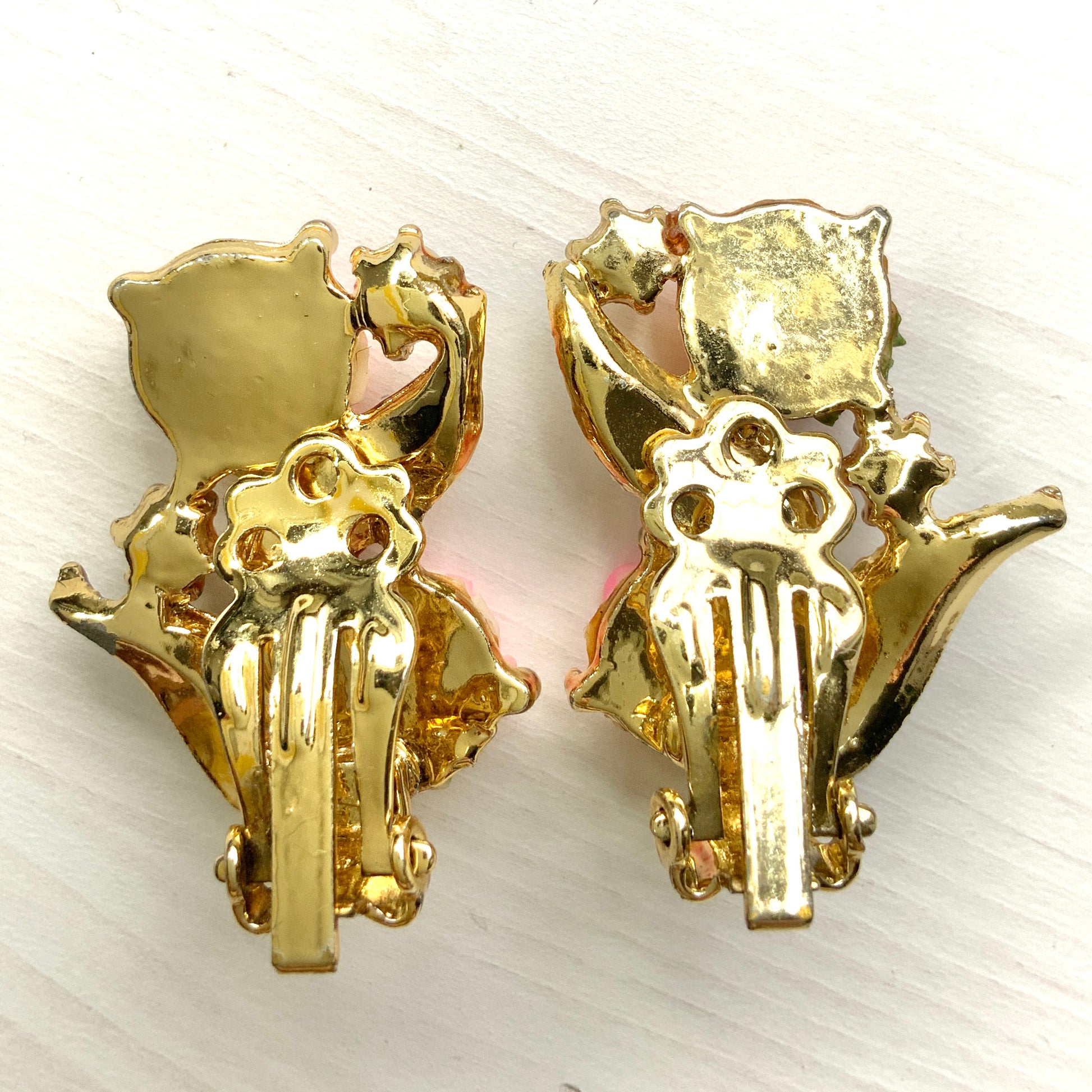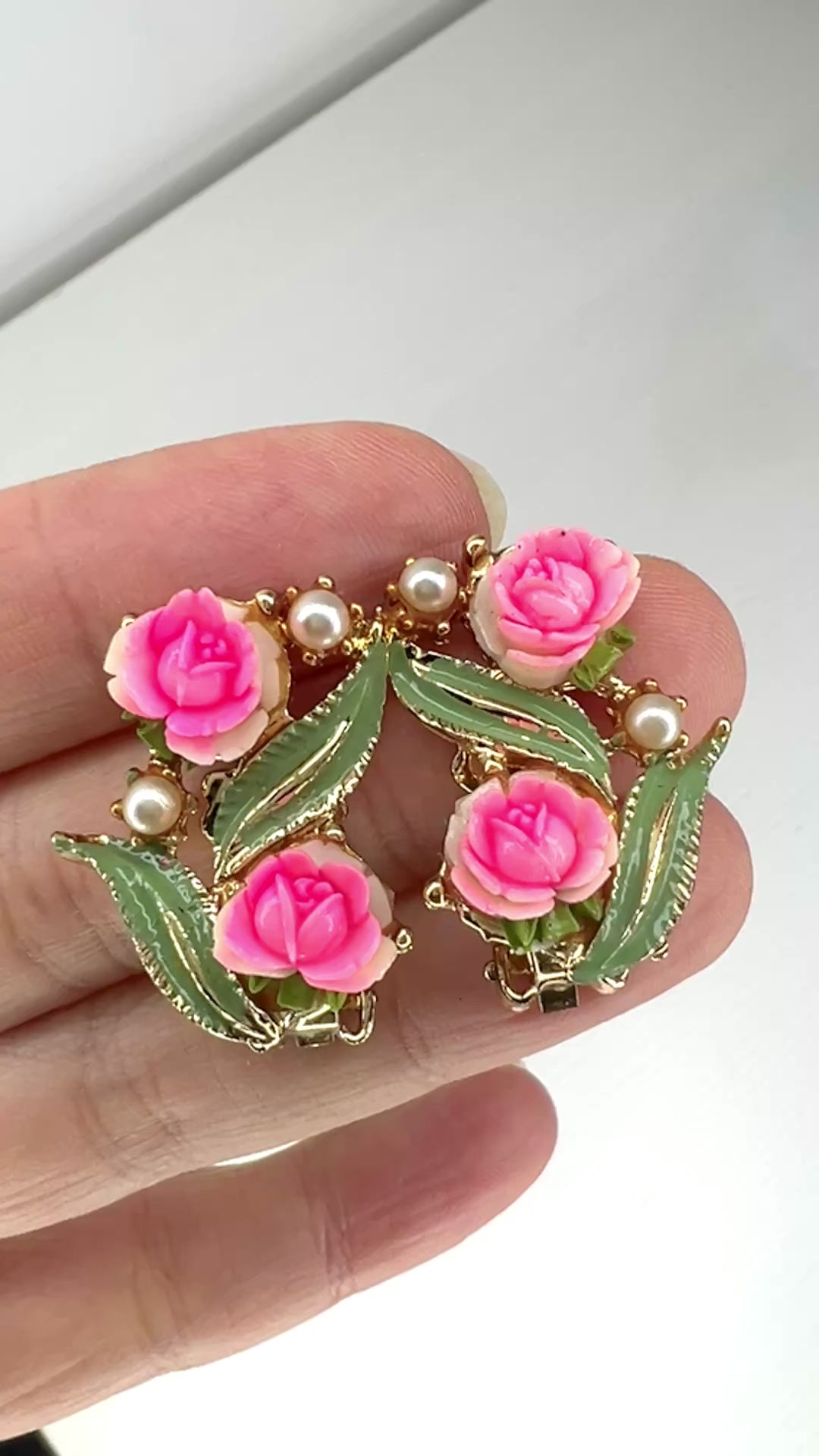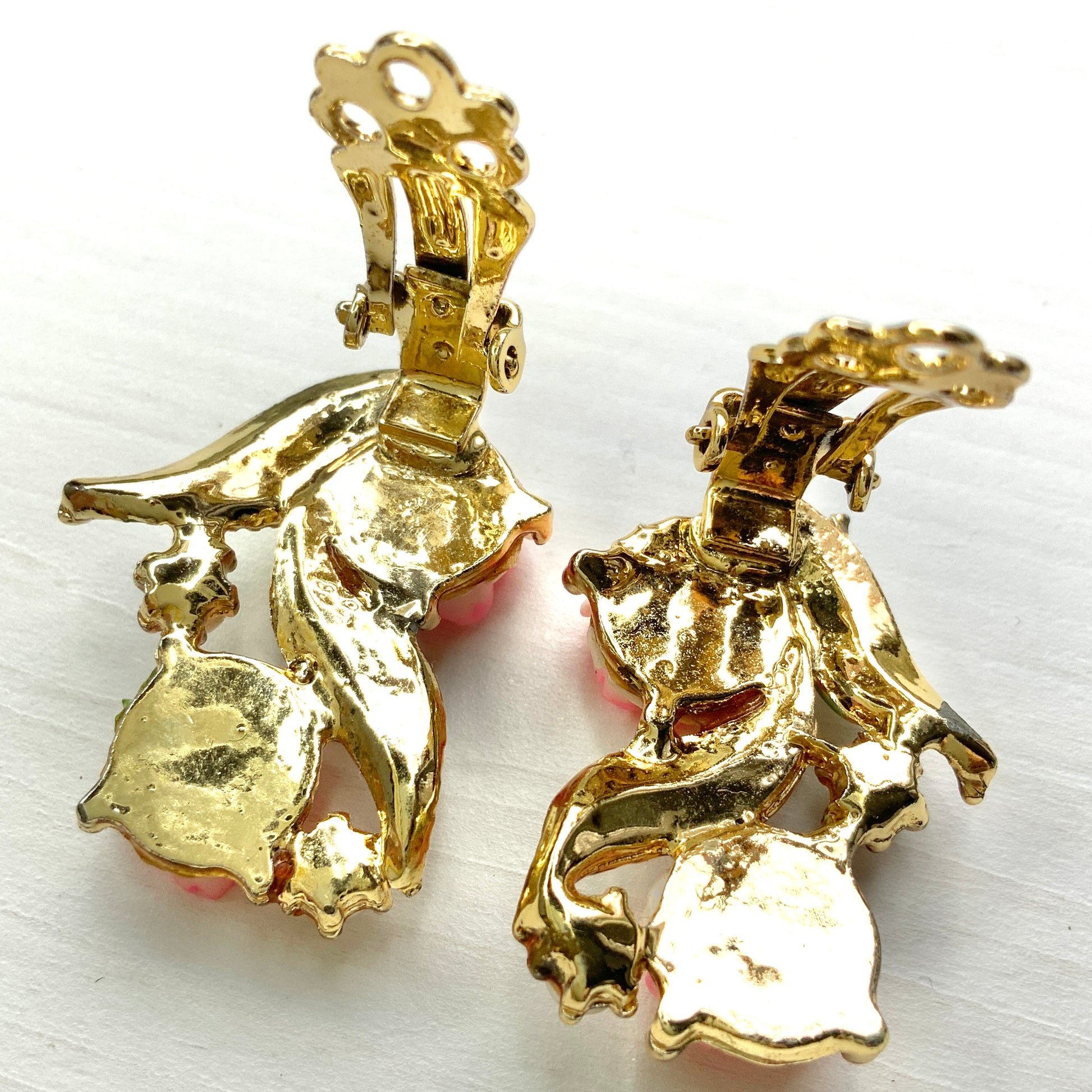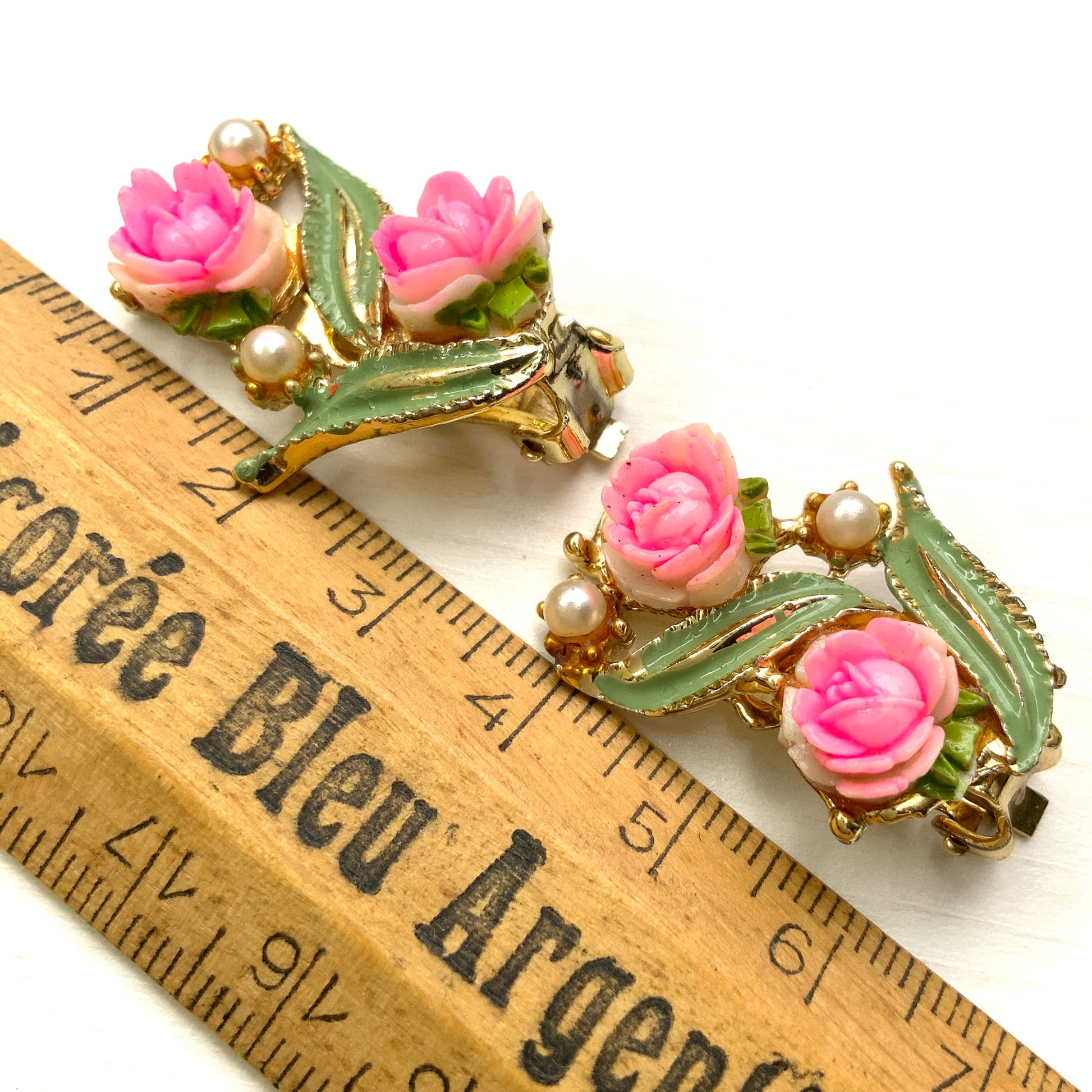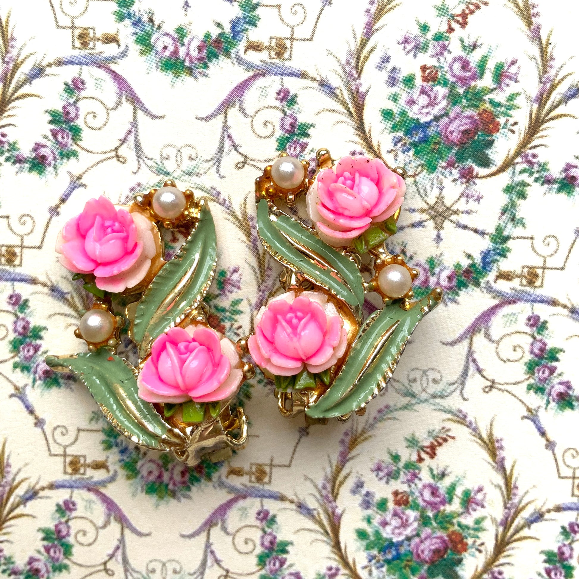 ヴィンテージ ピンク プラスチック ローズ&パール クリップイヤリング