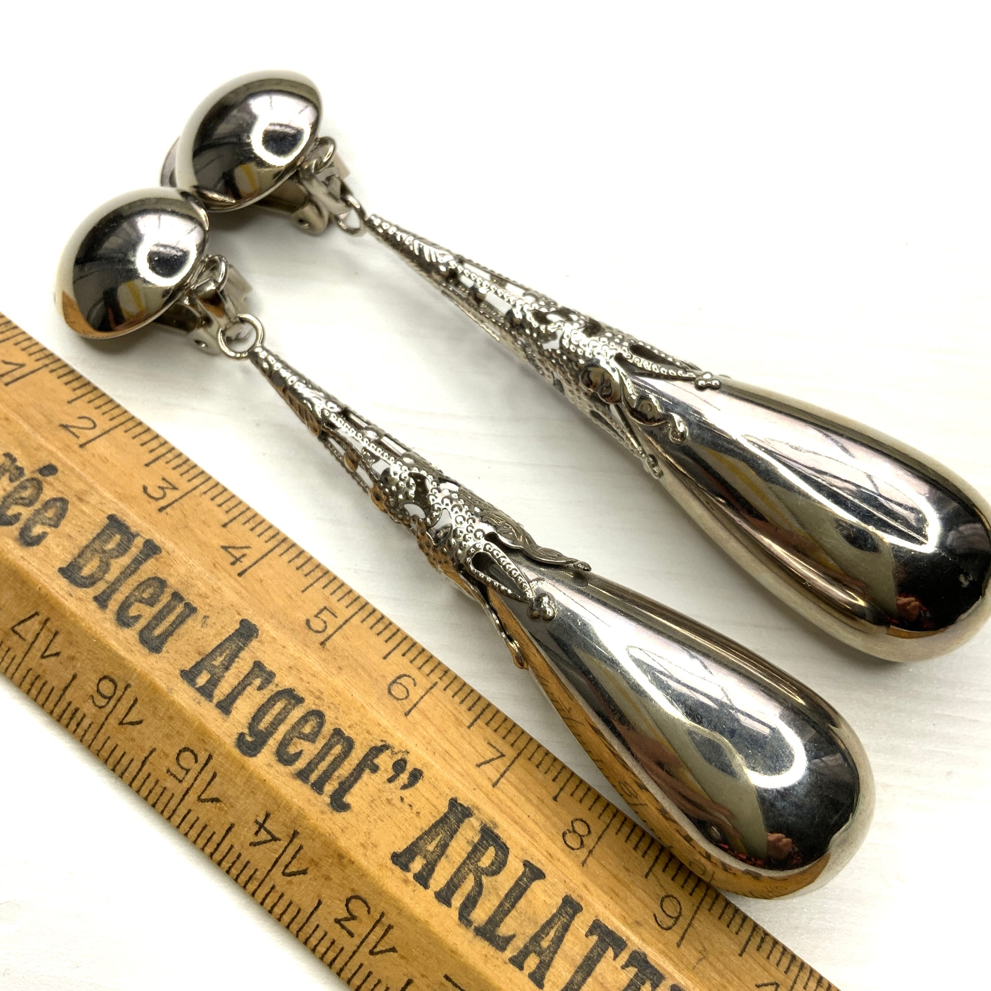 光沢のある大きなシルバートーンのレインドロップが揺れるクリップイヤリング。