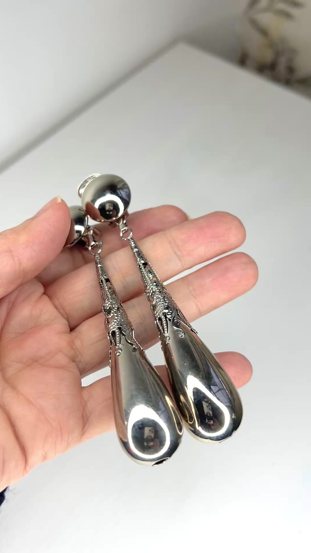 光沢のあるシルバートーンの大きな雨粒が付いたクリップイヤリング。