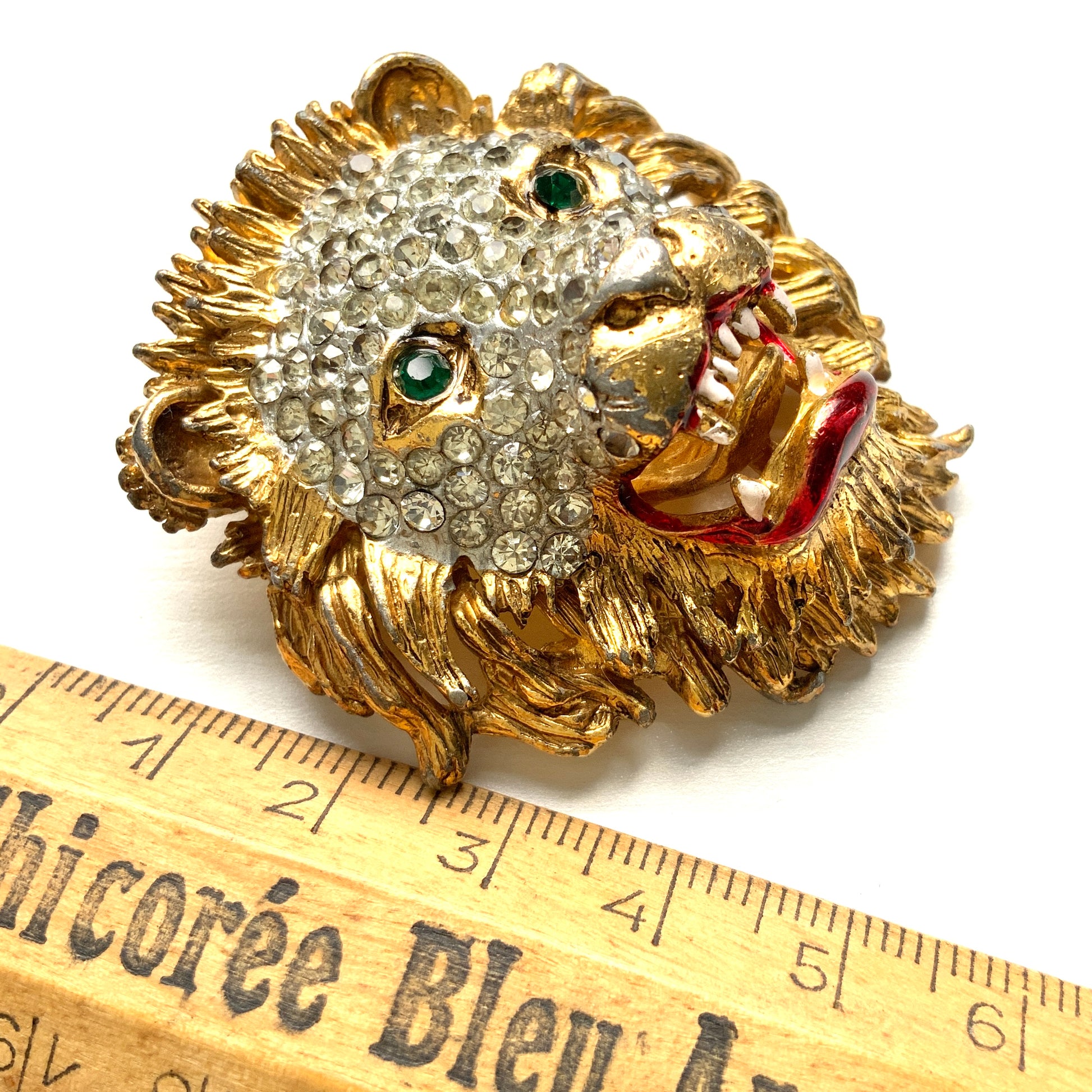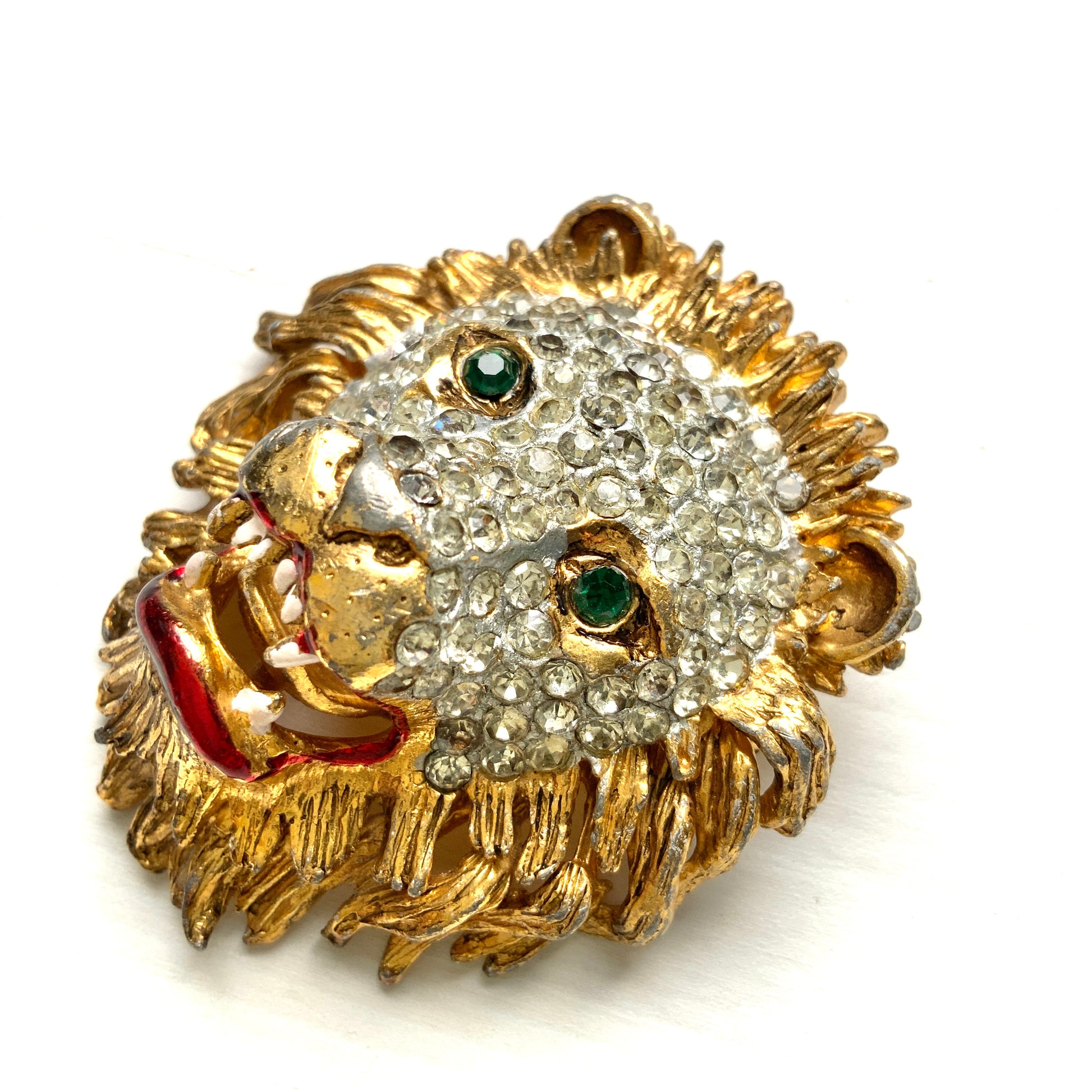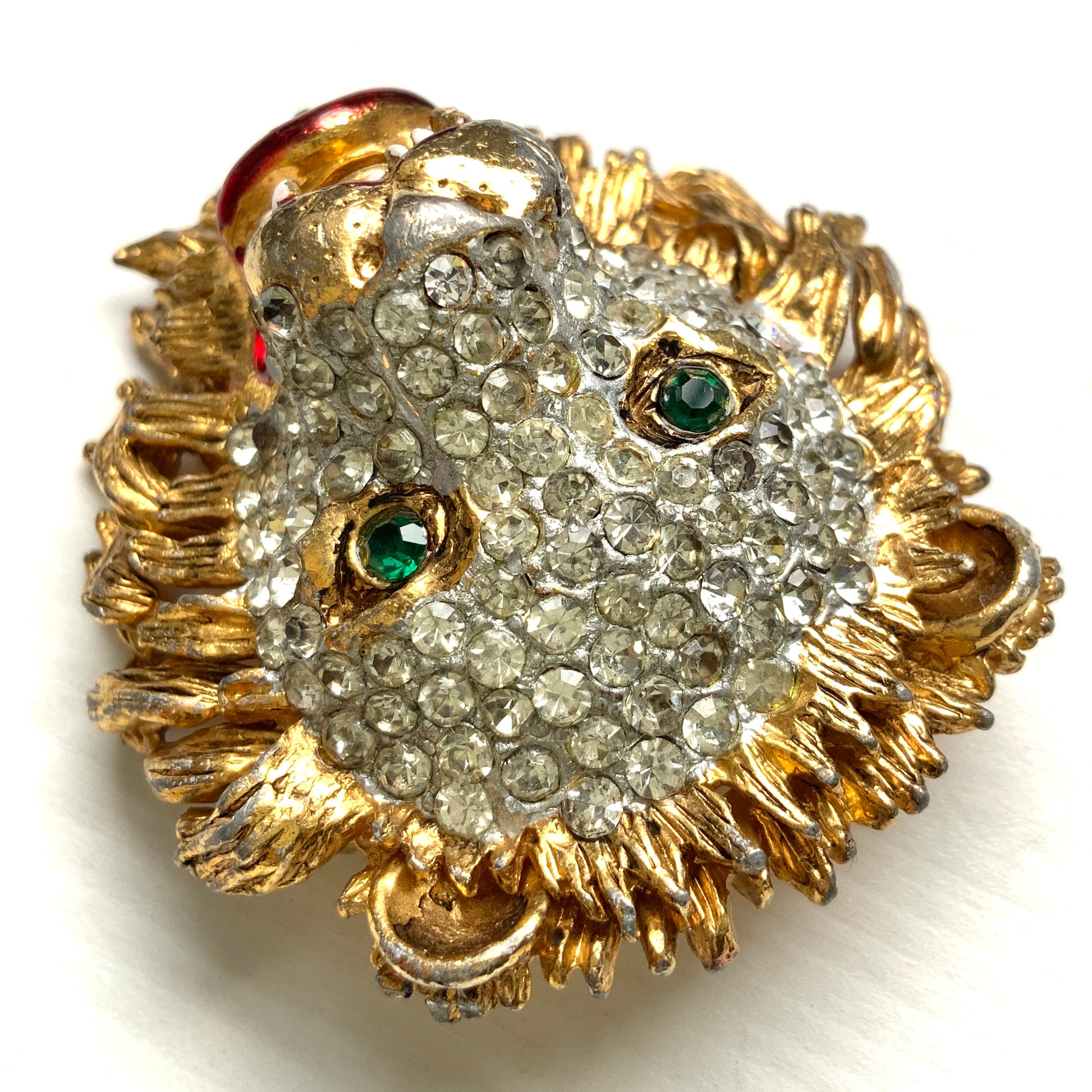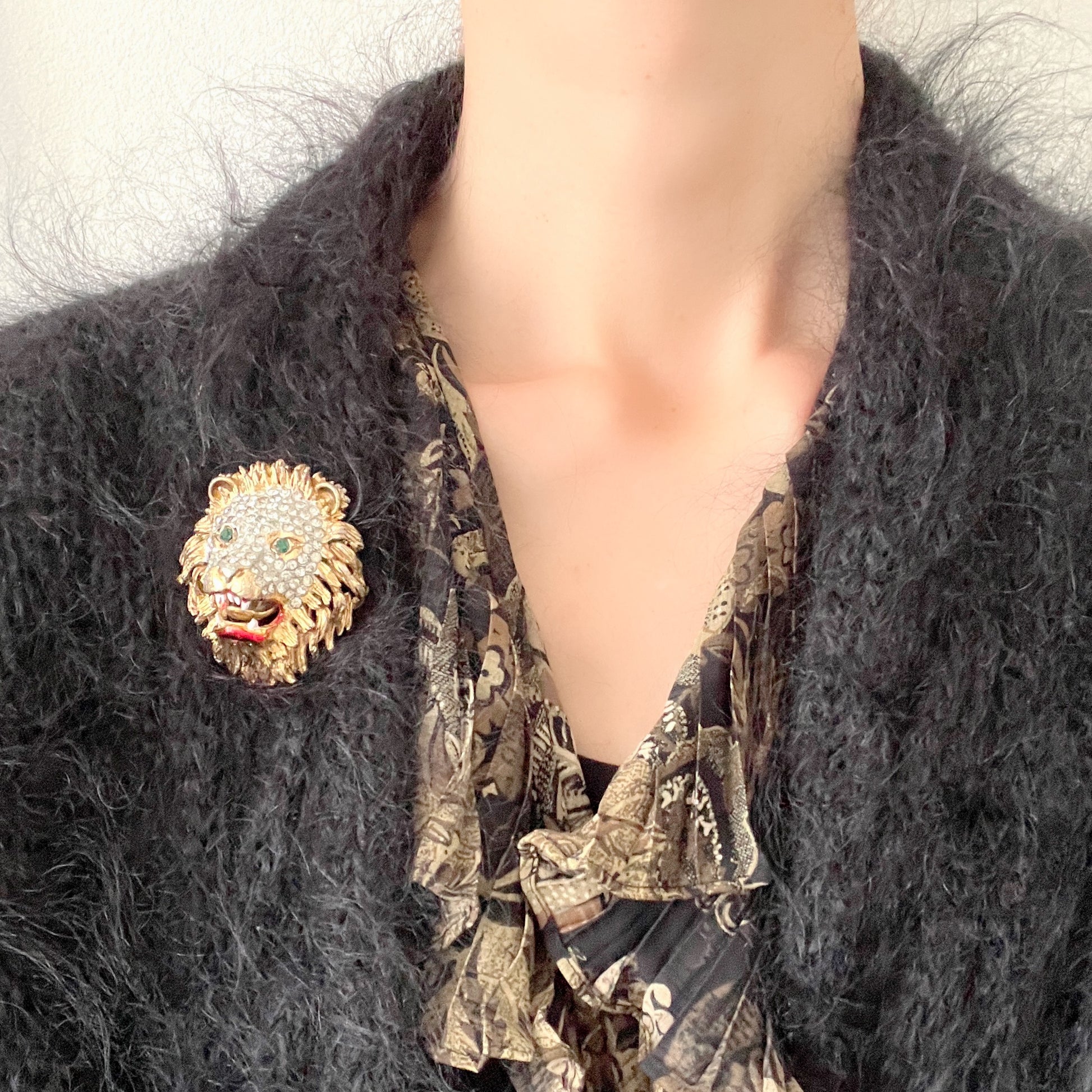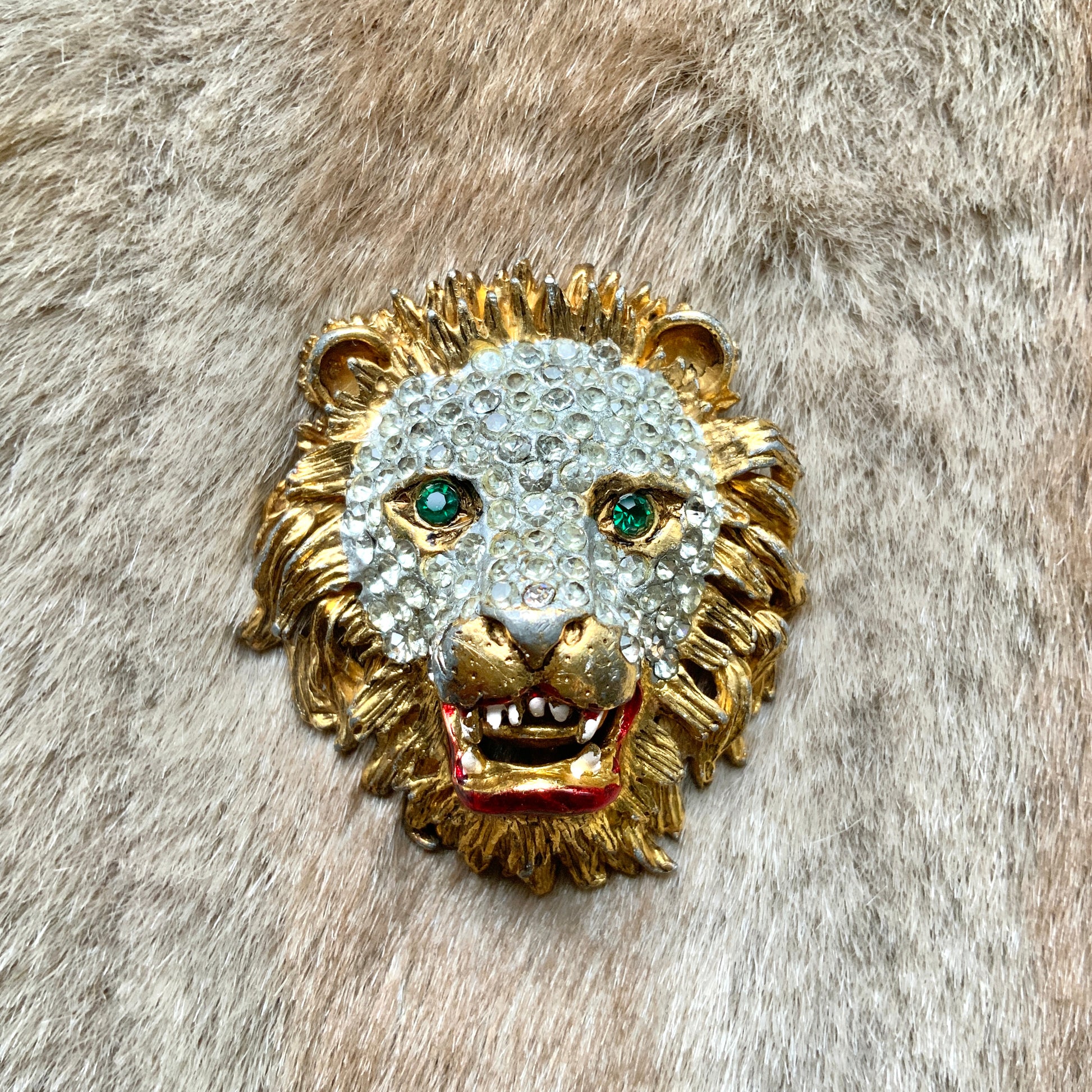 顔にラインストーンが散りばめられたライオンヘッドのブローチ。