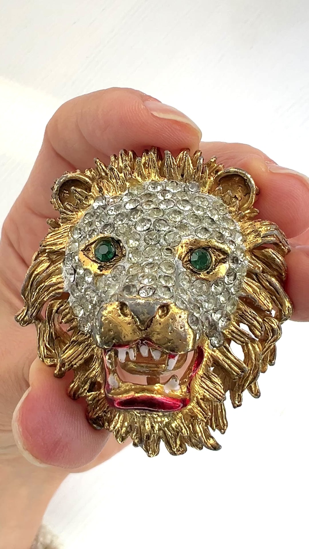 顔にラインストーンを散りばめたライオンの頭のブローチ。
