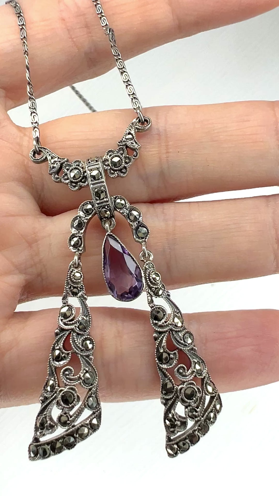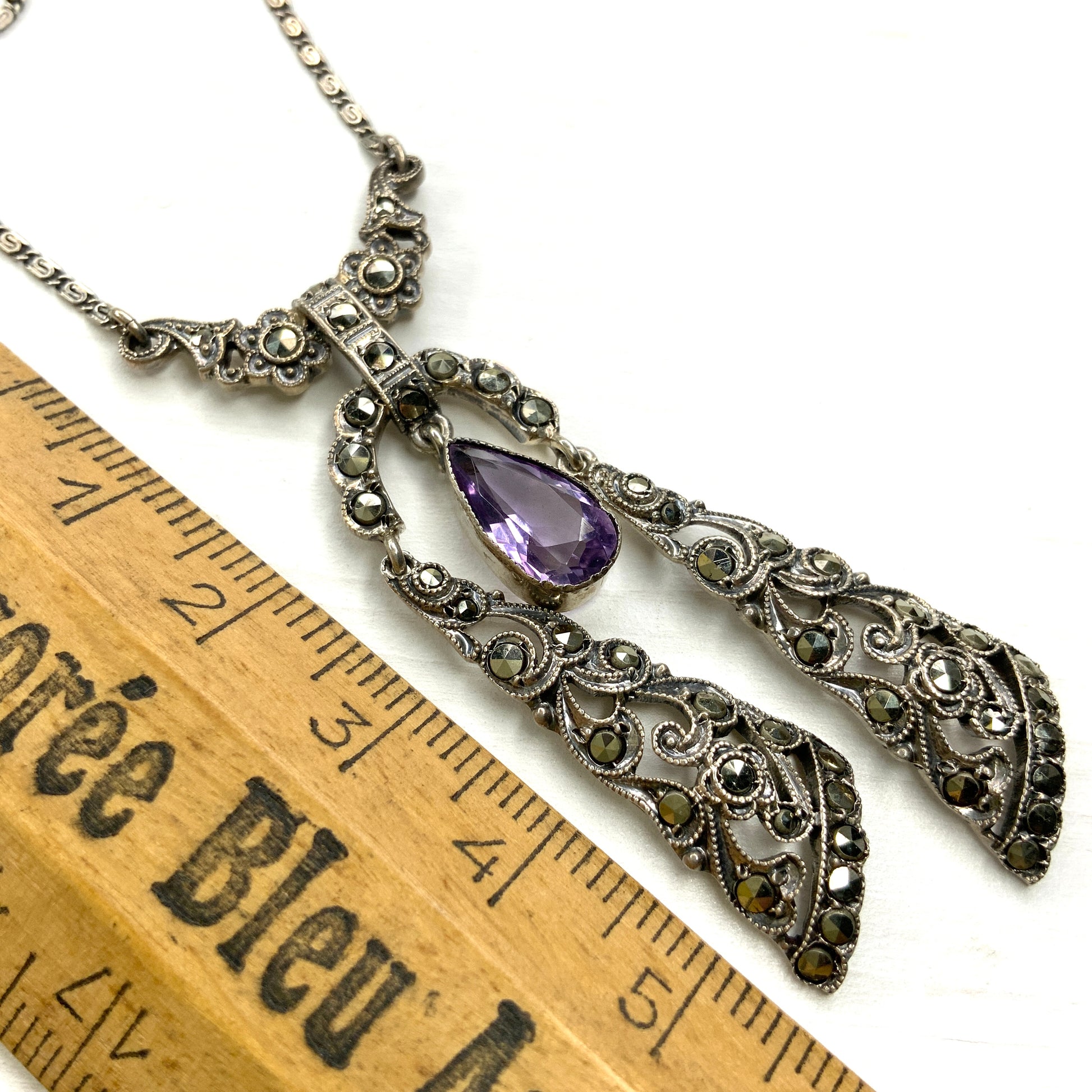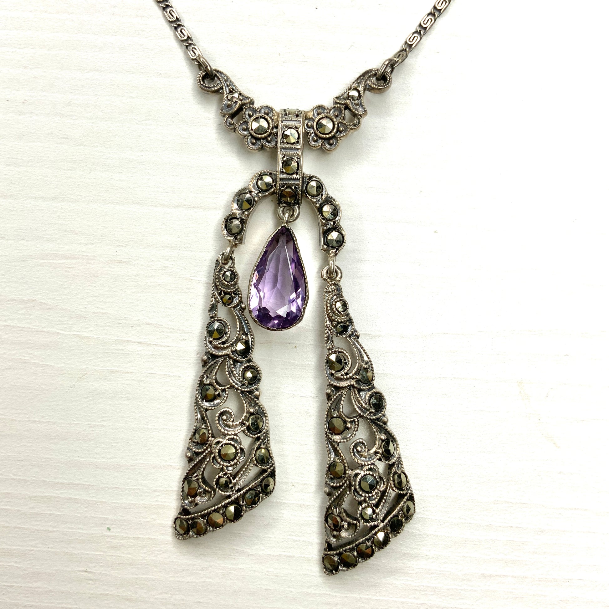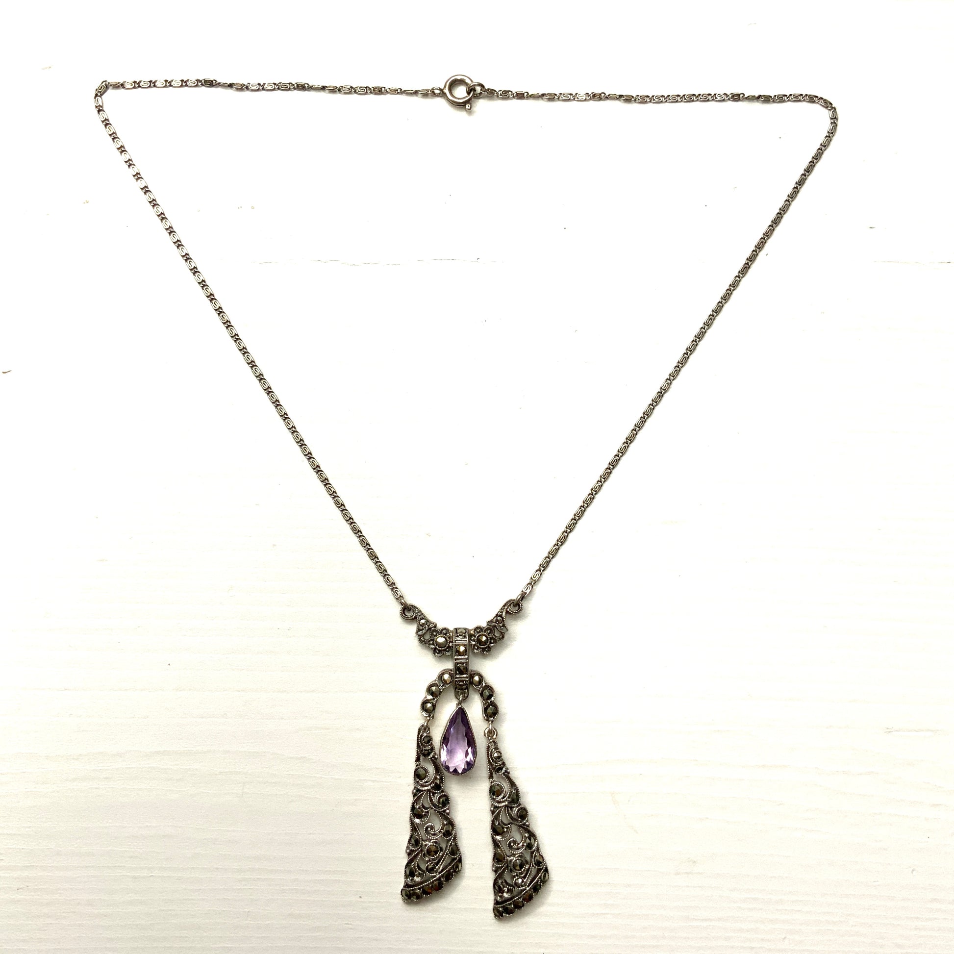 ヴィンテージ アールデコ アメジスト ティアドロップ & マーカサイト シルバー リボン ネグリジェ ネックレス
