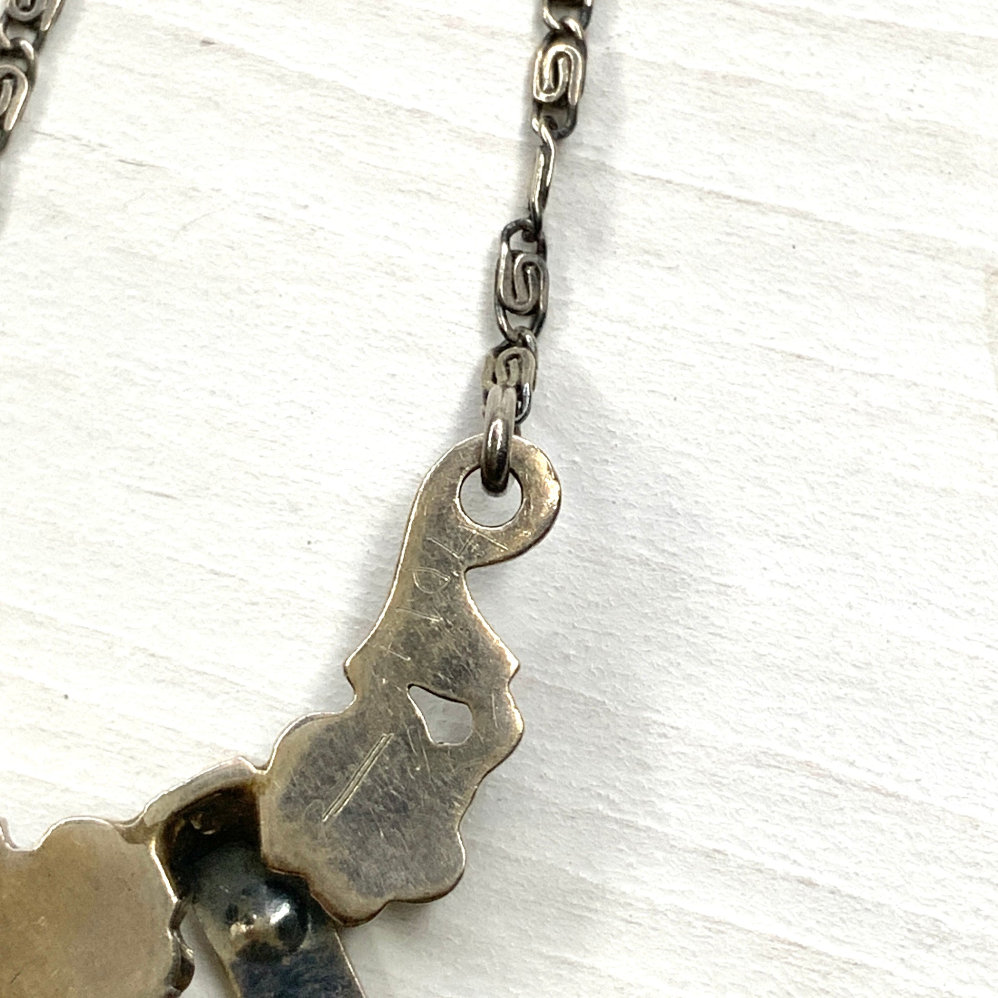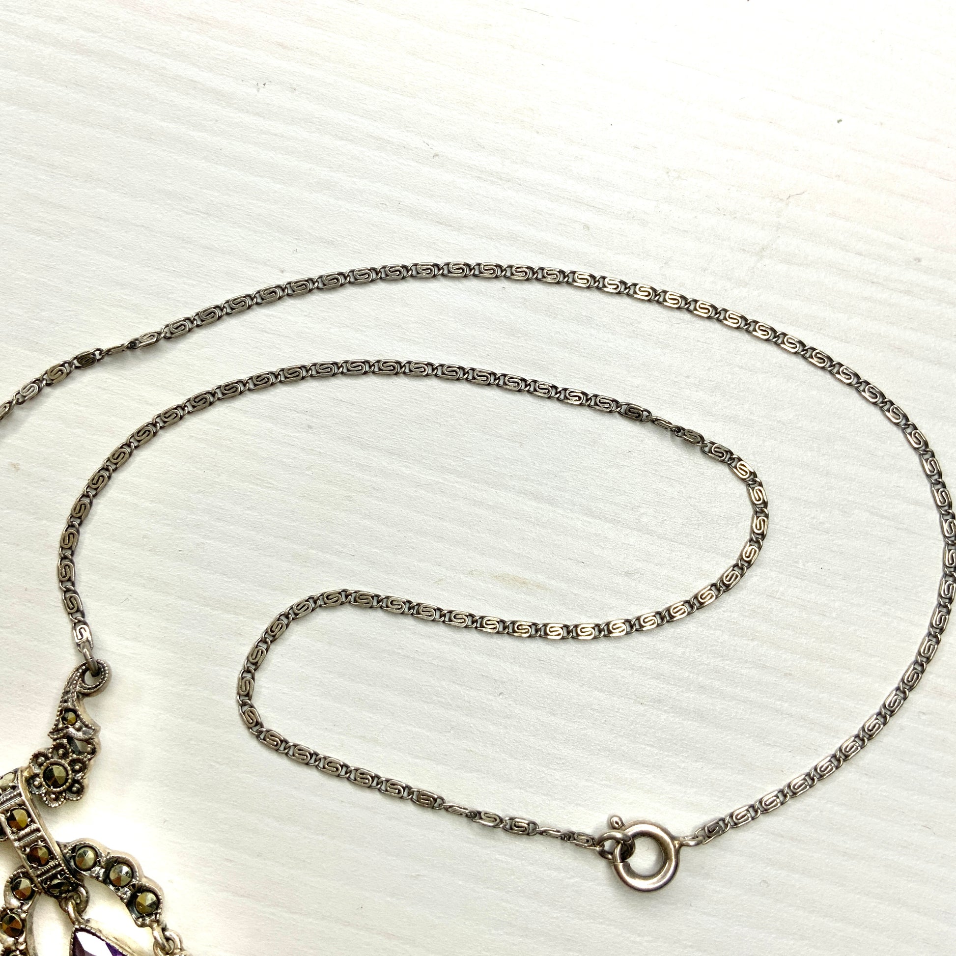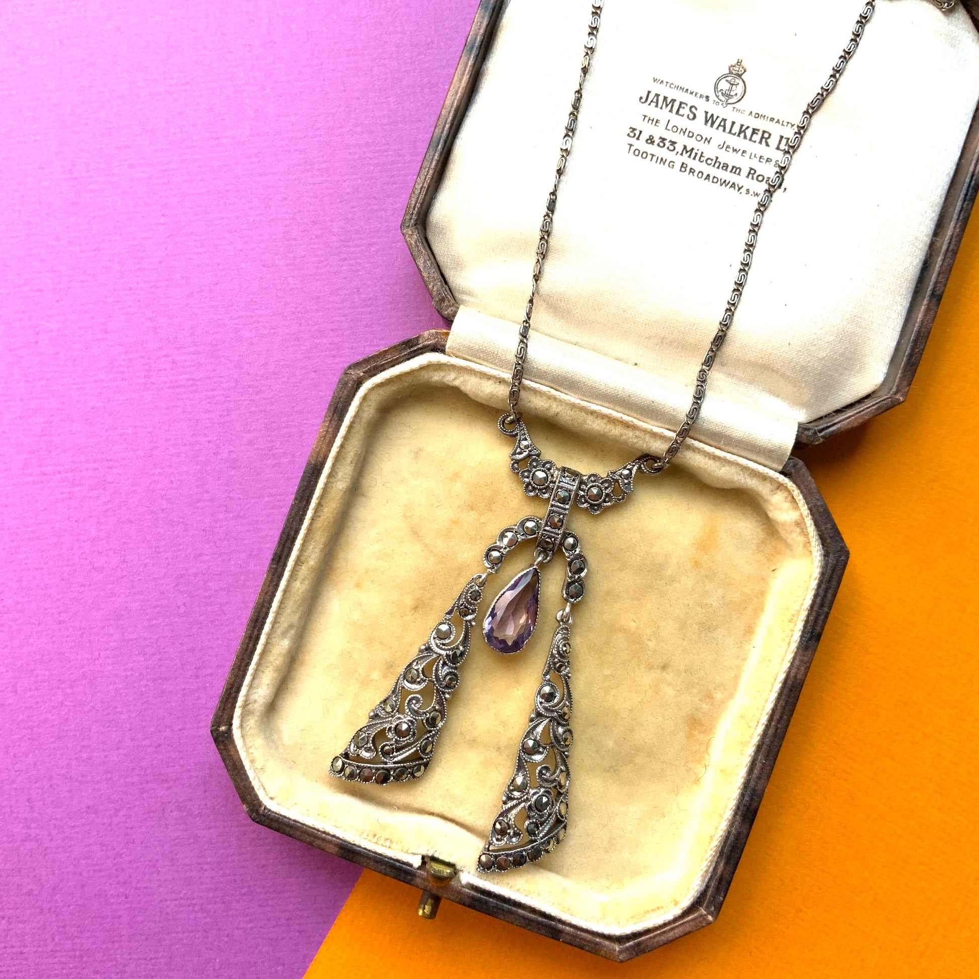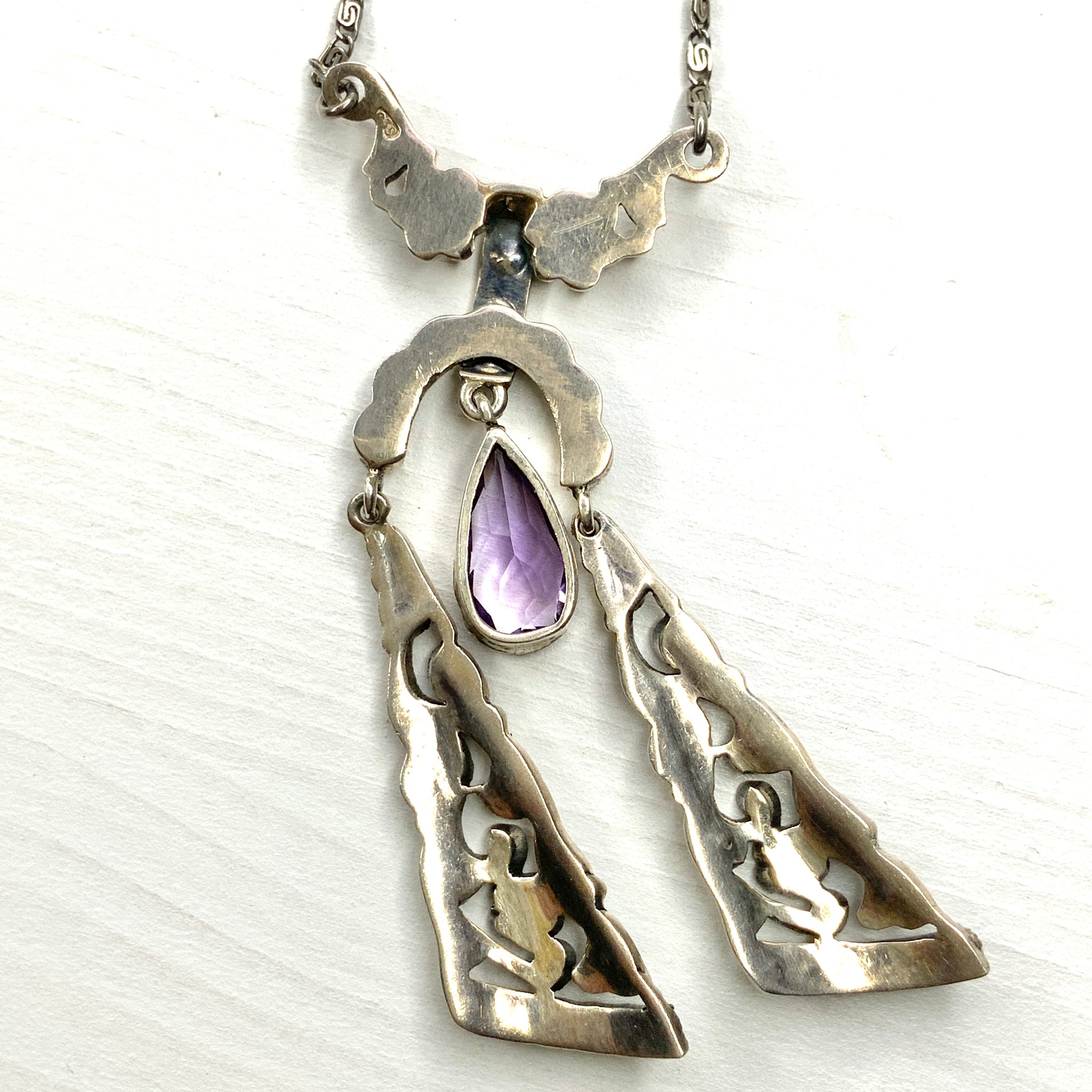 ヴィンテージ アールデコ アメジスト ティアドロップ & マーカサイト シルバー リボン ネグリジェ ネックレス