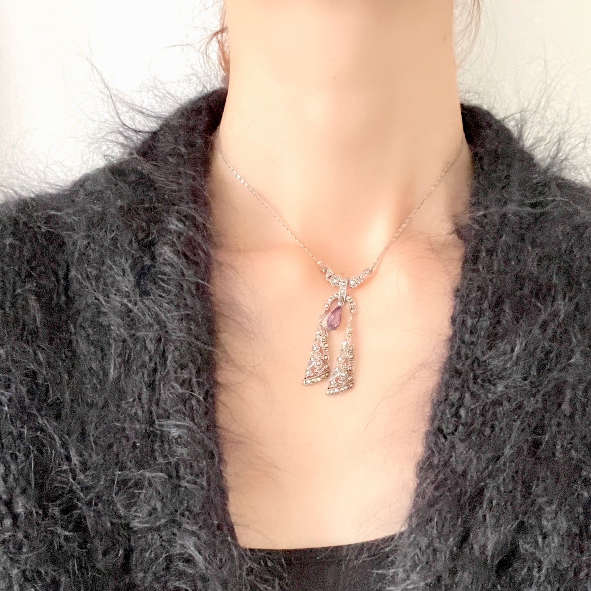 リボンのようなシルバープレートと、その間にティアドロップ型のアメジストが揺れるネグリジェネックレス。