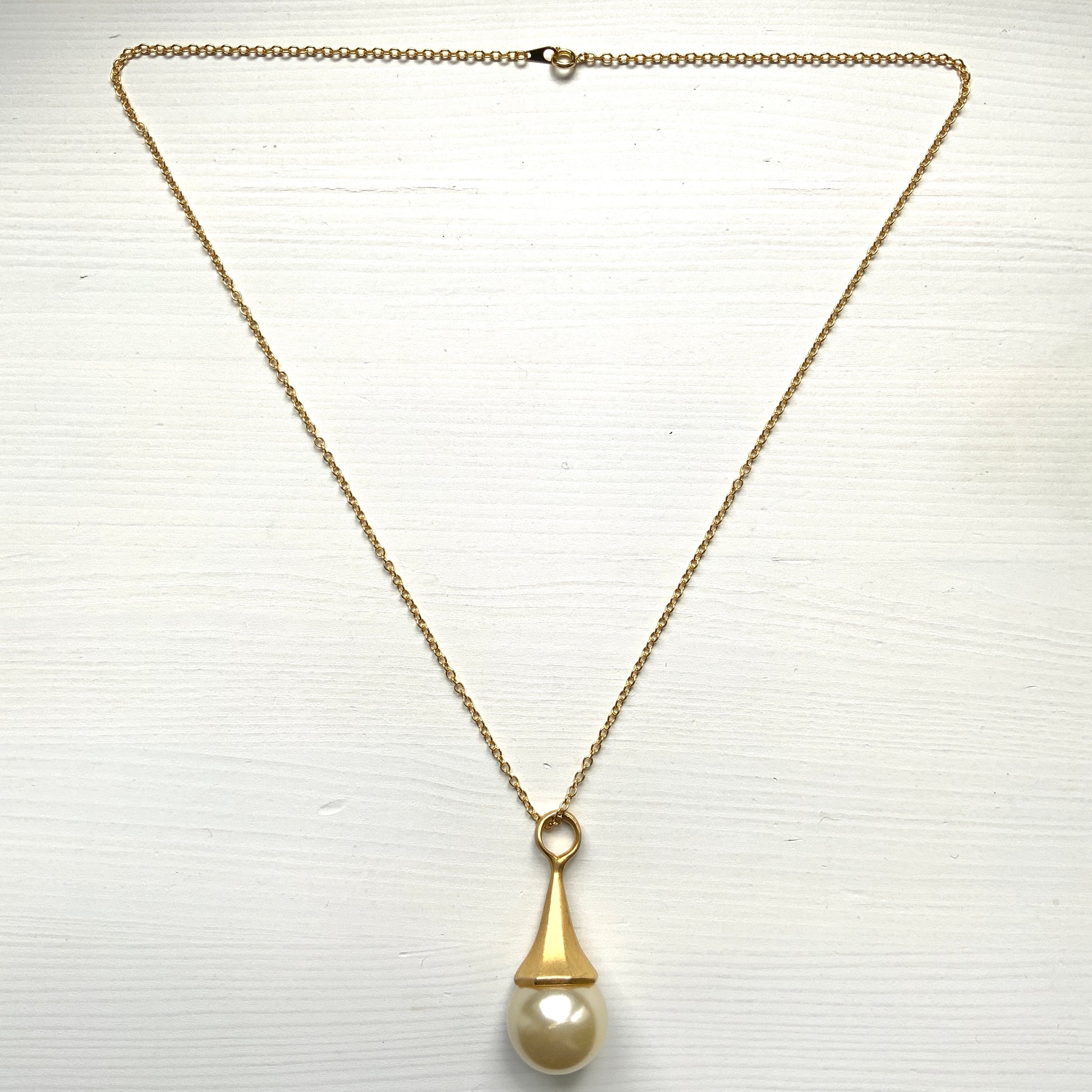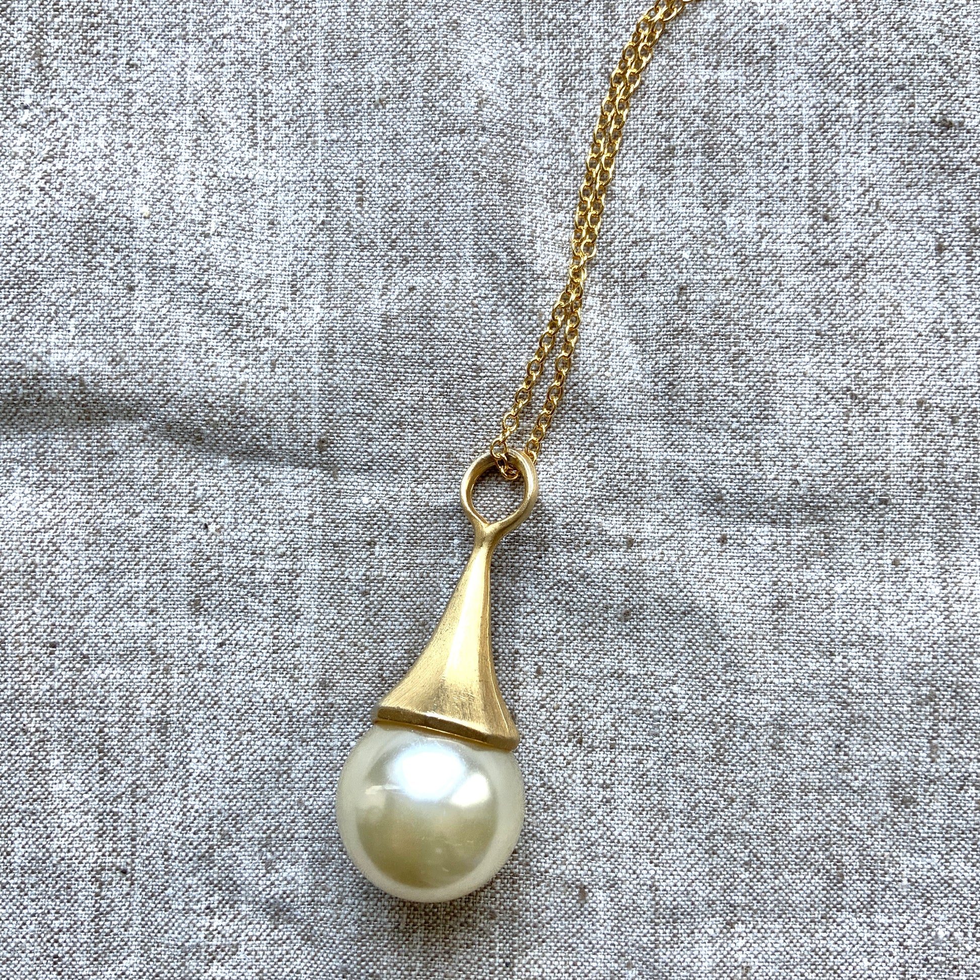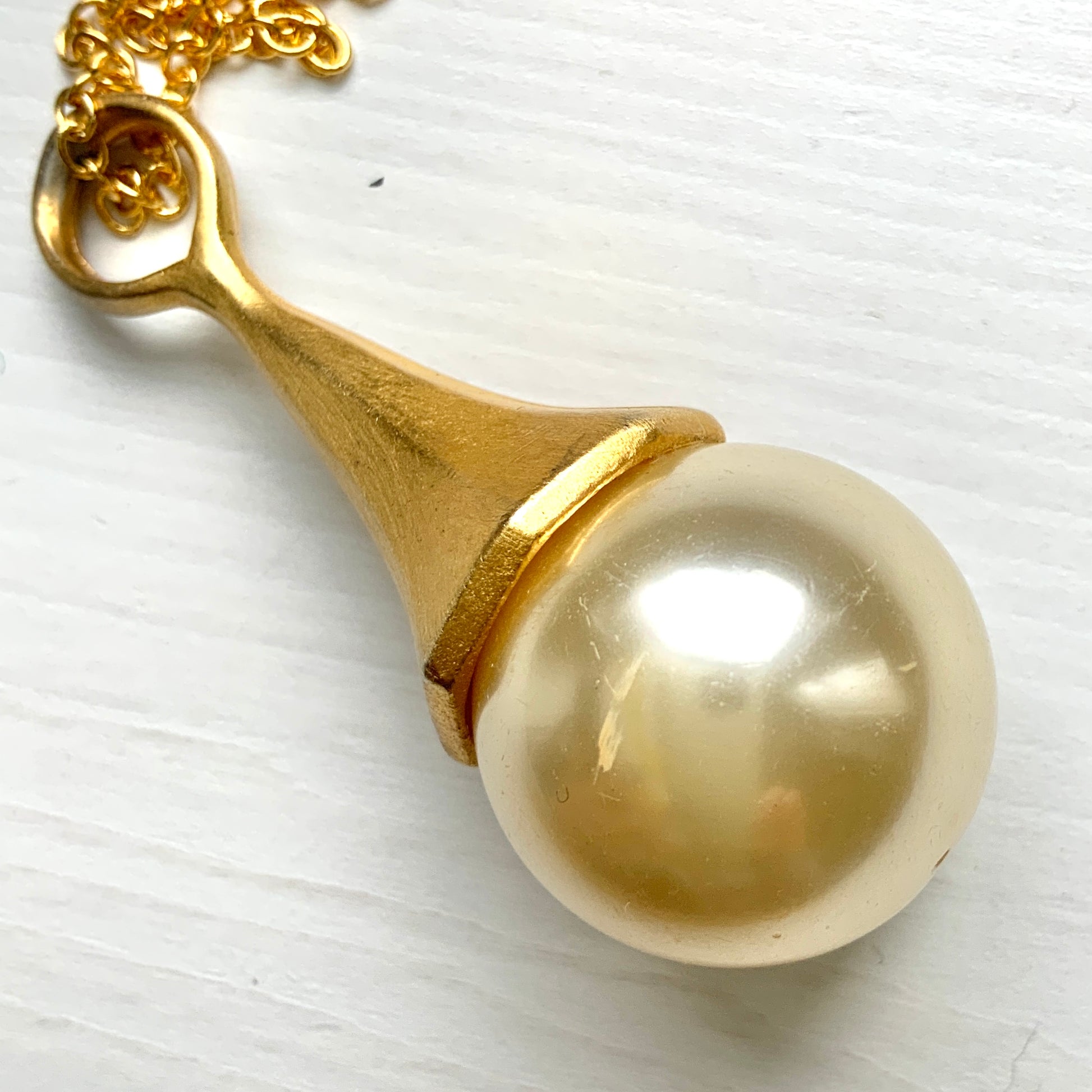 美しいサテンフィニッシュのゴールドトーン メタルに、大きめのフォーパールが付いたネックレス。