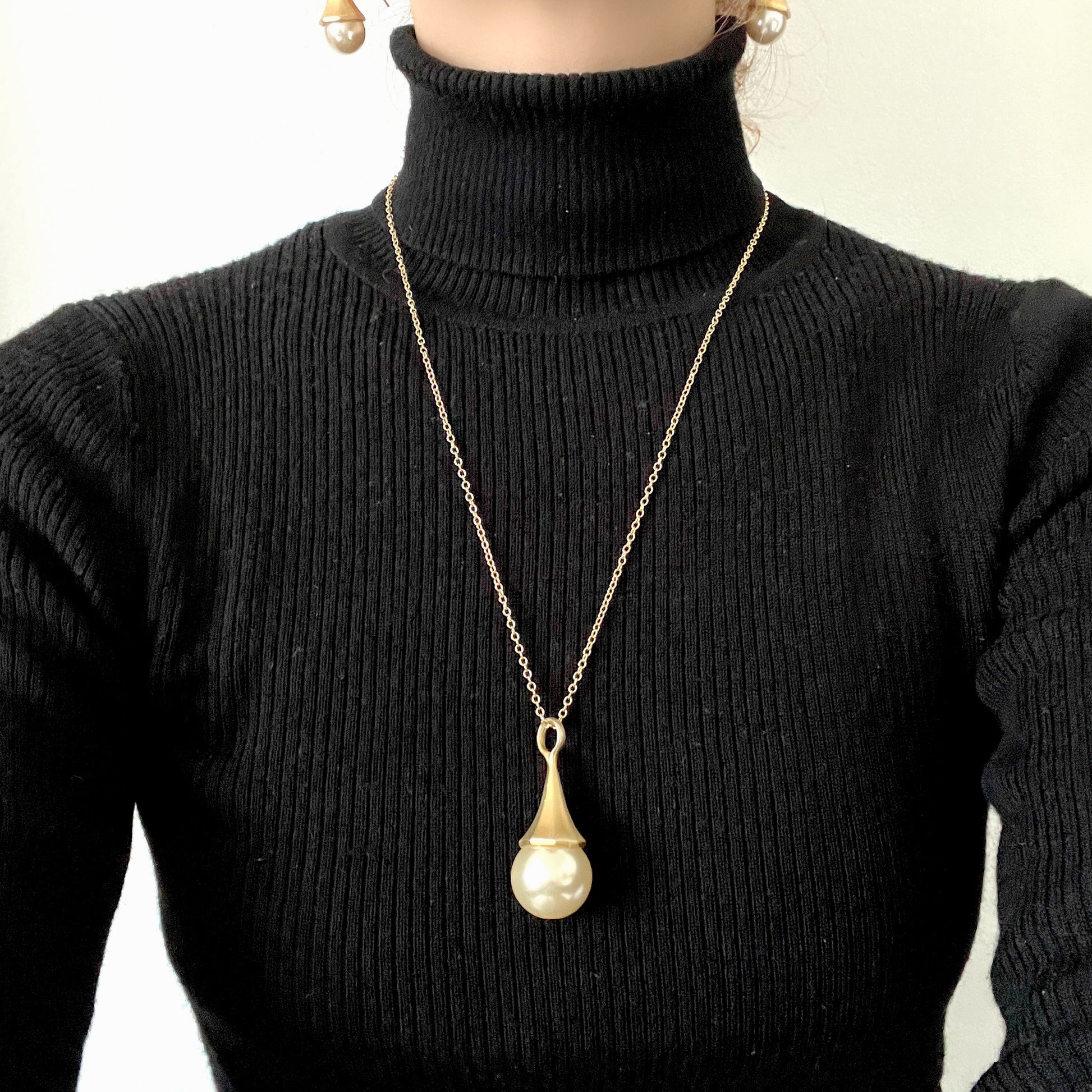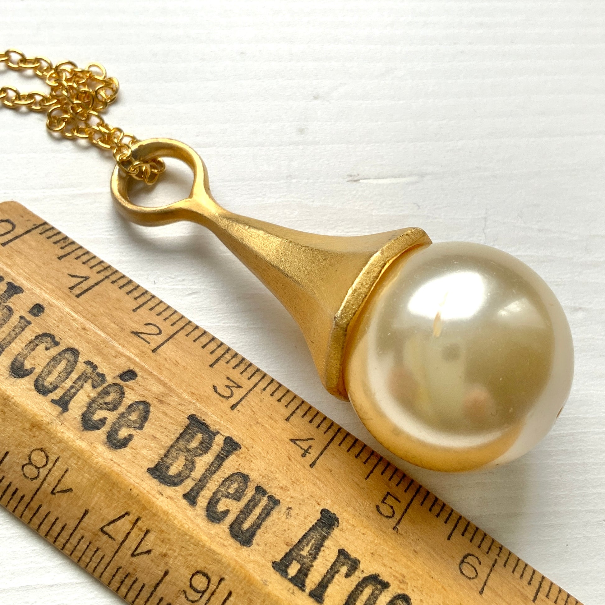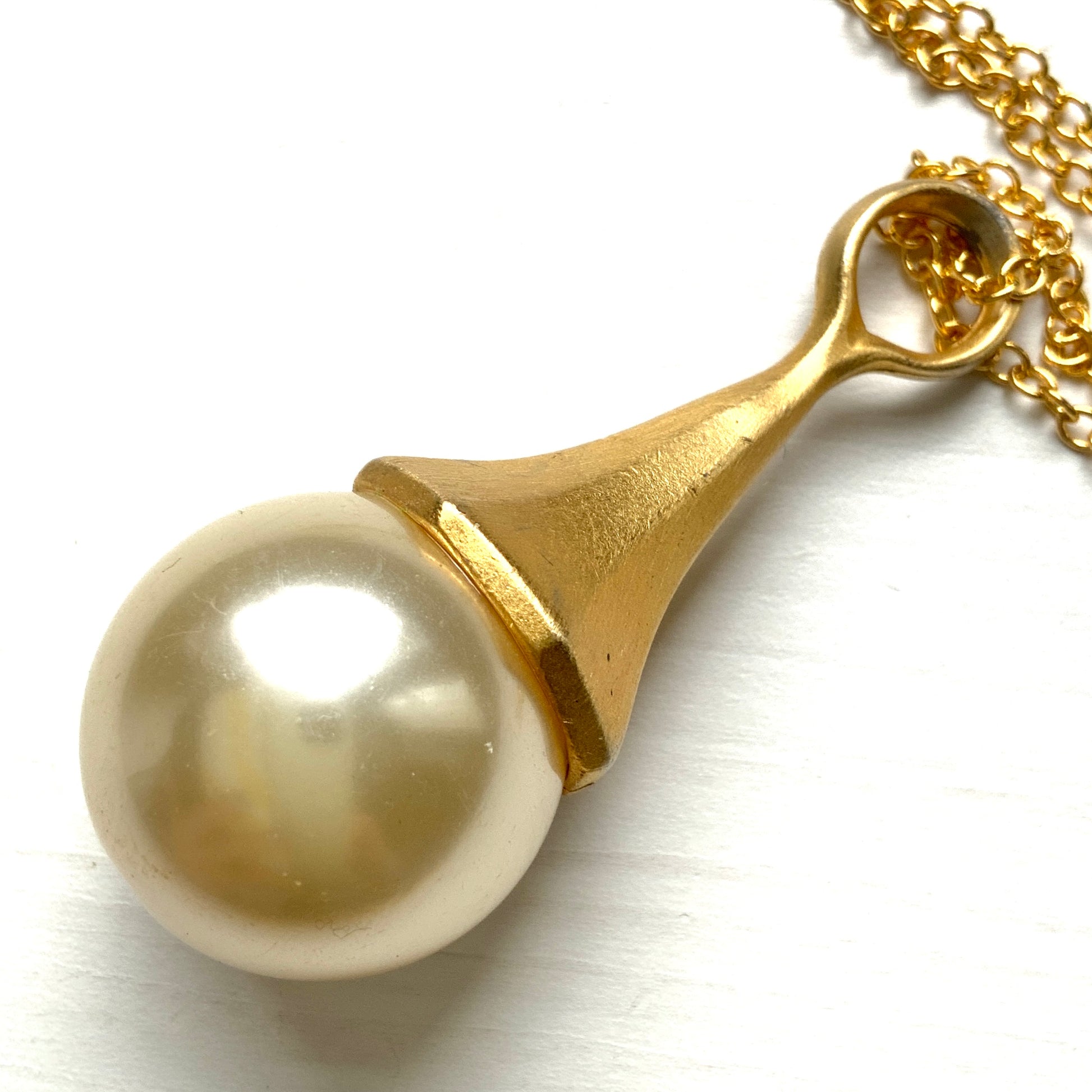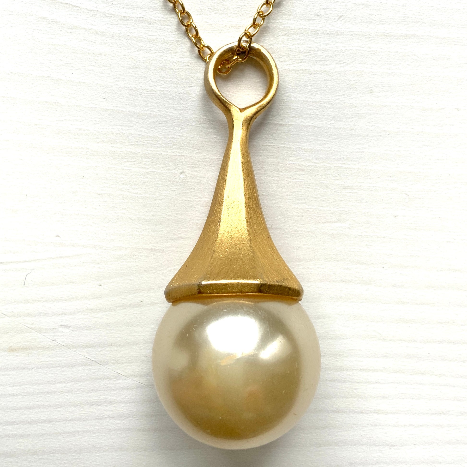美しいサテンフィニッシュのゴールドトーン メタルに、大きめのフォーパールが付いたネックレス。