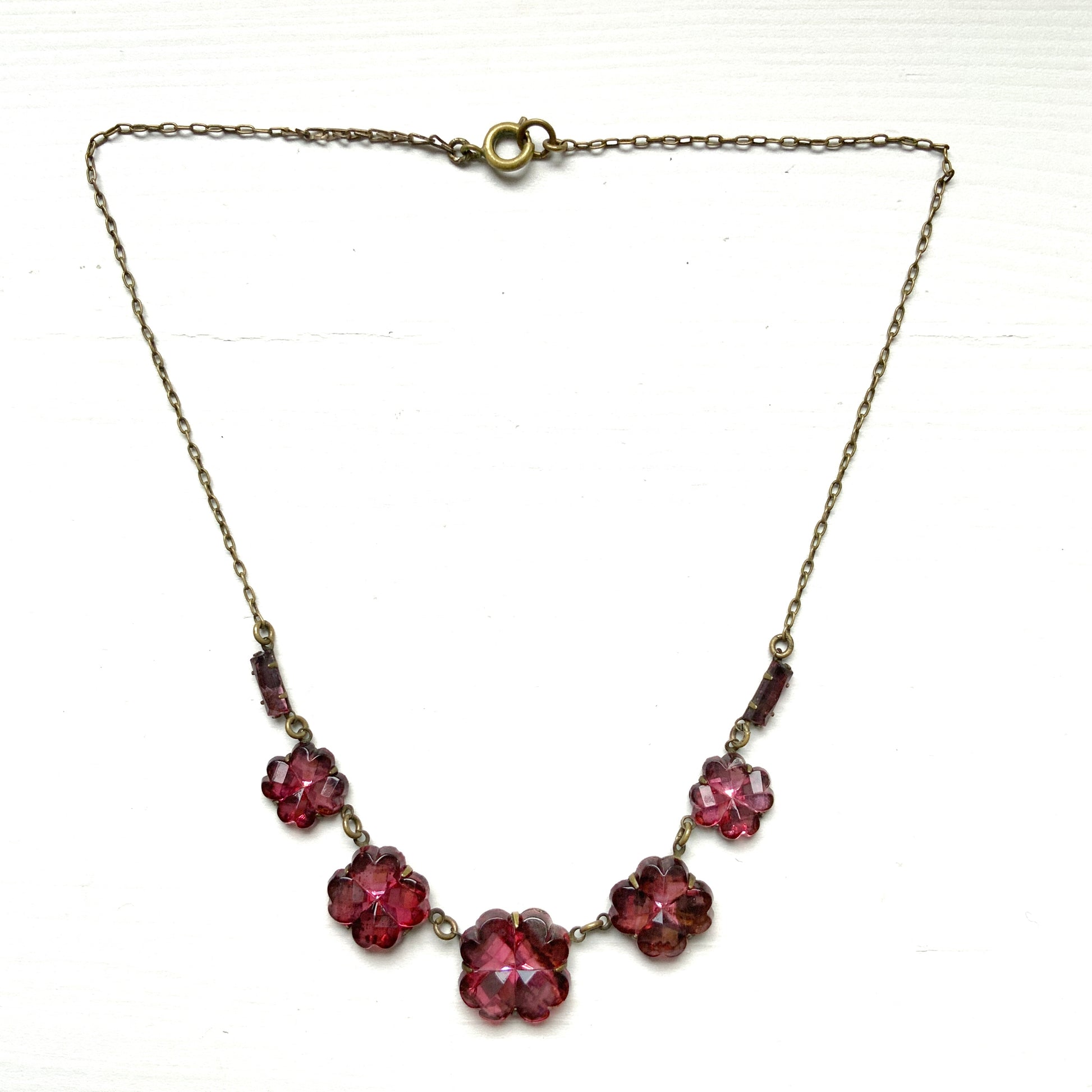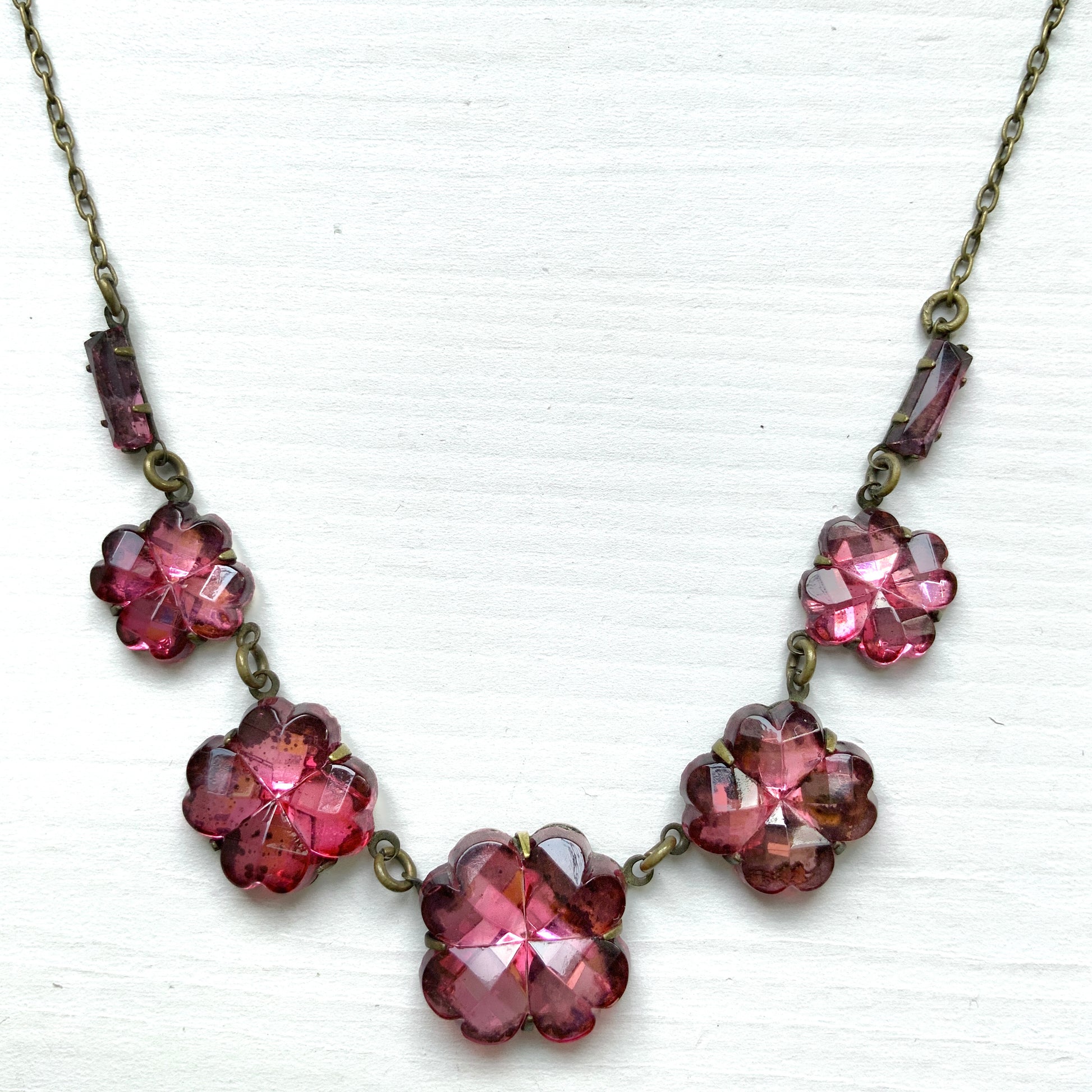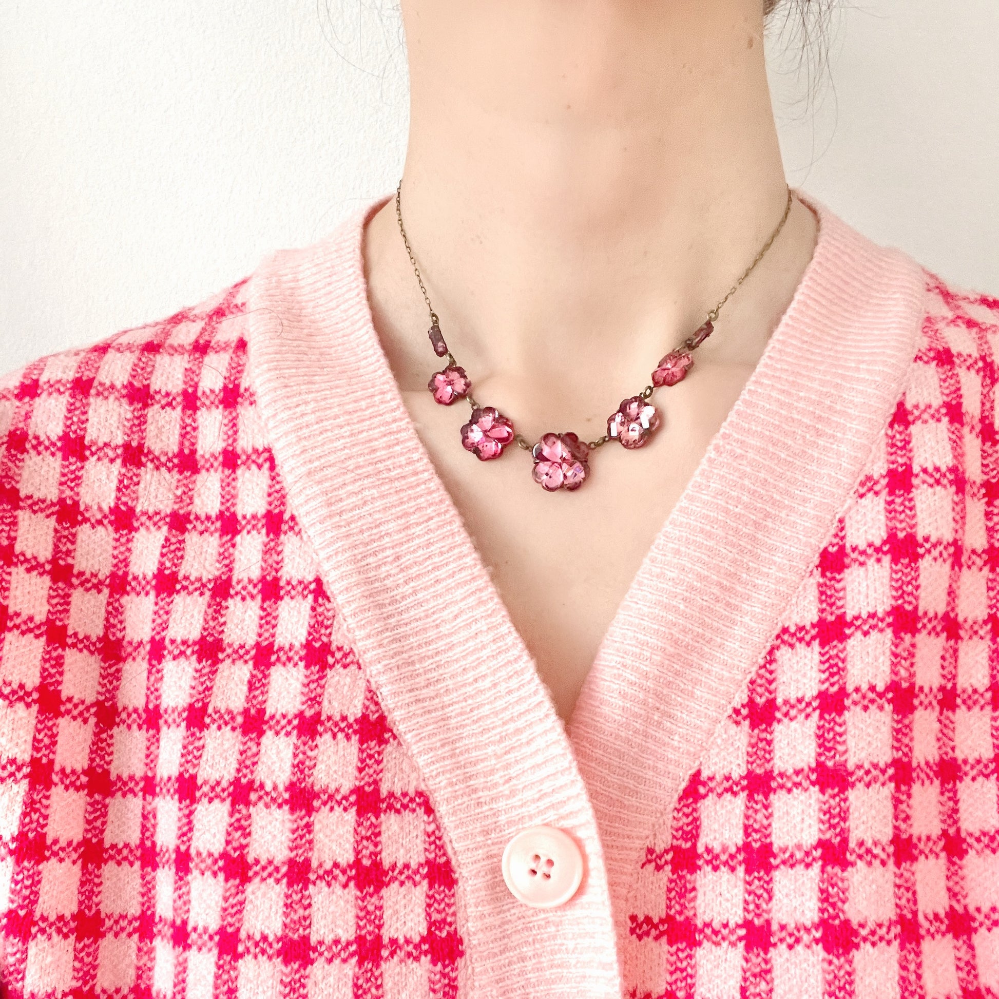ヴィンテージ 1930年代 ピンクフラワー/クローバー チェコ ヴォクスホール ミラーグラス ネックレス