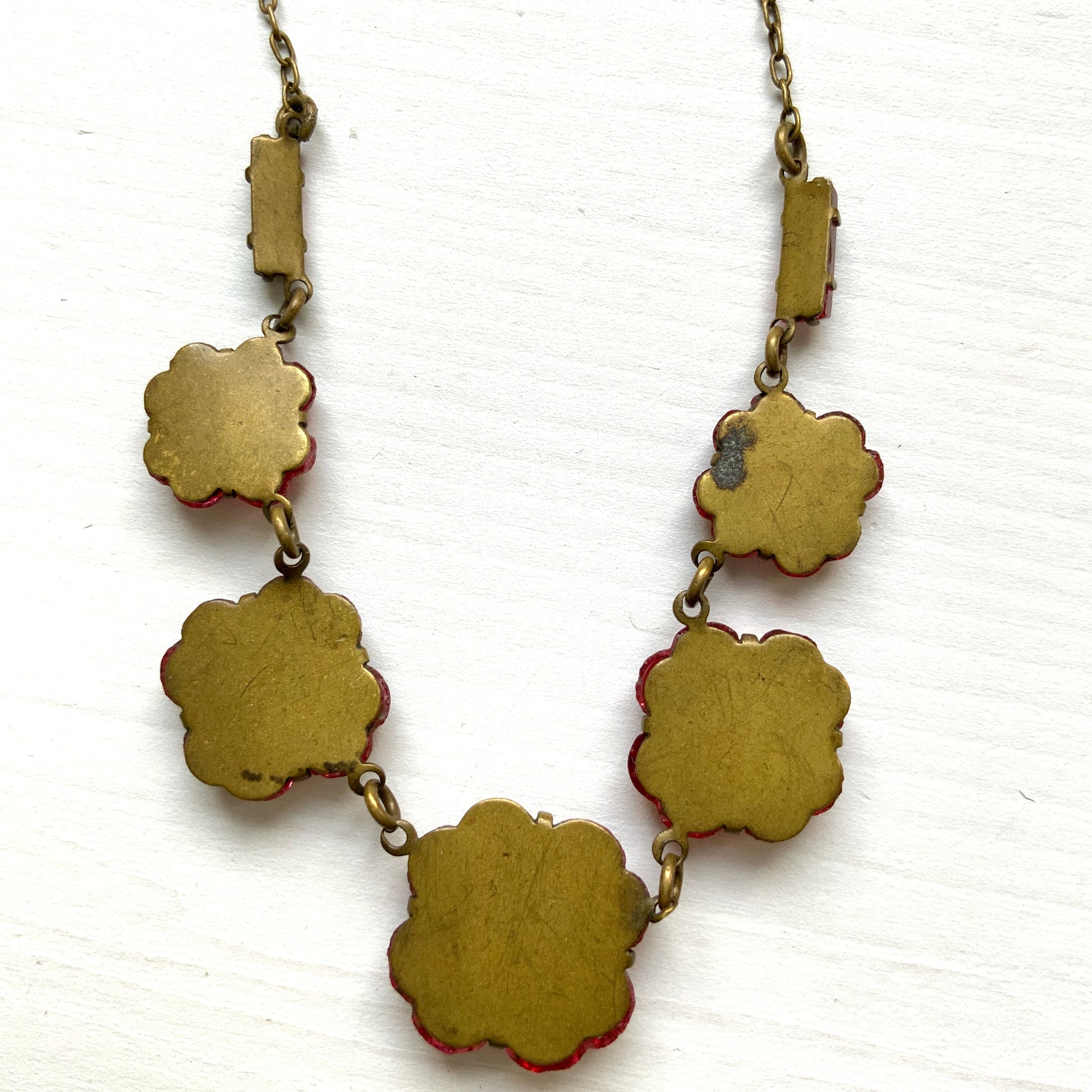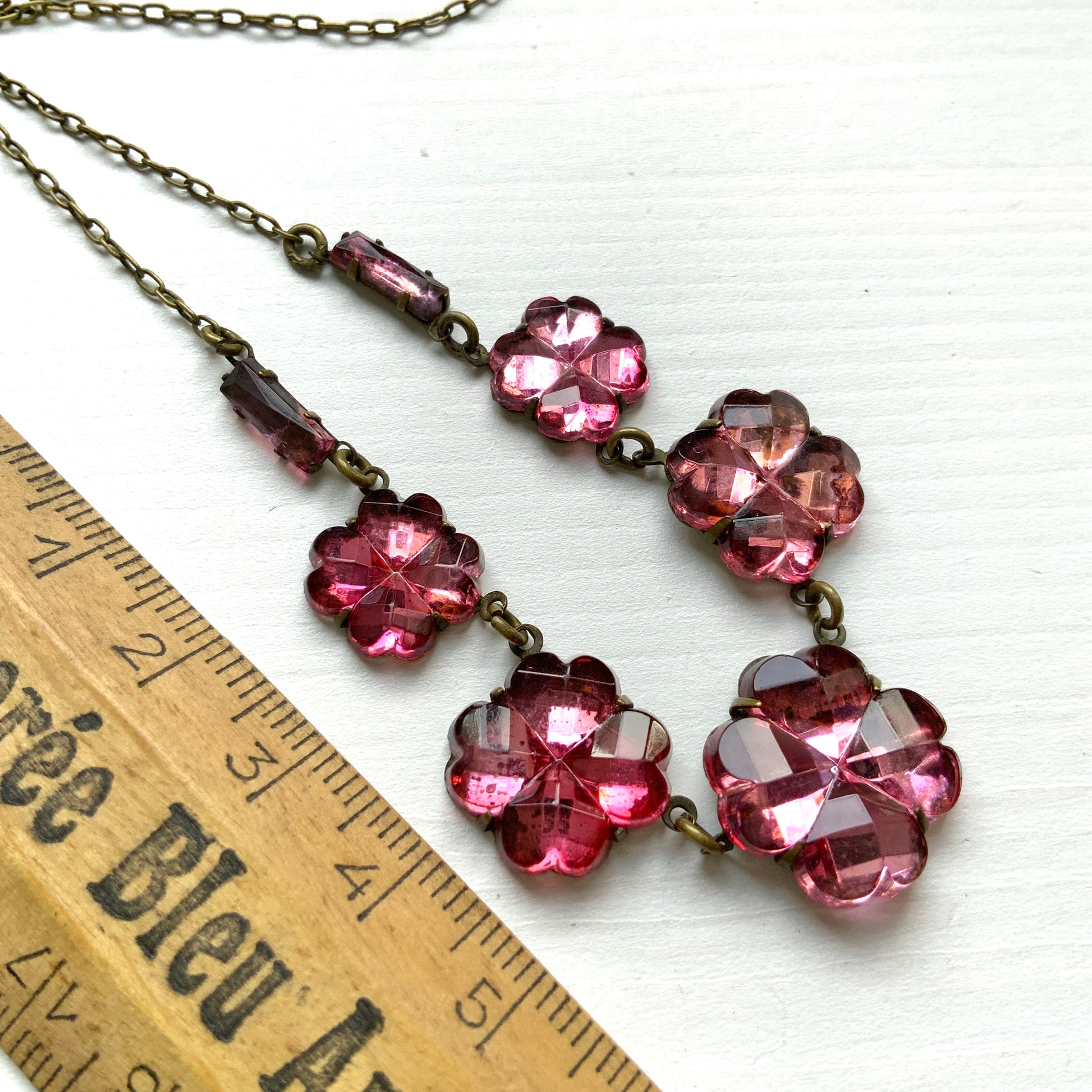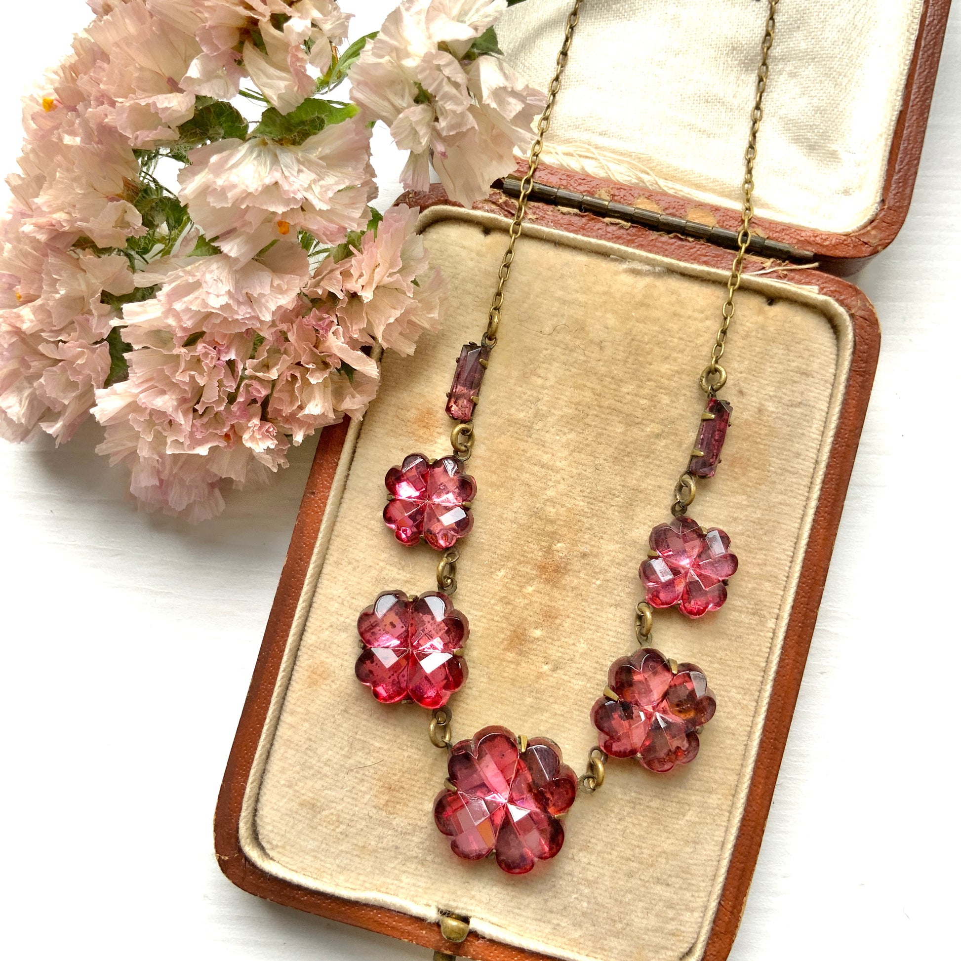 ヴィンテージ 1930年代 ピンクフラワー/クローバー チェコ ヴォクスホール ミラーグラス ネックレス