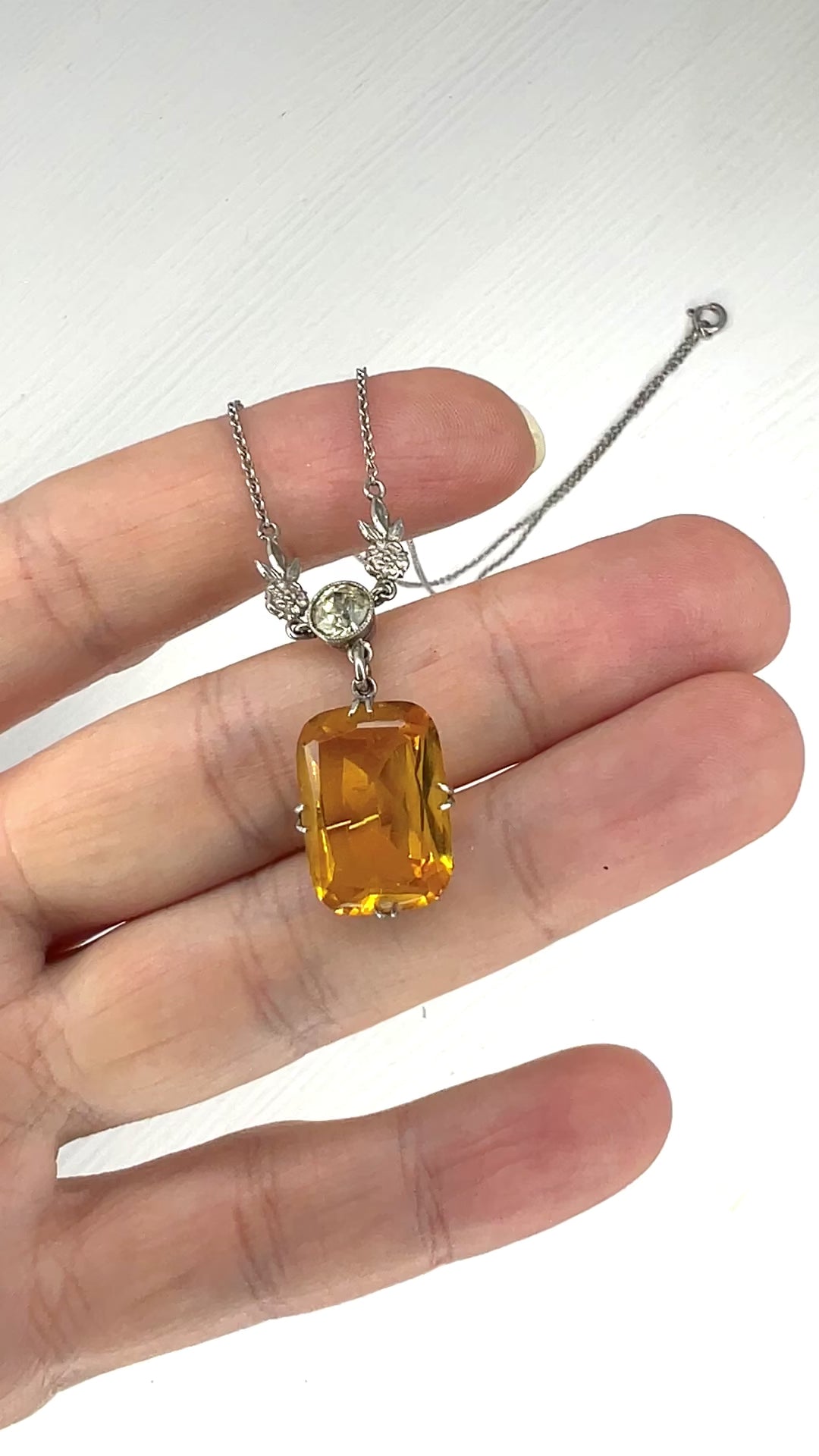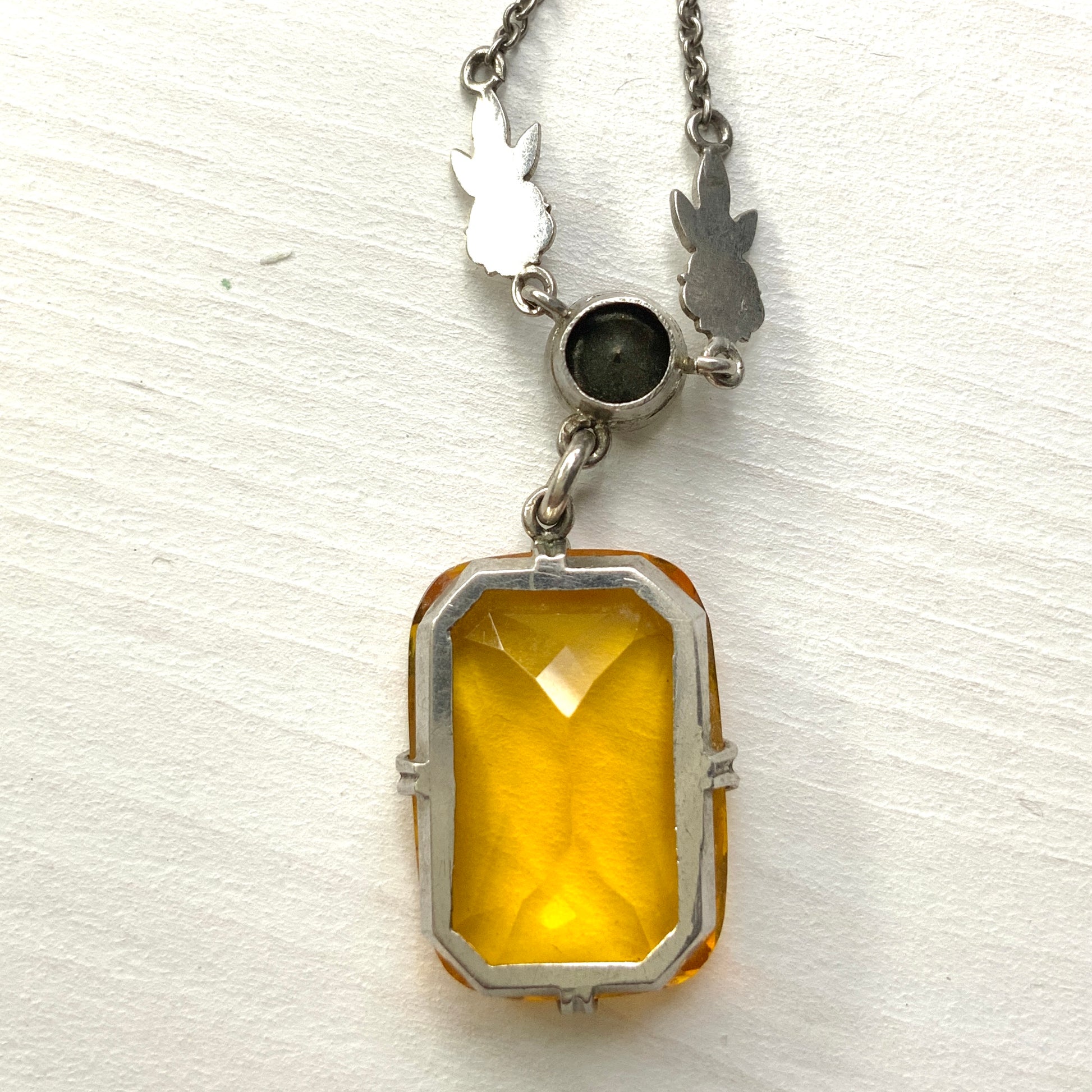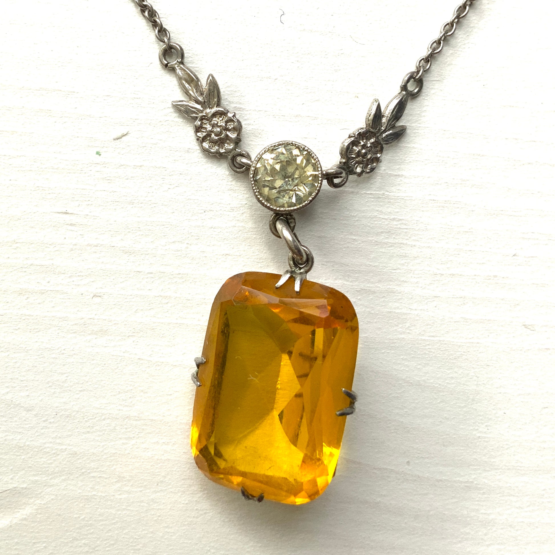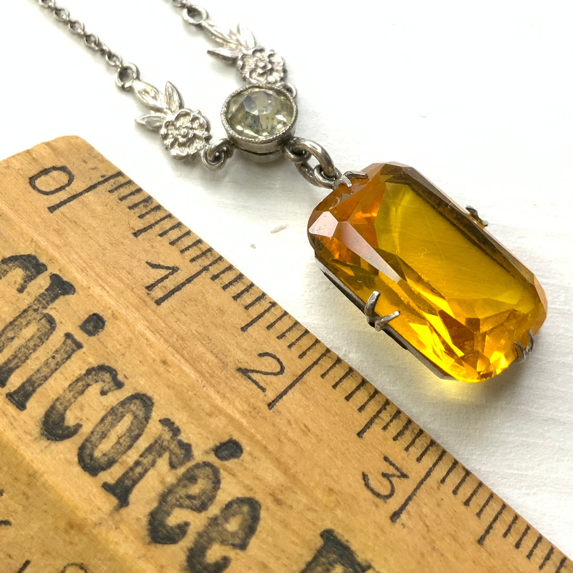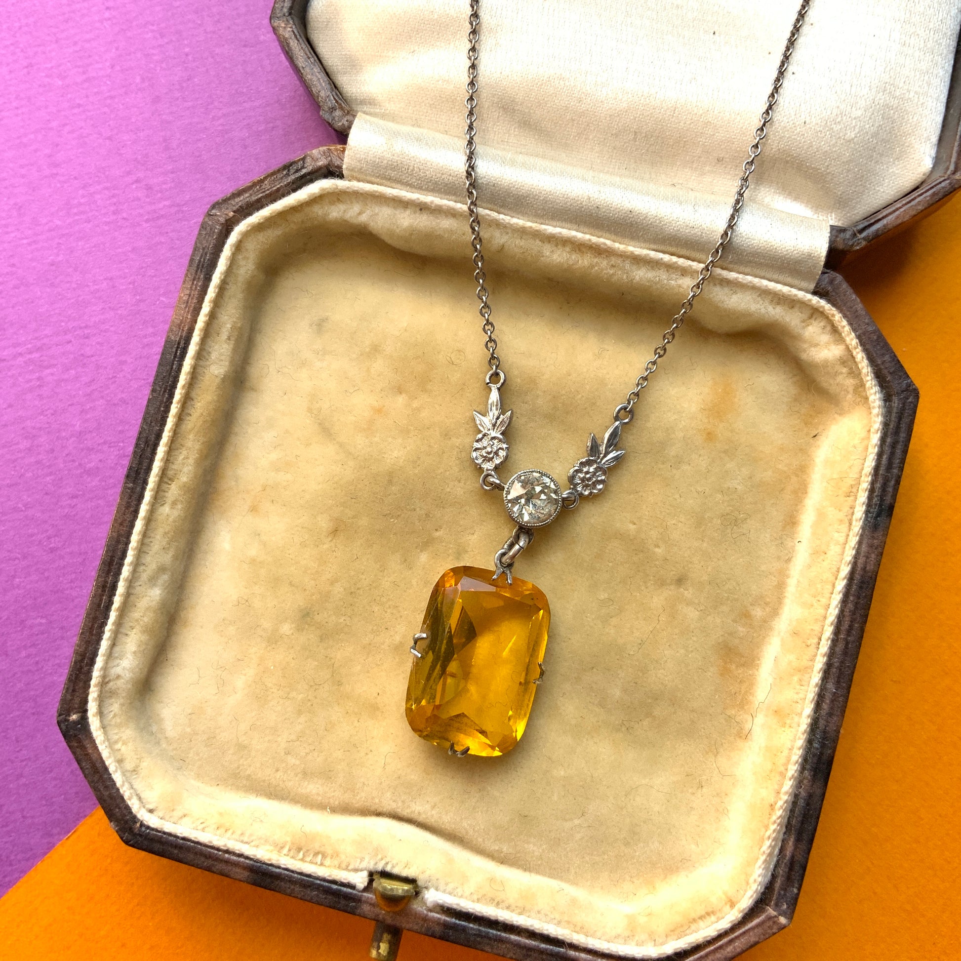 ヴィンテージ アールデコ イエロー 長方形 ガラス ペンダント ネックレス