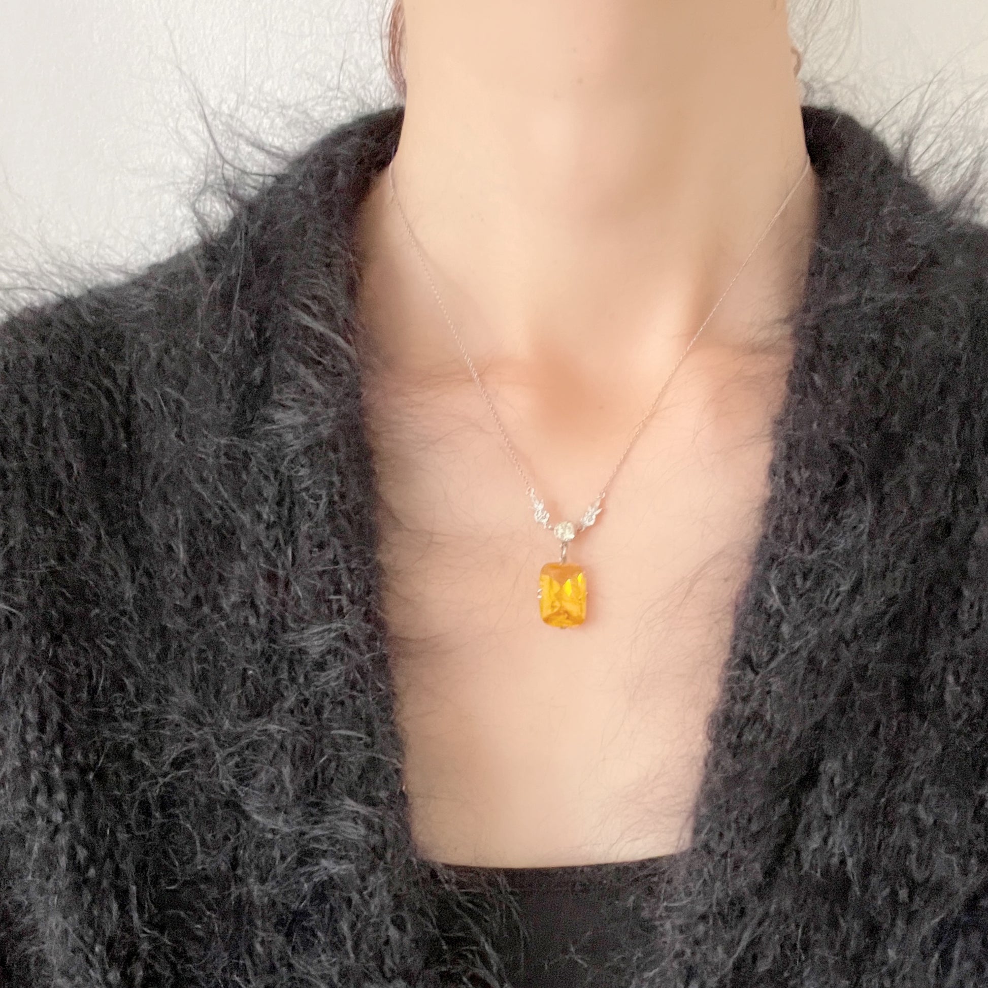 オレンジにも似た濃いイエローの四角グラスのシンプルなペンダントネックレス。