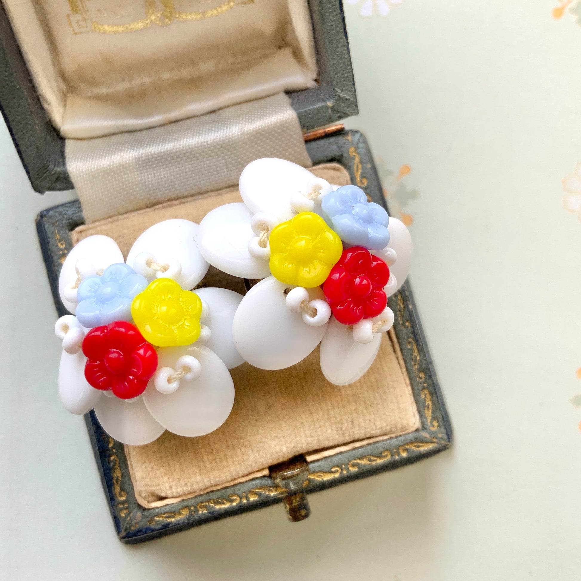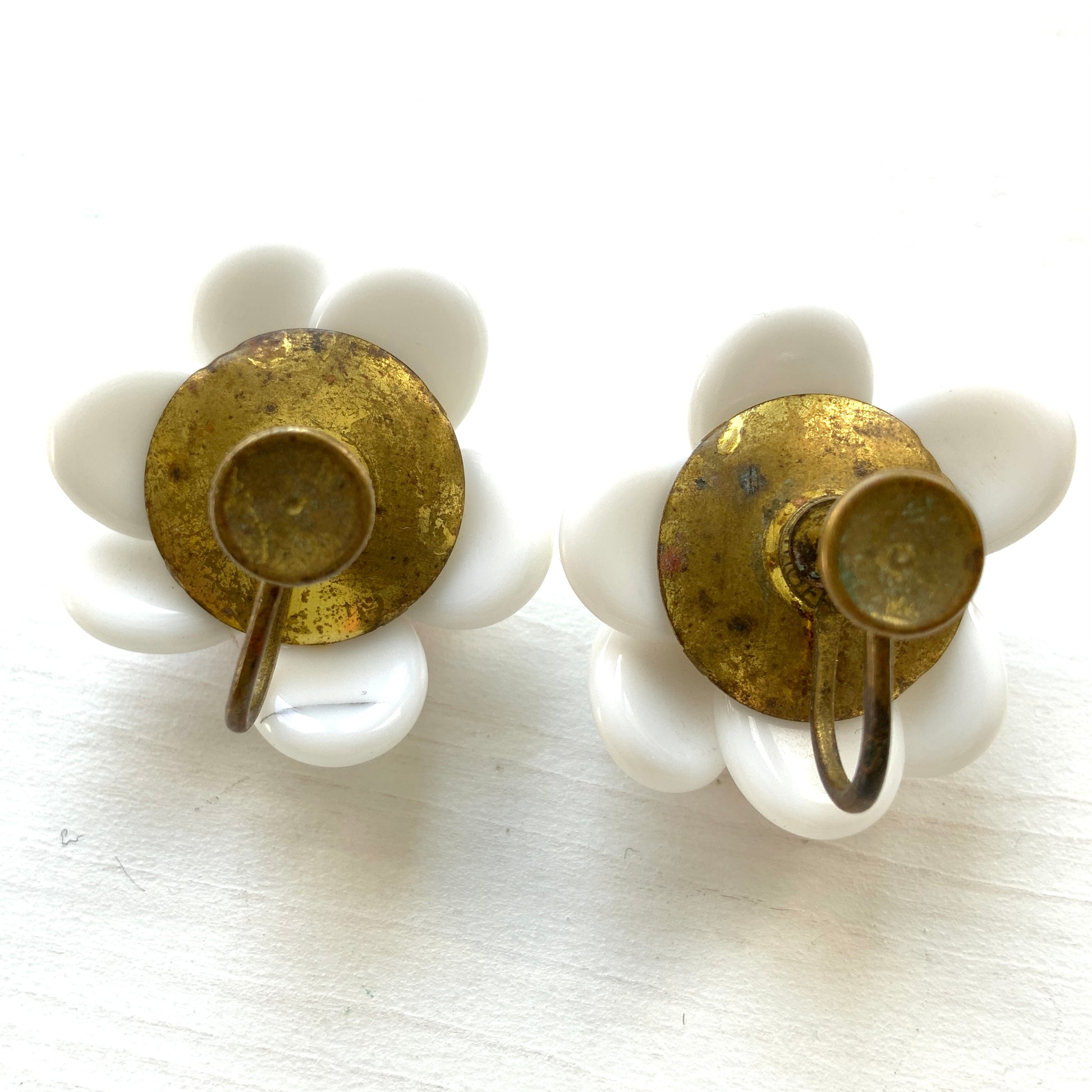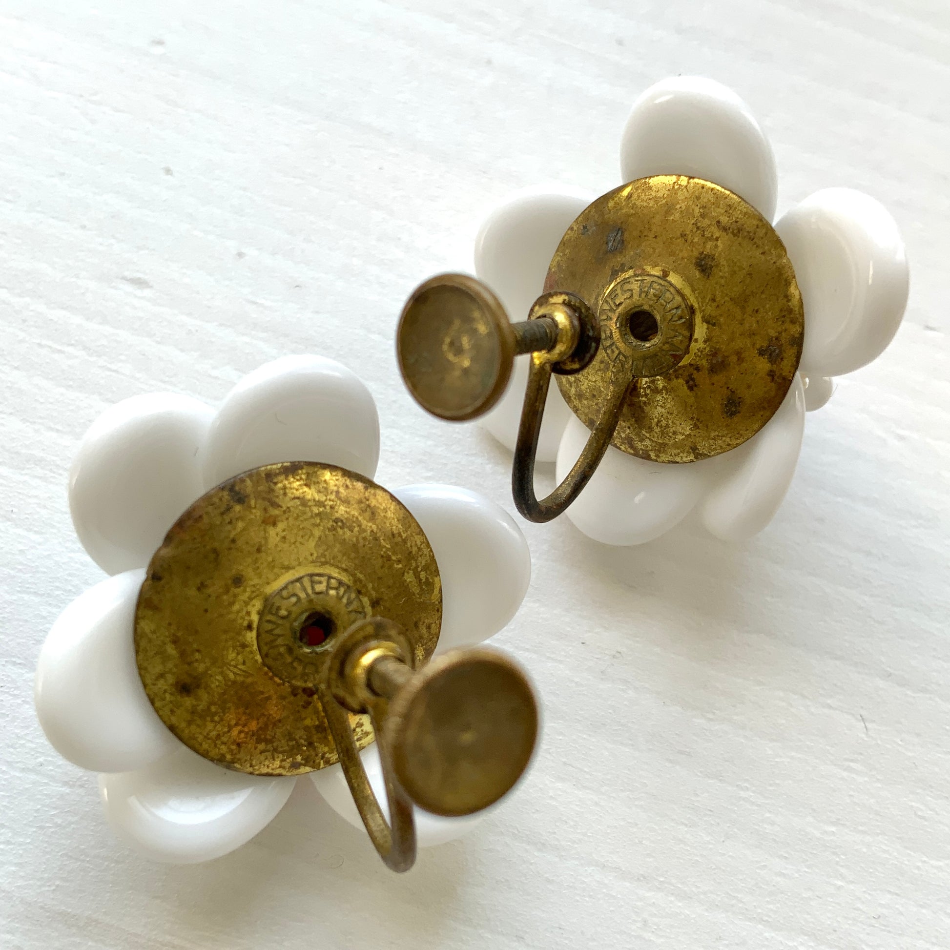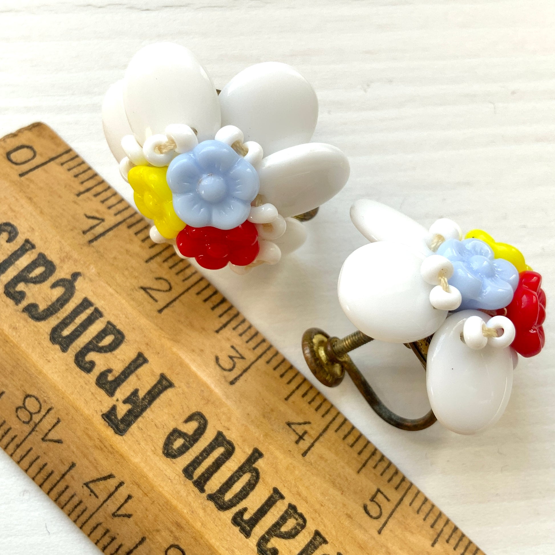 ヴィンテージ 1930年代 ミルクグラス&マルチカラーフラワーグラス スクリューイヤリング