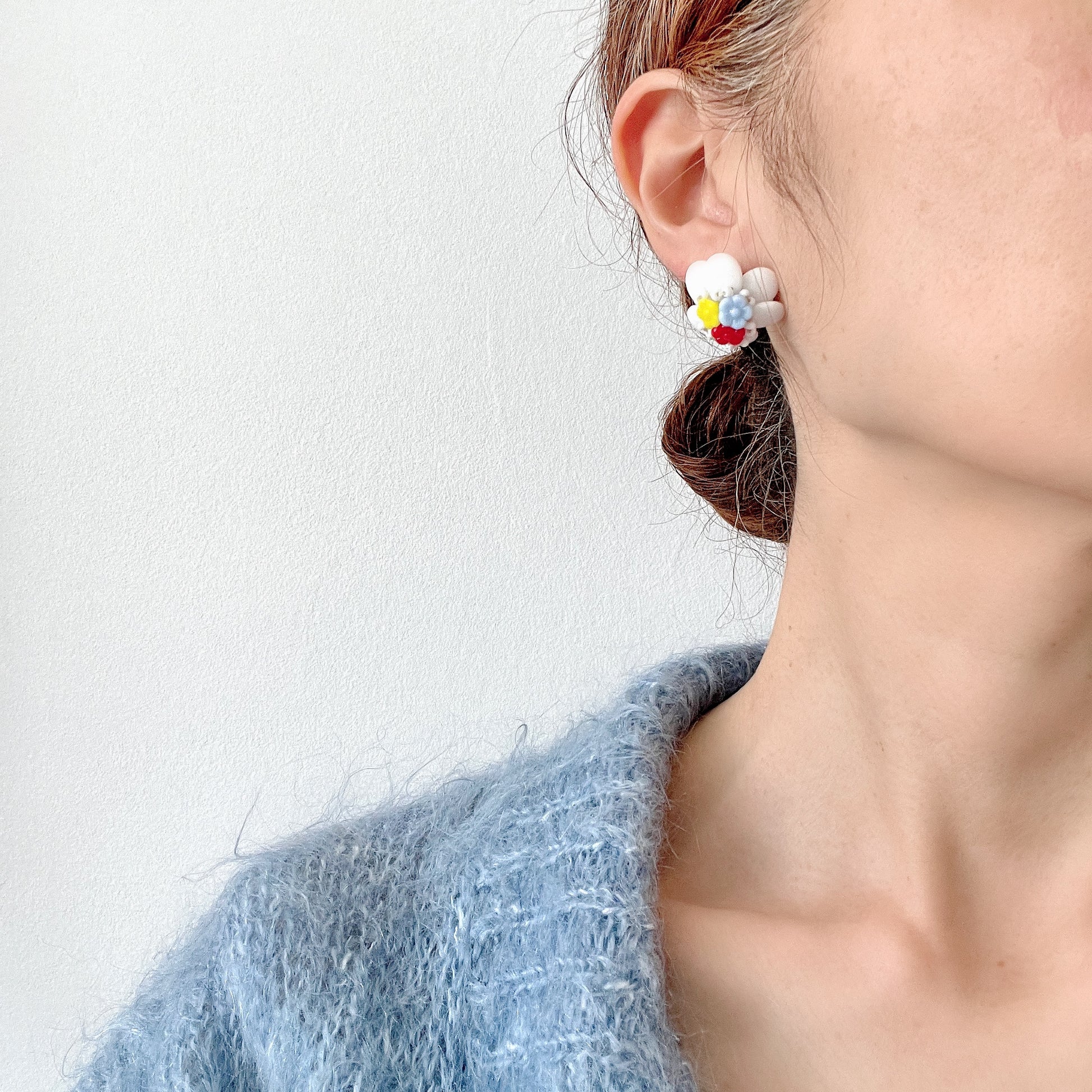 ミルクグラスの花びらに、レッド、イエロー、ベビーブルーの三色の小さなお花ガラスがついたスクリューイヤリング。