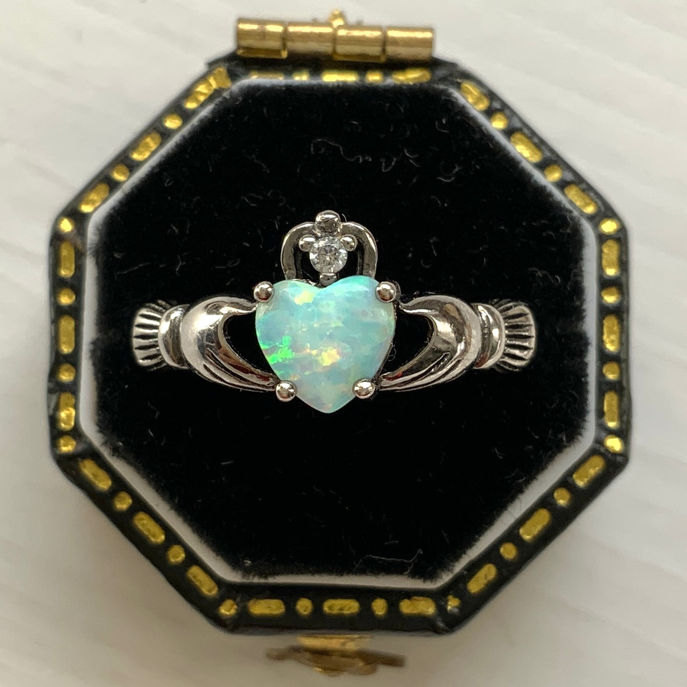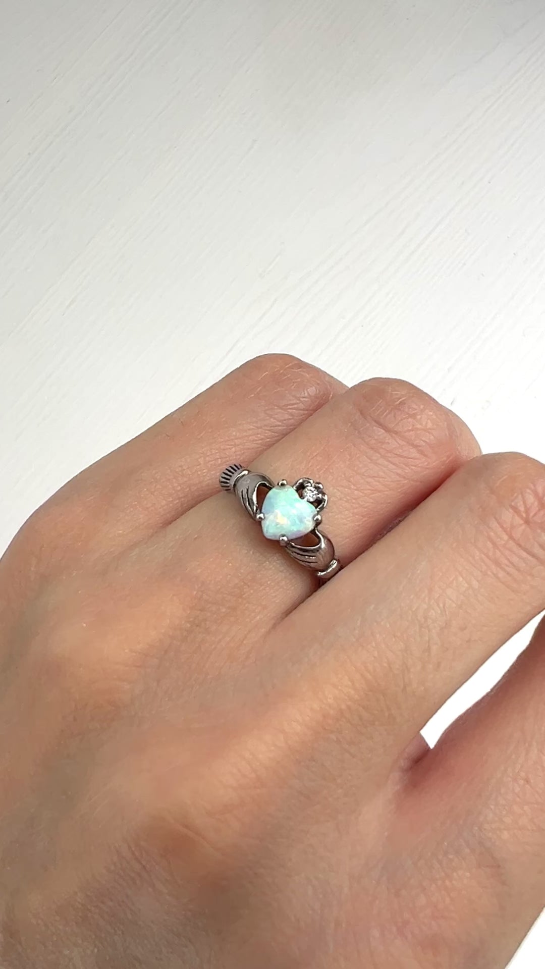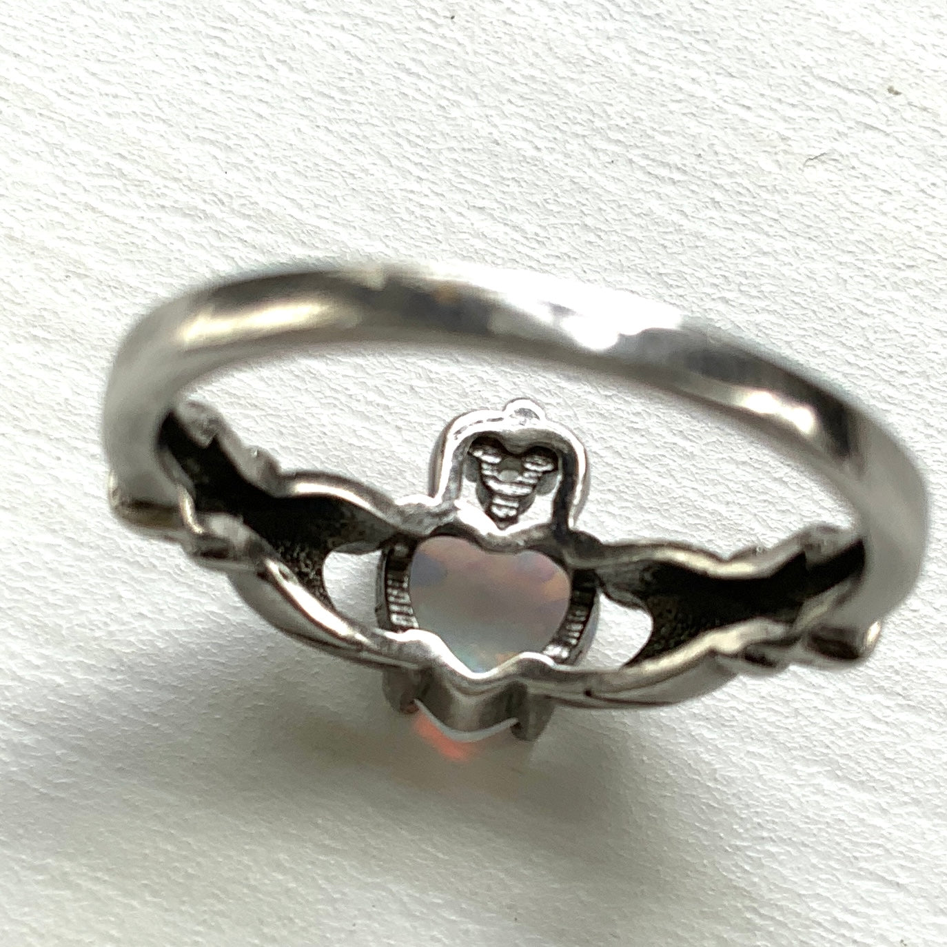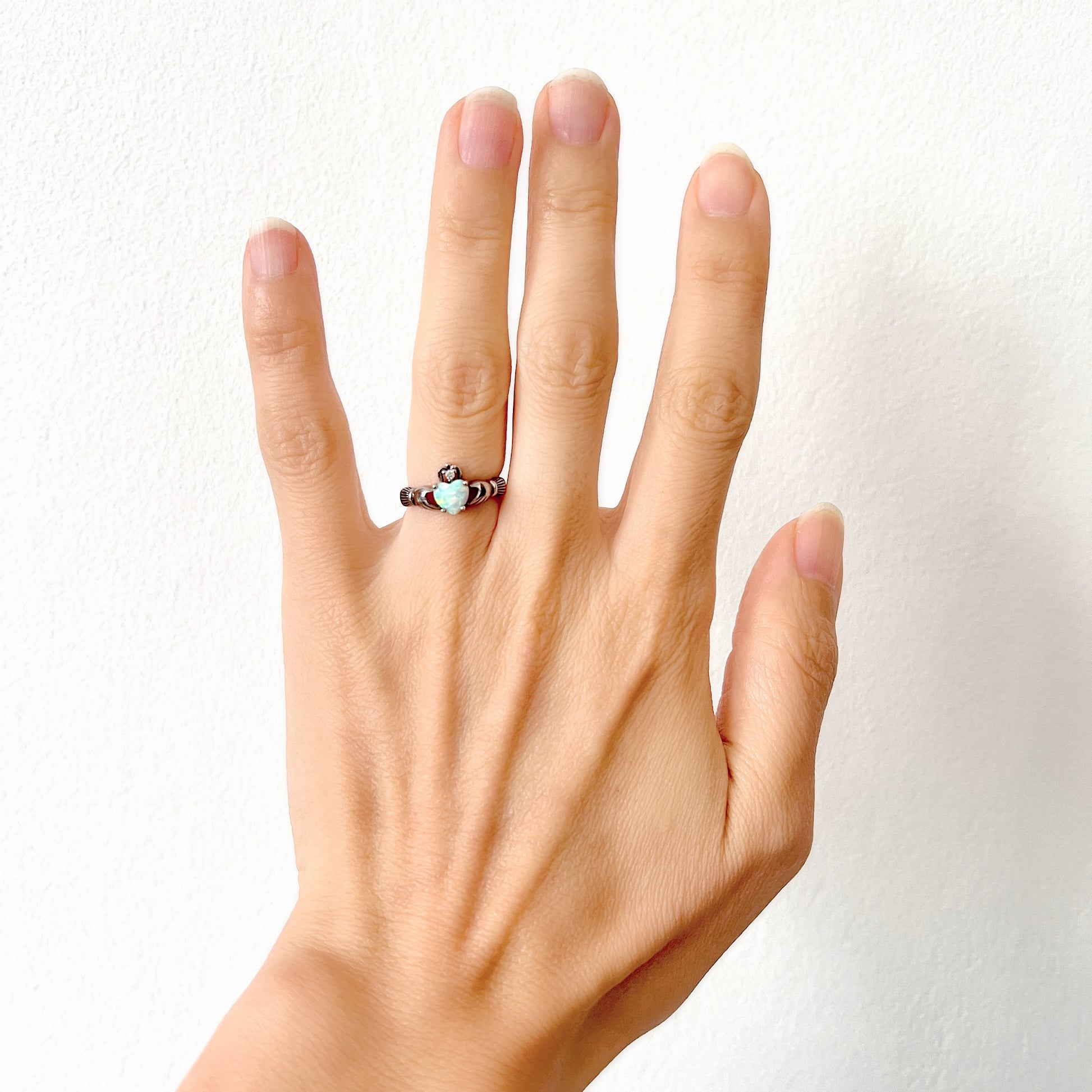 オパールを使ったアイルランドの伝統的なシンボル、クラダのシルバーリング。