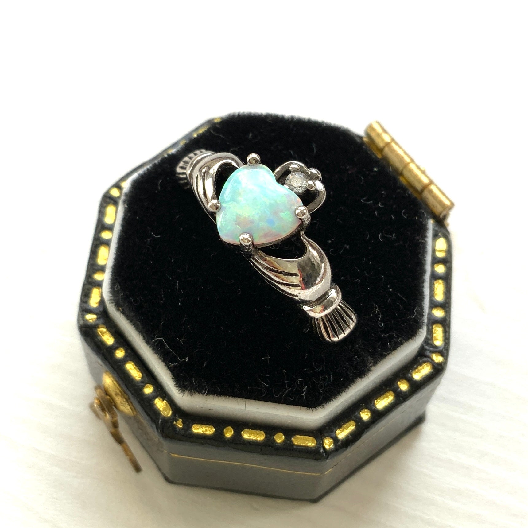 オパールで作られた伝統的なアイルランドのシンボル、クラダのシルバーリング。