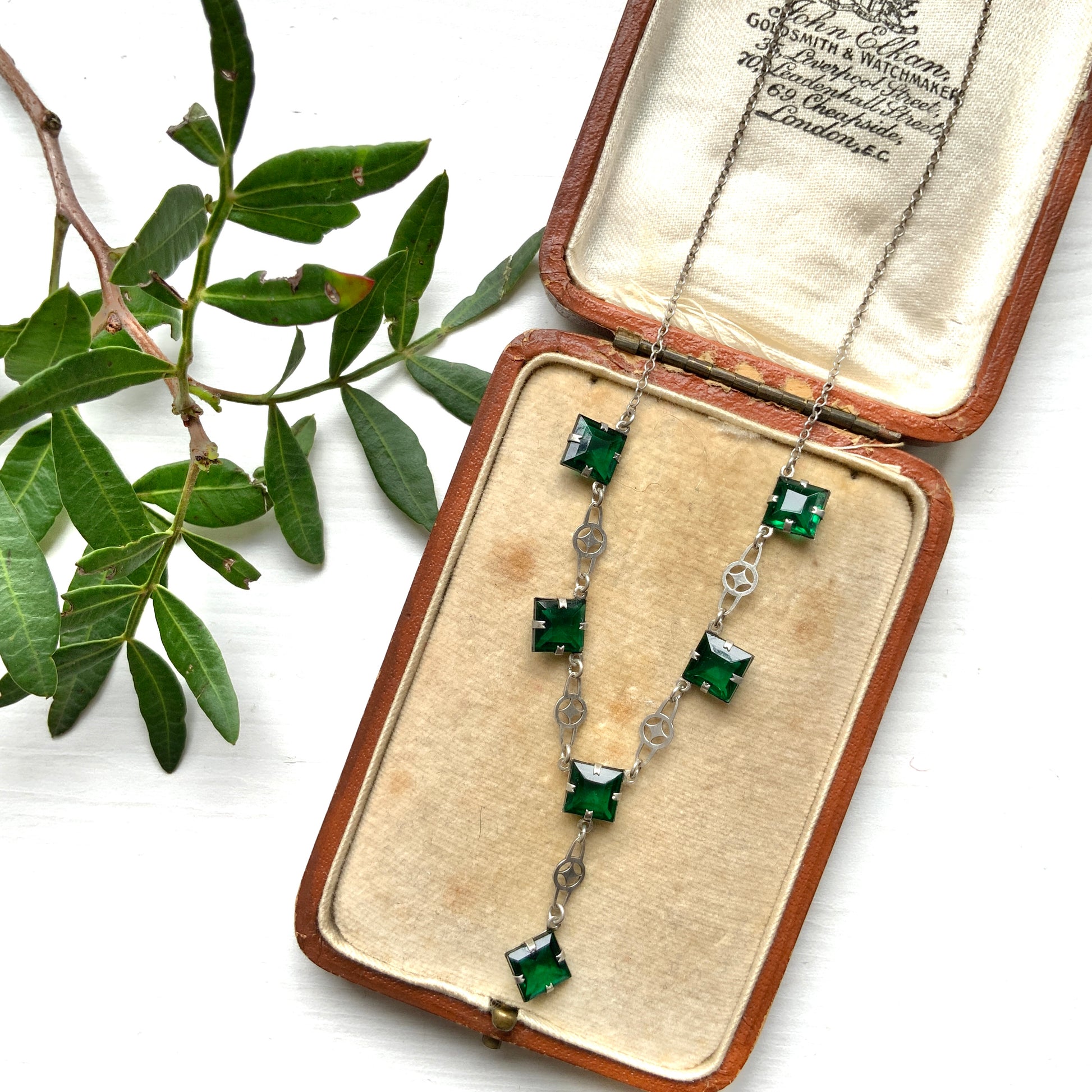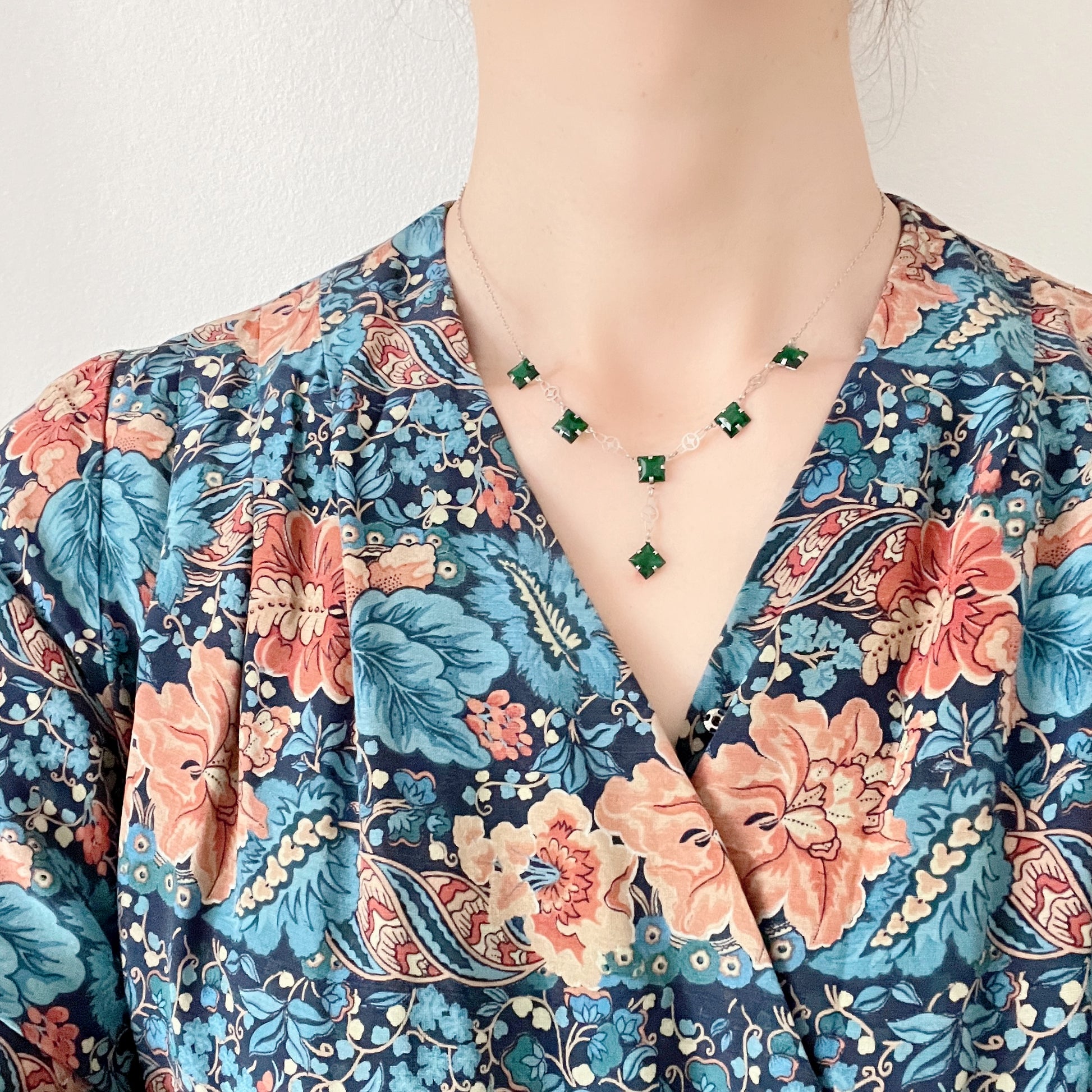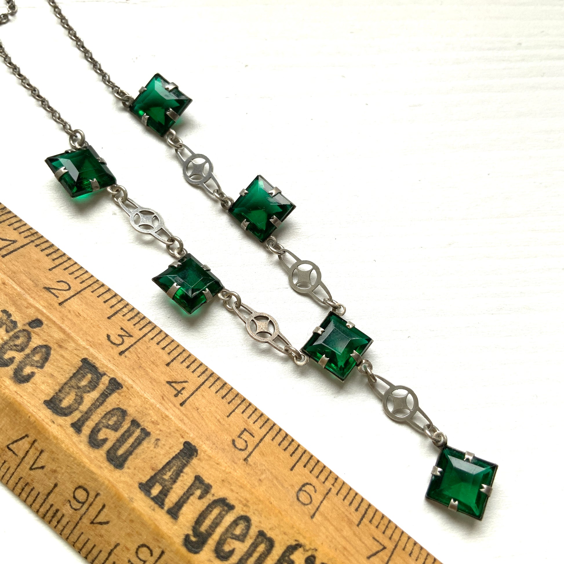ヴィンテージ アールデコ グリーン スクエアグラス シルバー ネックレス