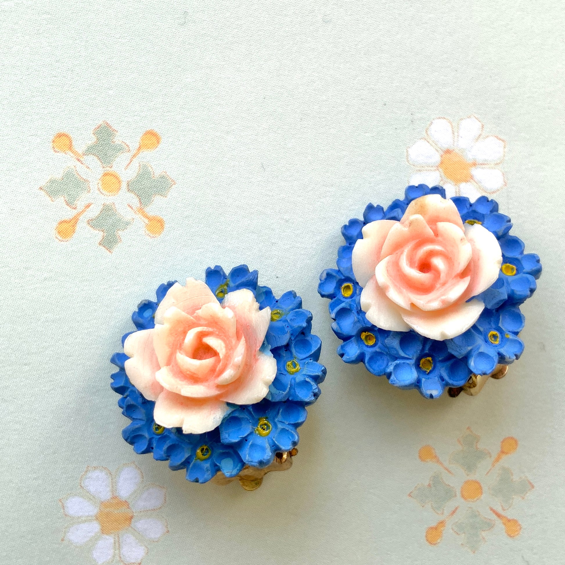 ベビーピンクのバラと、その周りを取り囲む小さなブルーの勿忘草のお花の、セルロイドのクリップイヤリング。