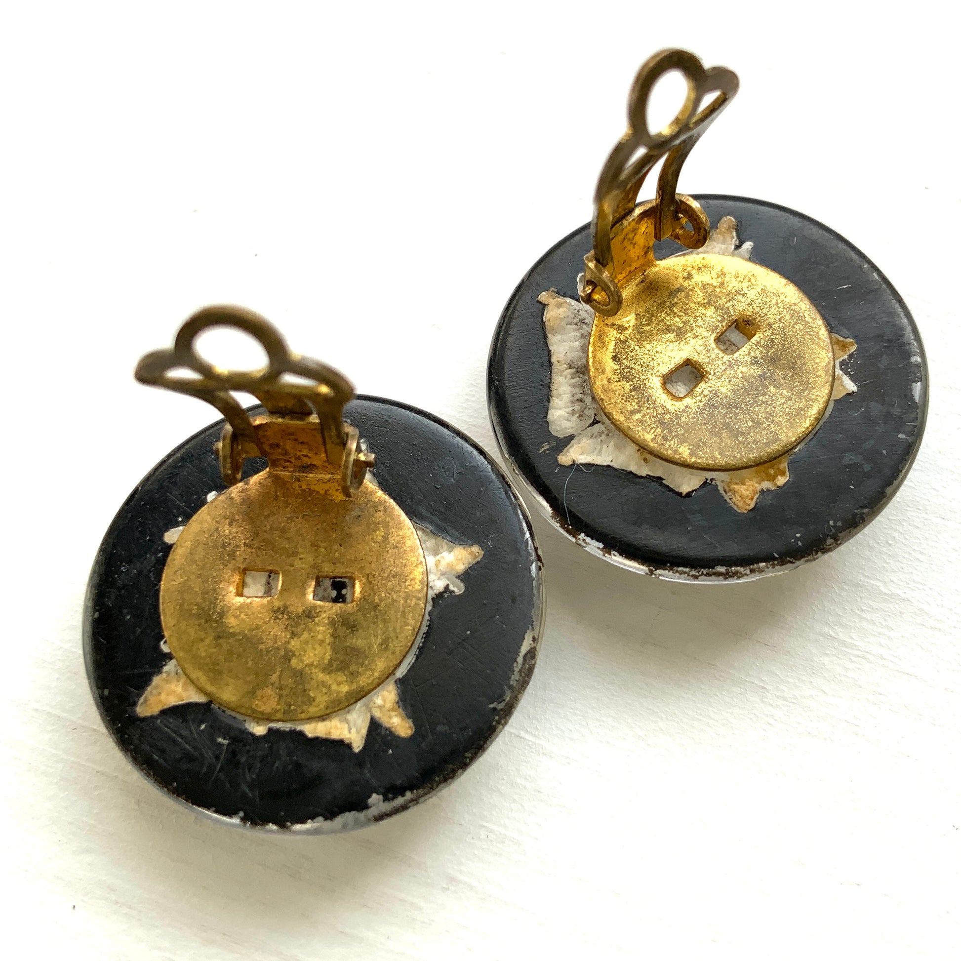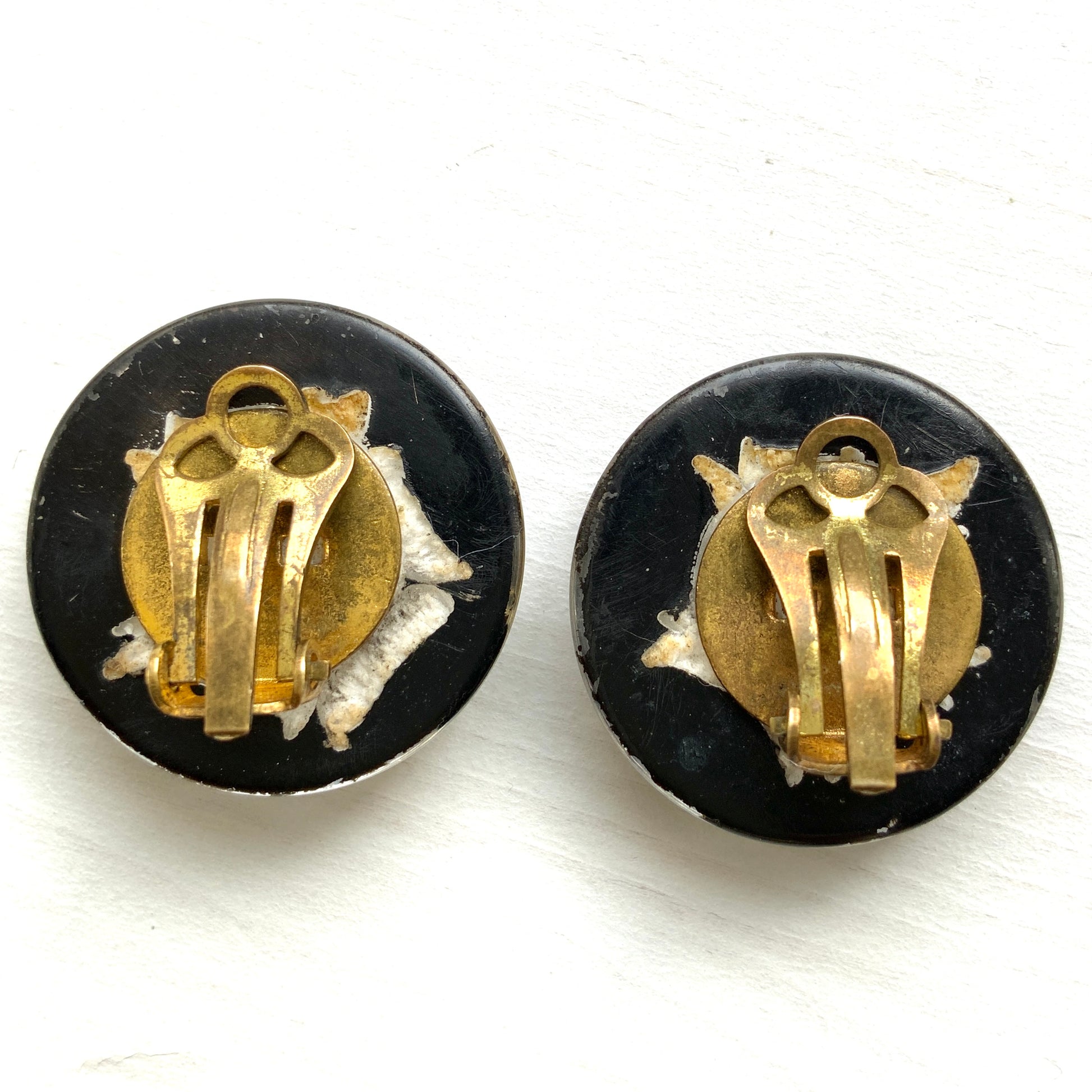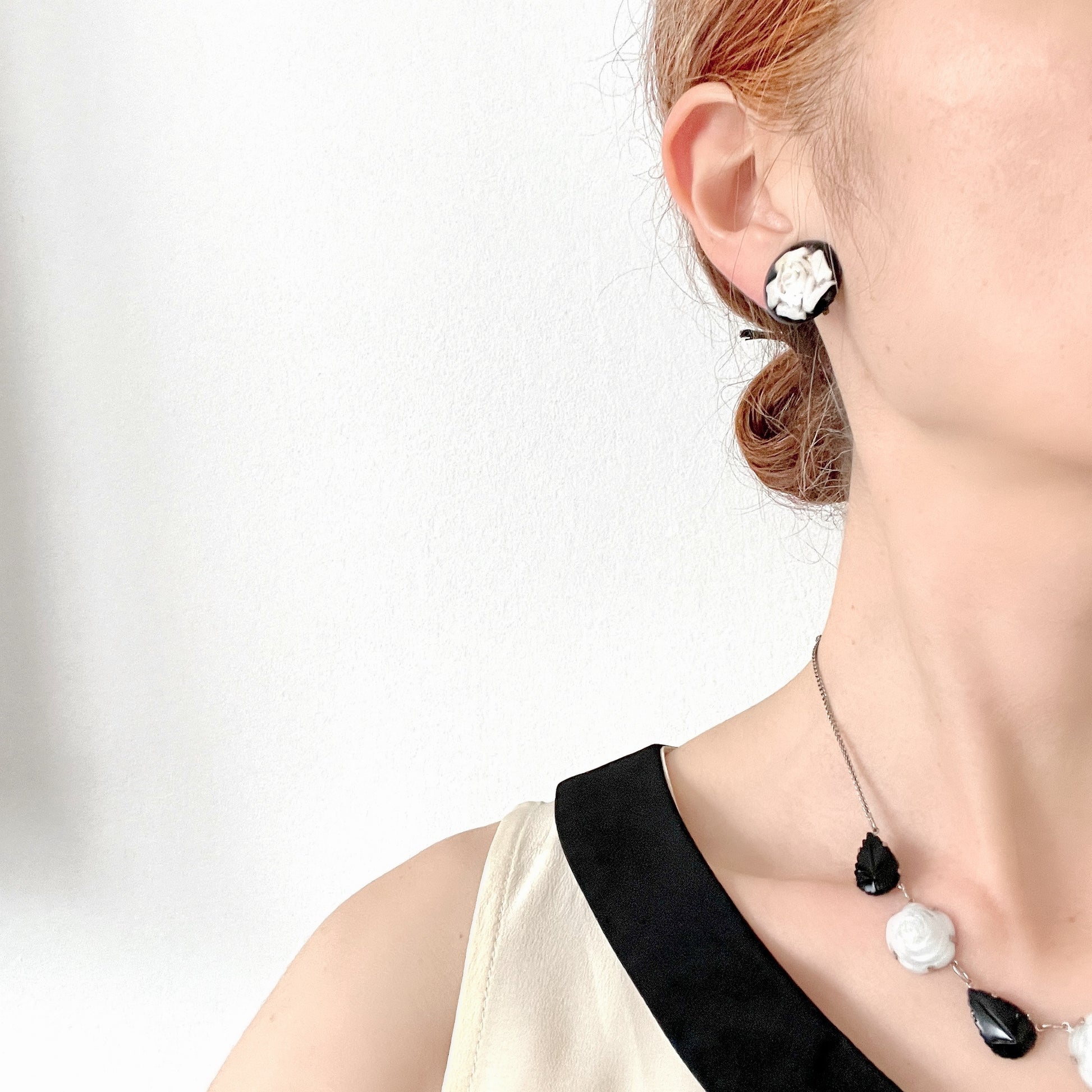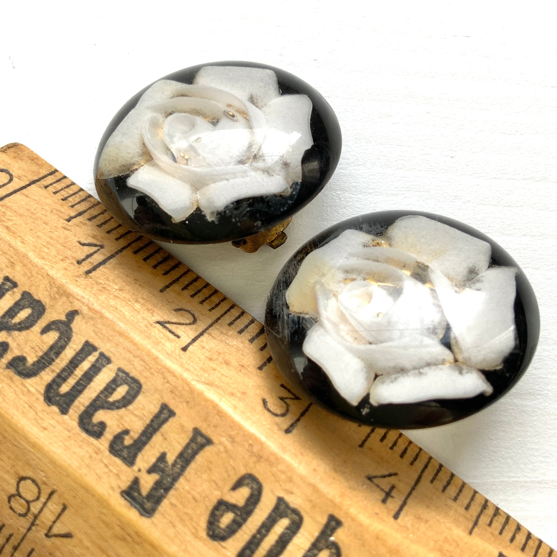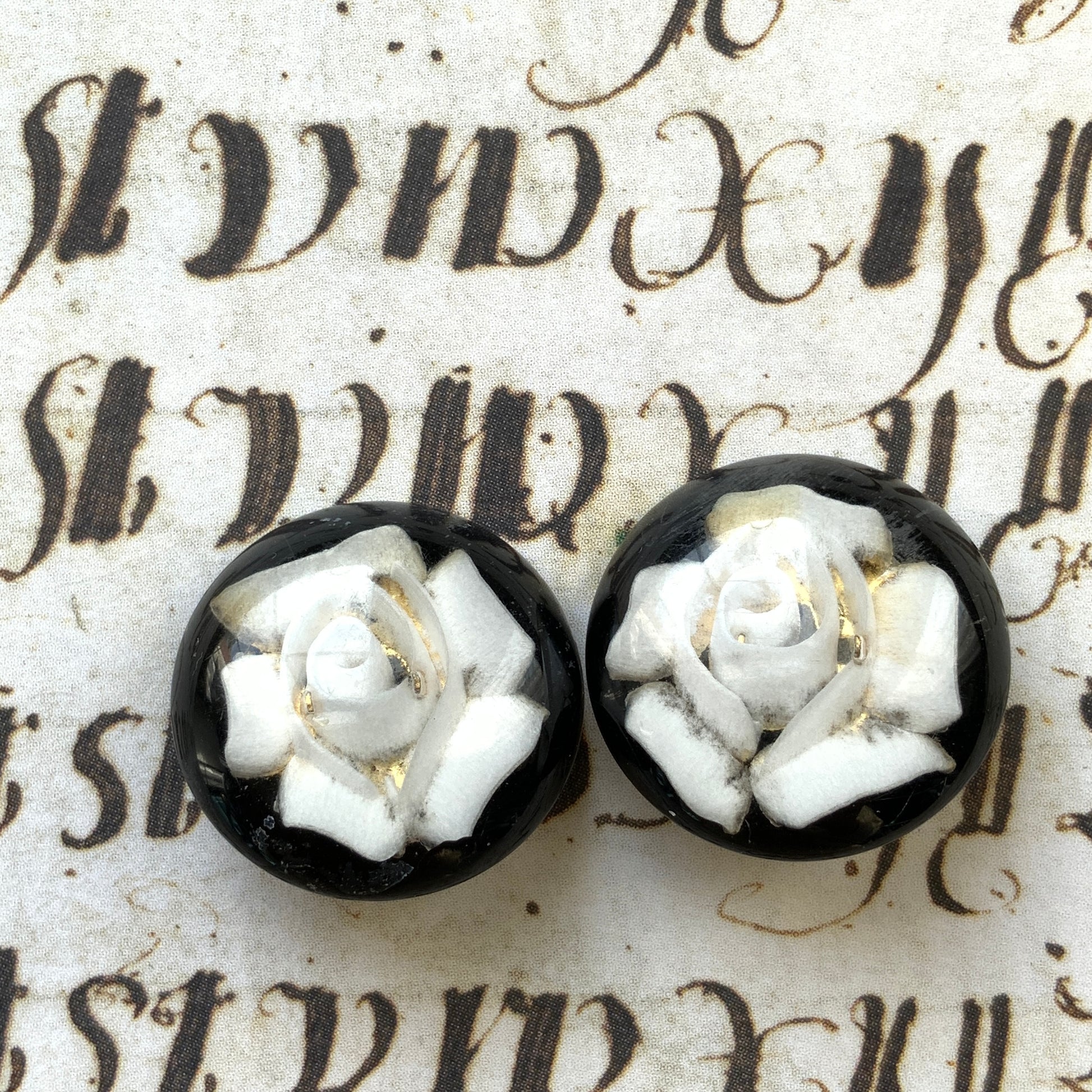 黒地に白バラが裏彫りされたプラスチックドームのクリップイヤリング。
