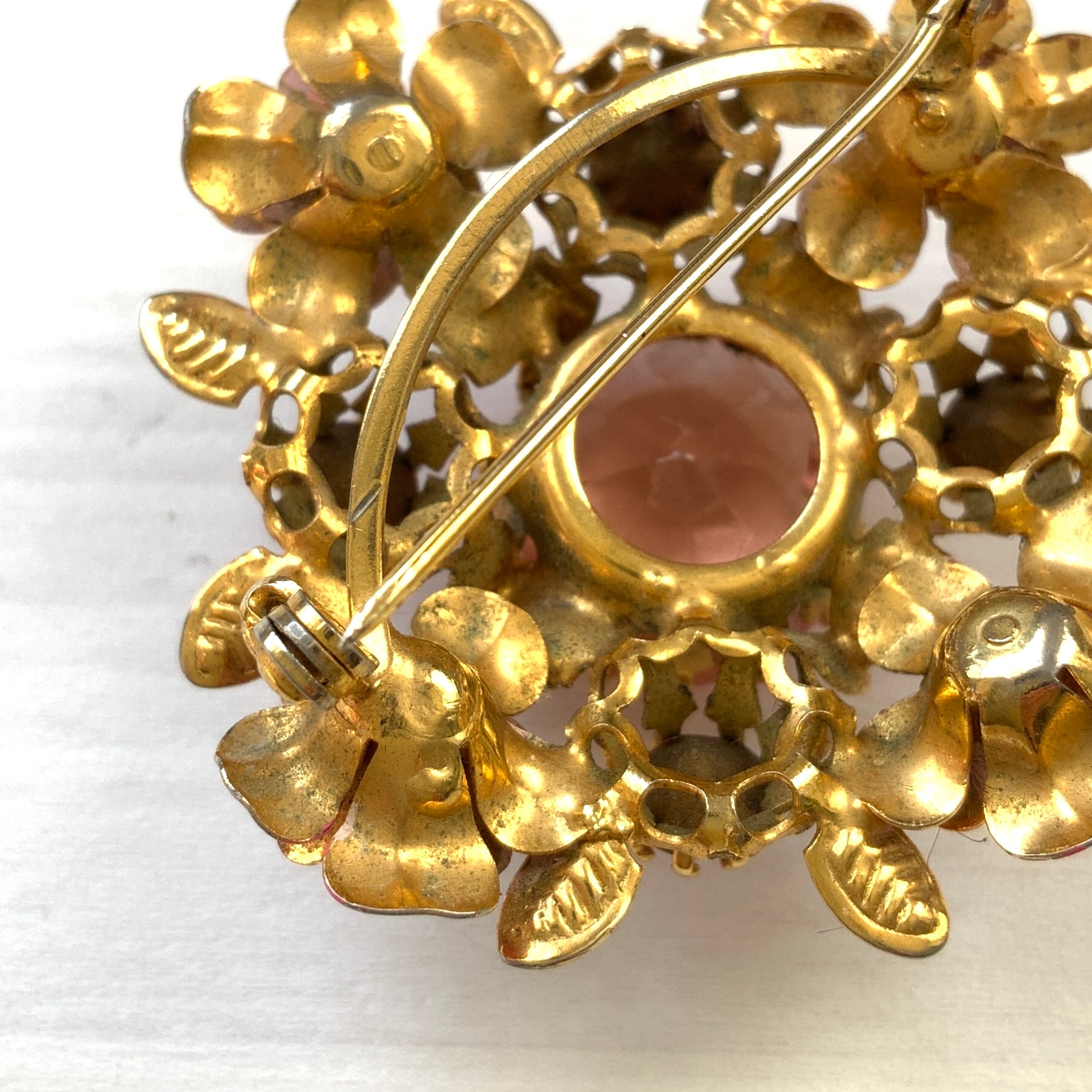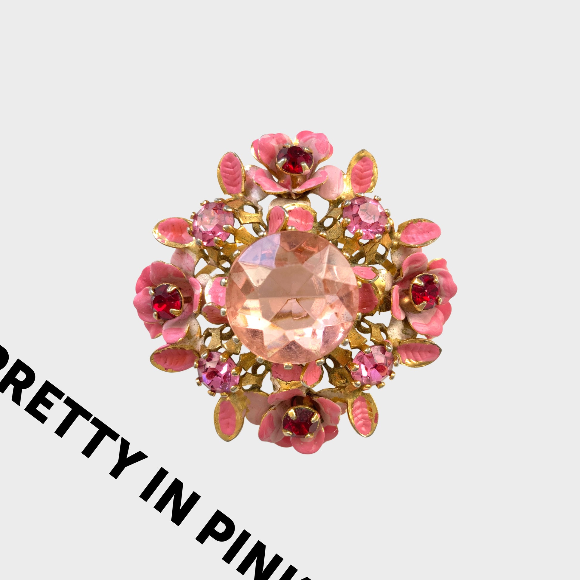 大ぶりのピンクのガラスビジューを中心に、エナメルのフラワーをあしらったブローチ。