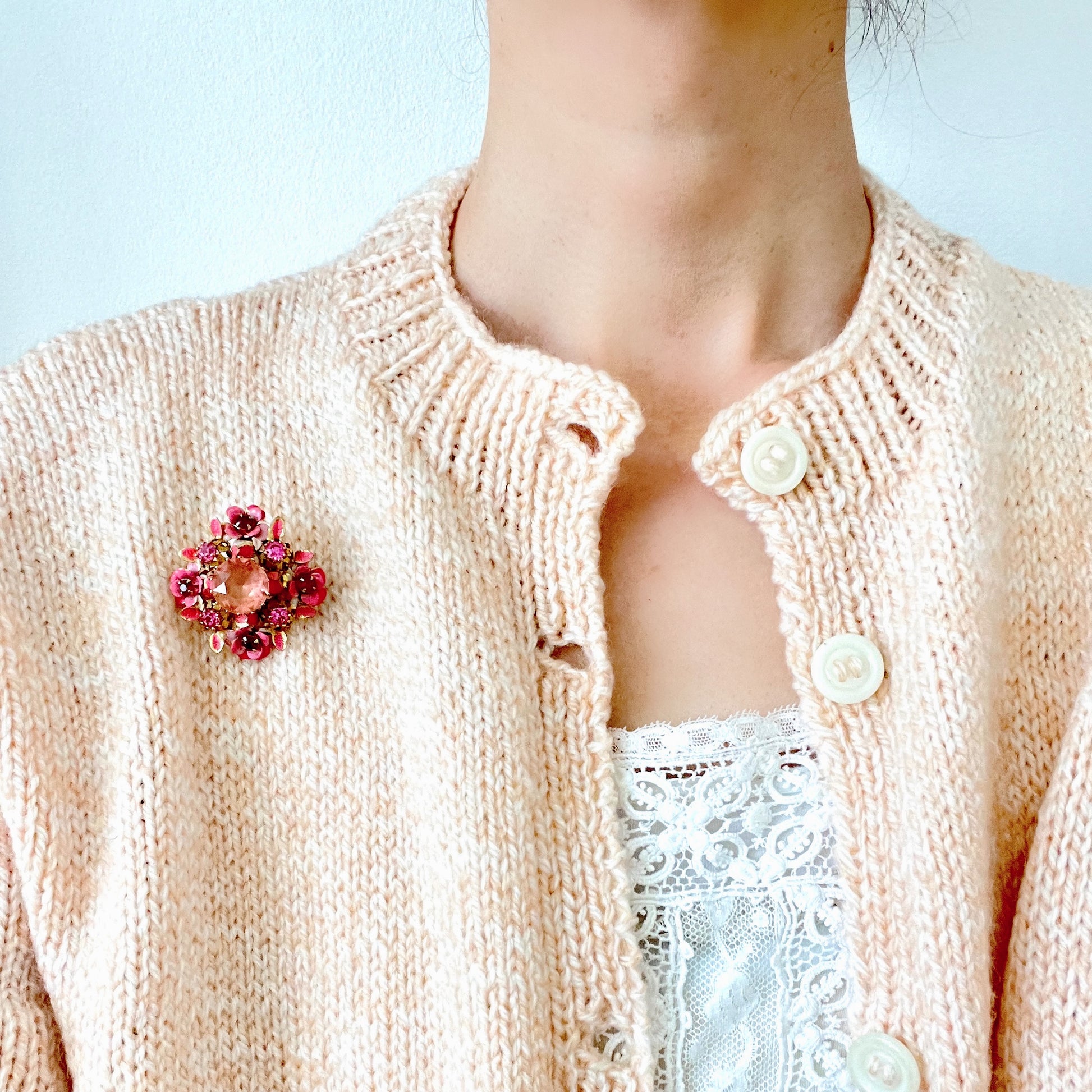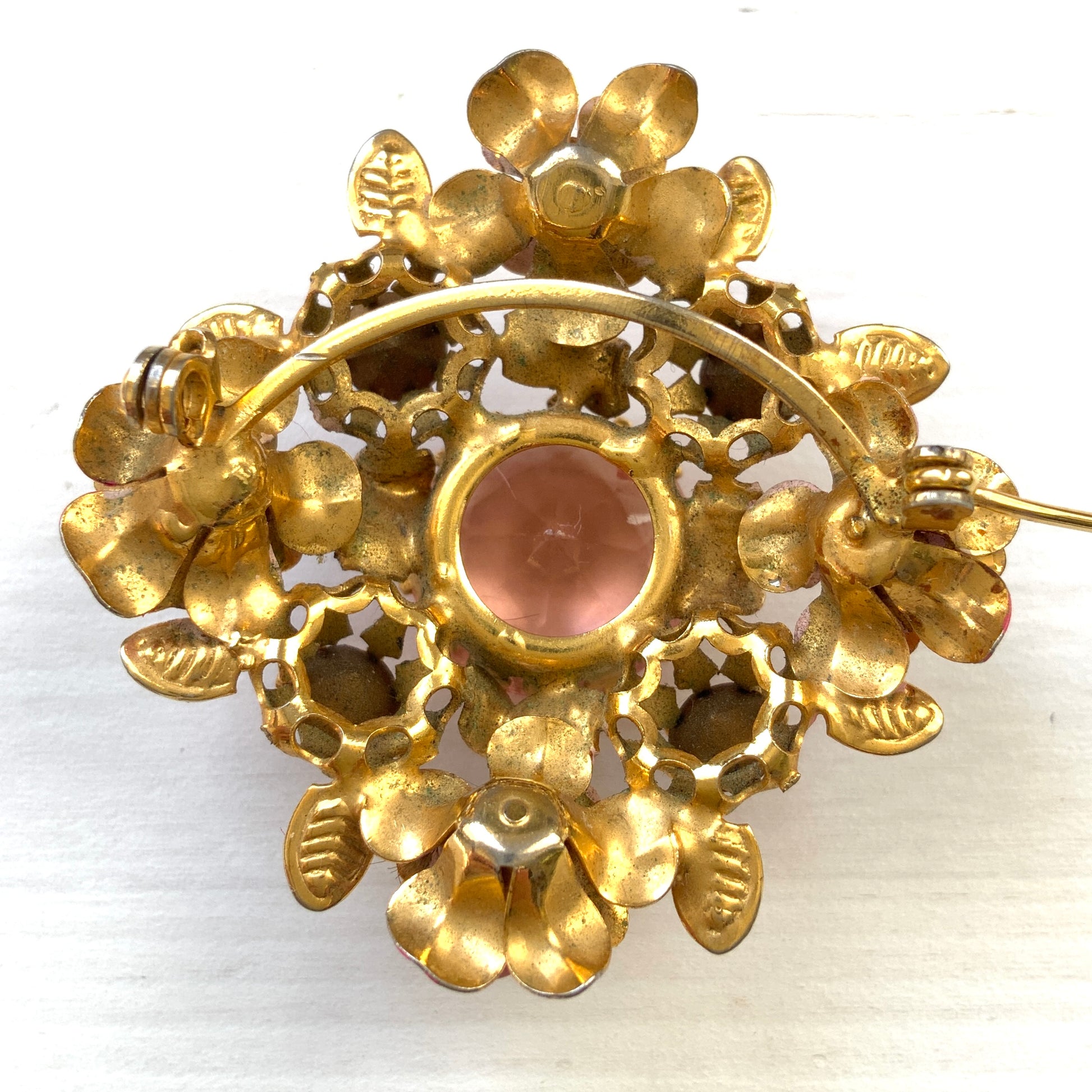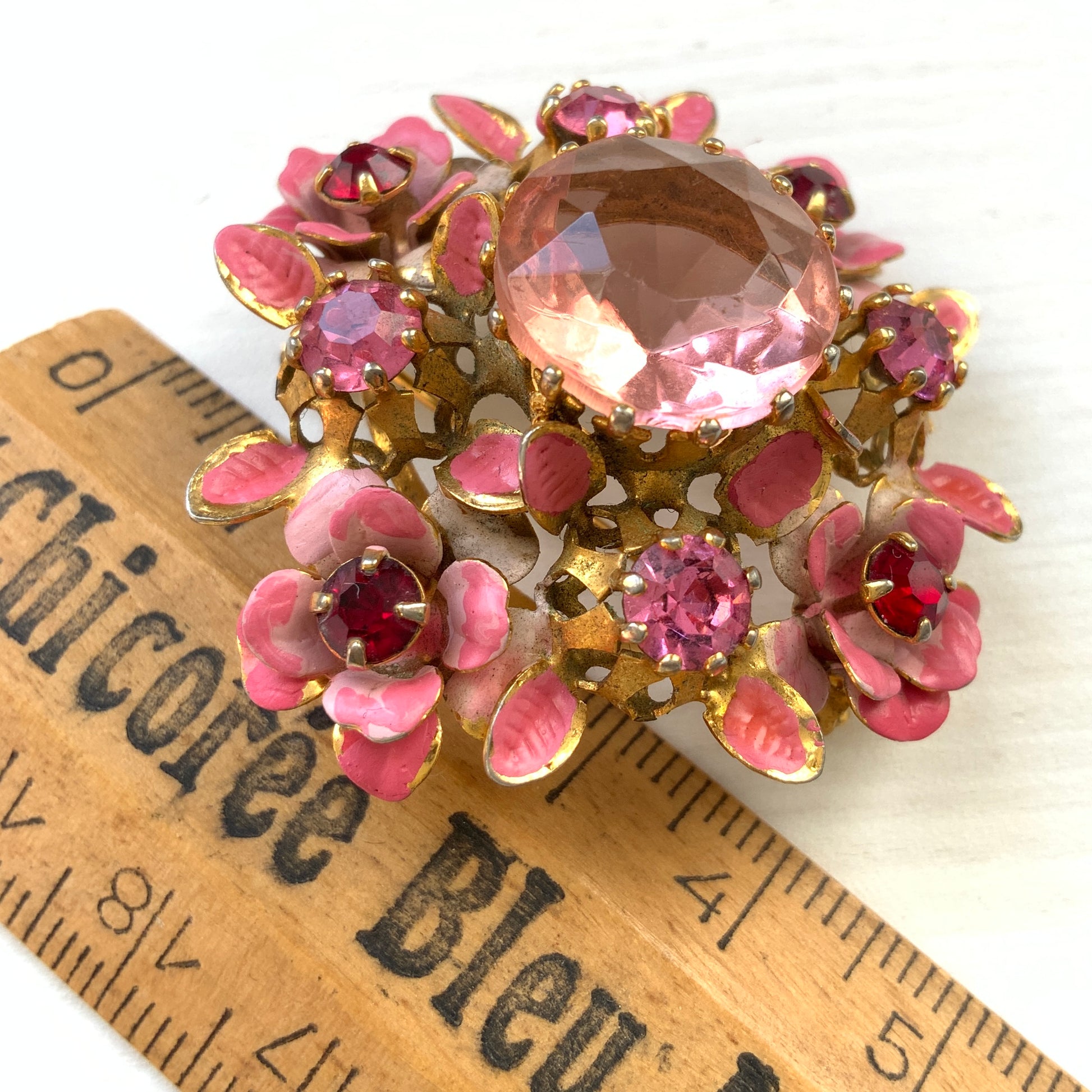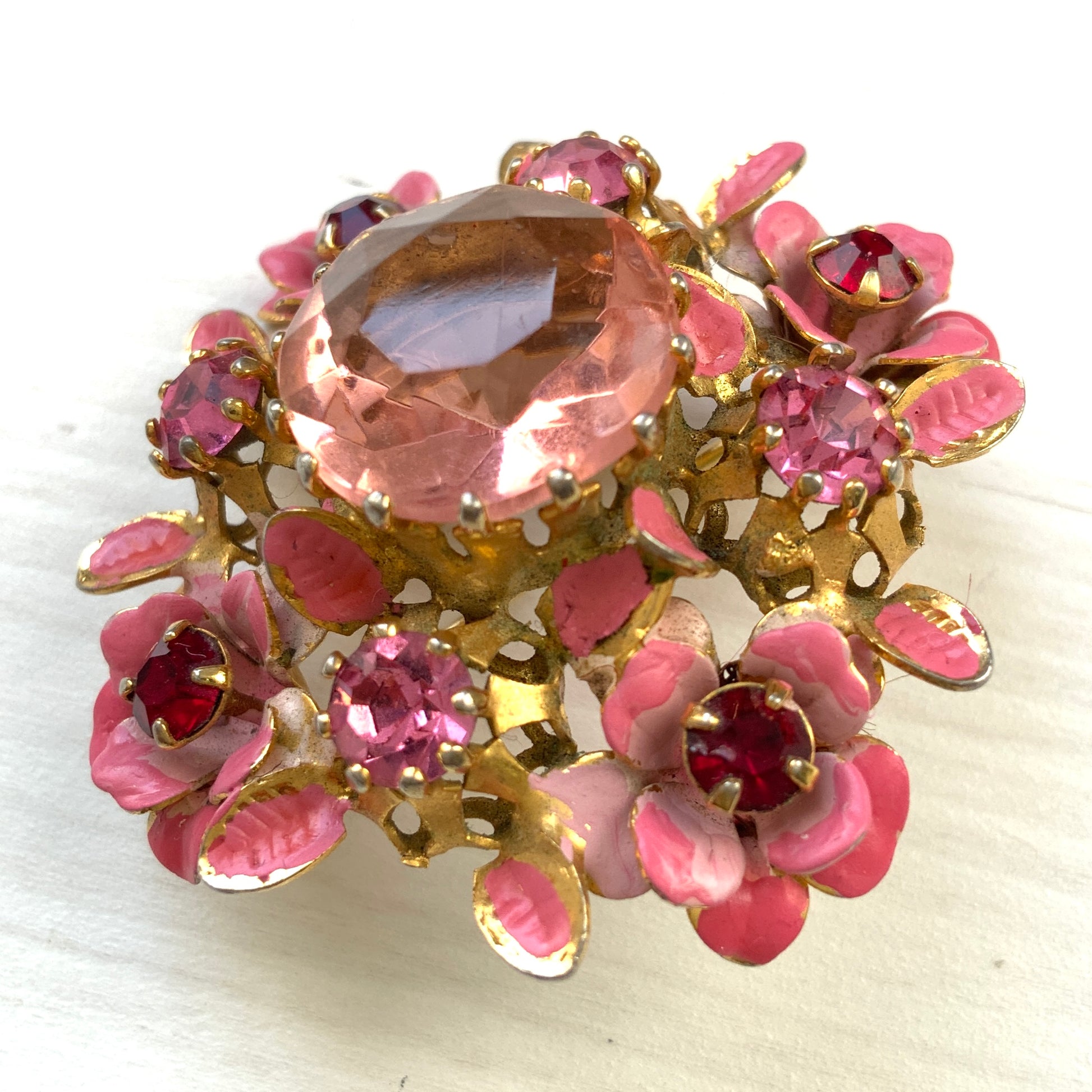 ヴィンテージ 1950年代 ピンクグラスビジュー&エナメルフラワー ブローチ