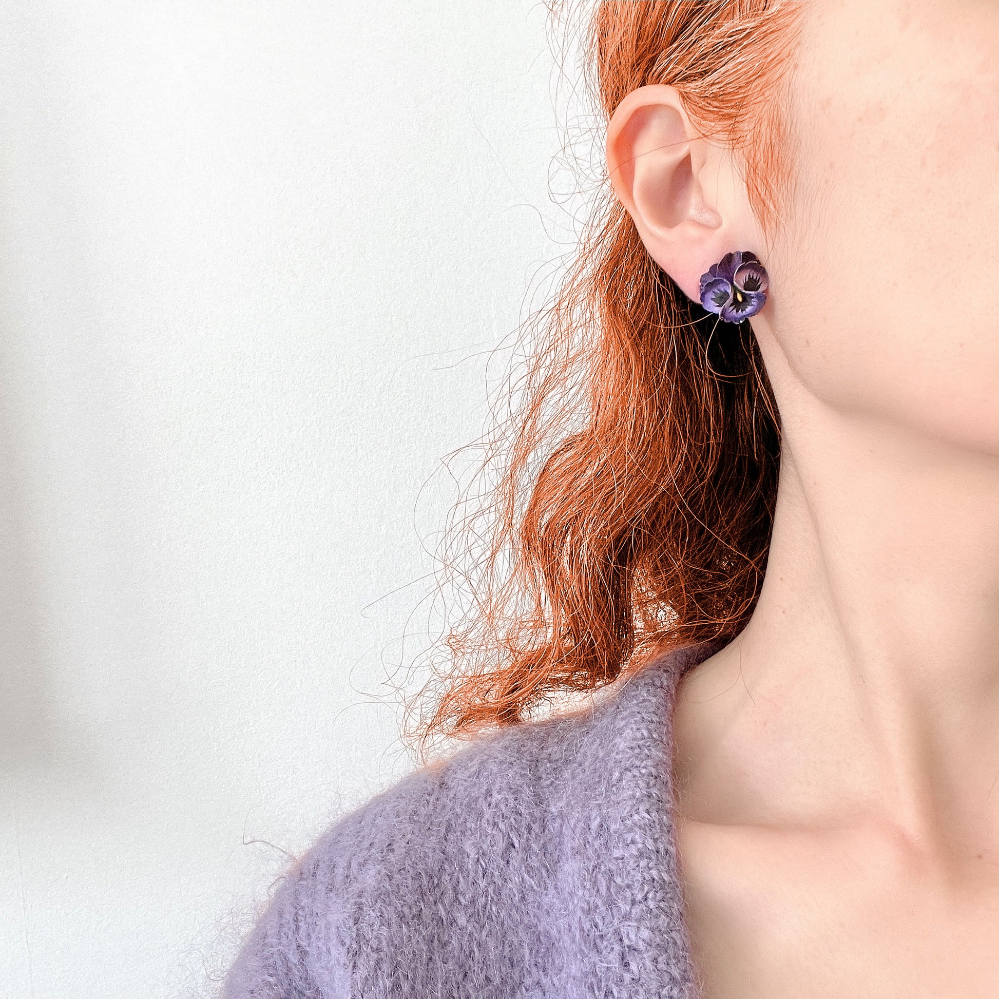 プラスチックでできた小さなかわいらしい紫のパンジー(もしくはビオラ)のクリップイヤリング。