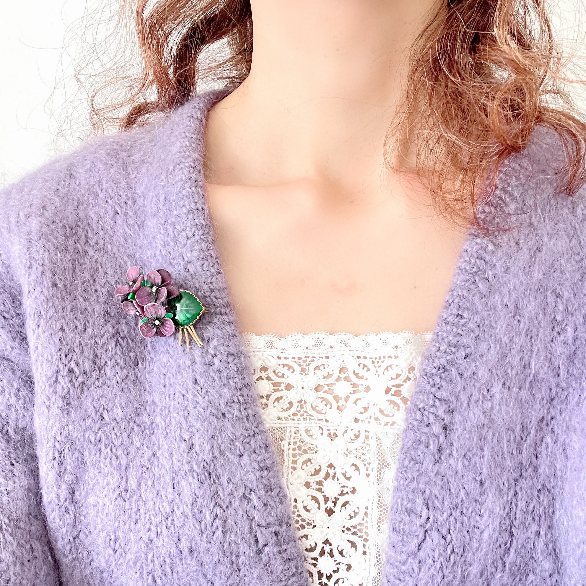 かわいらしいプラスチックのスミレのブローチ。