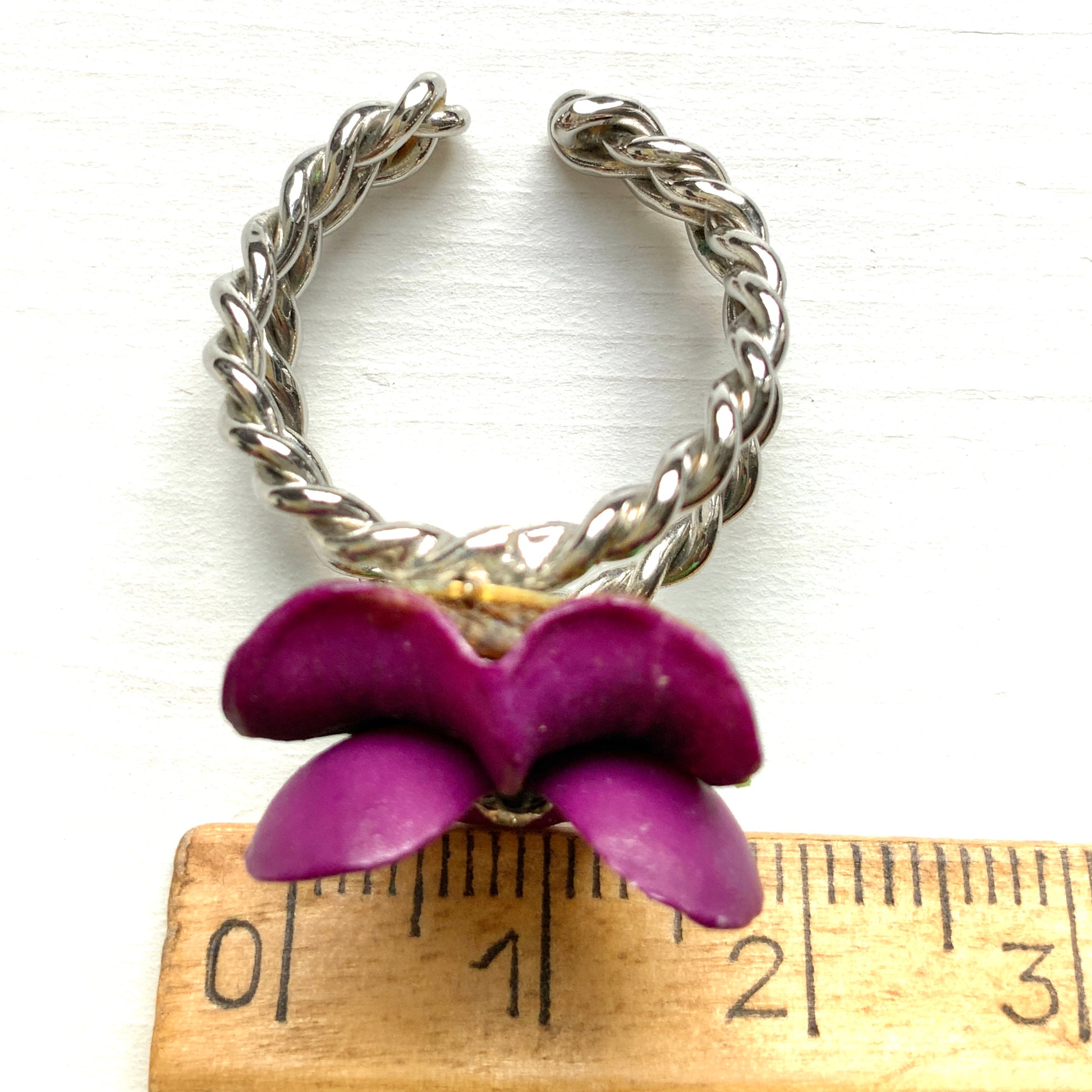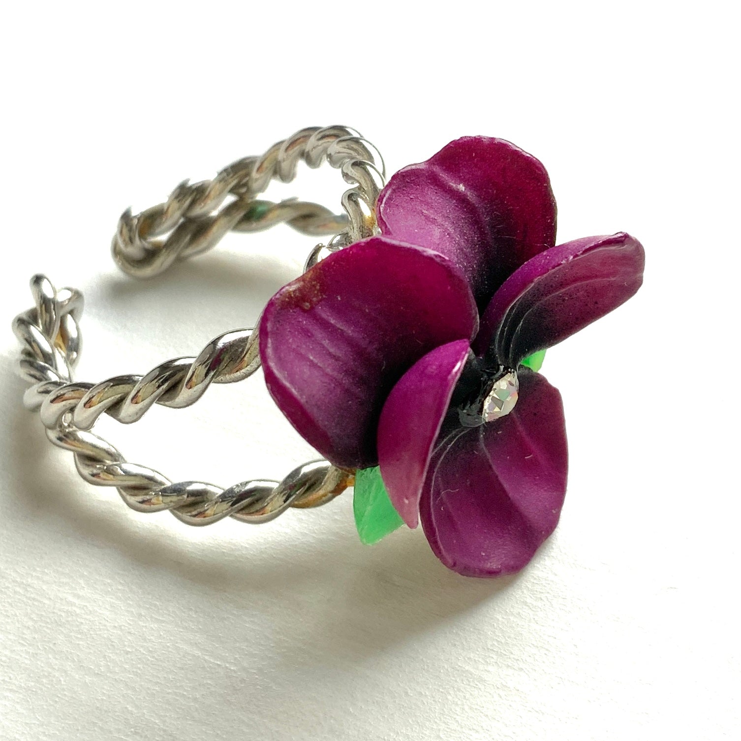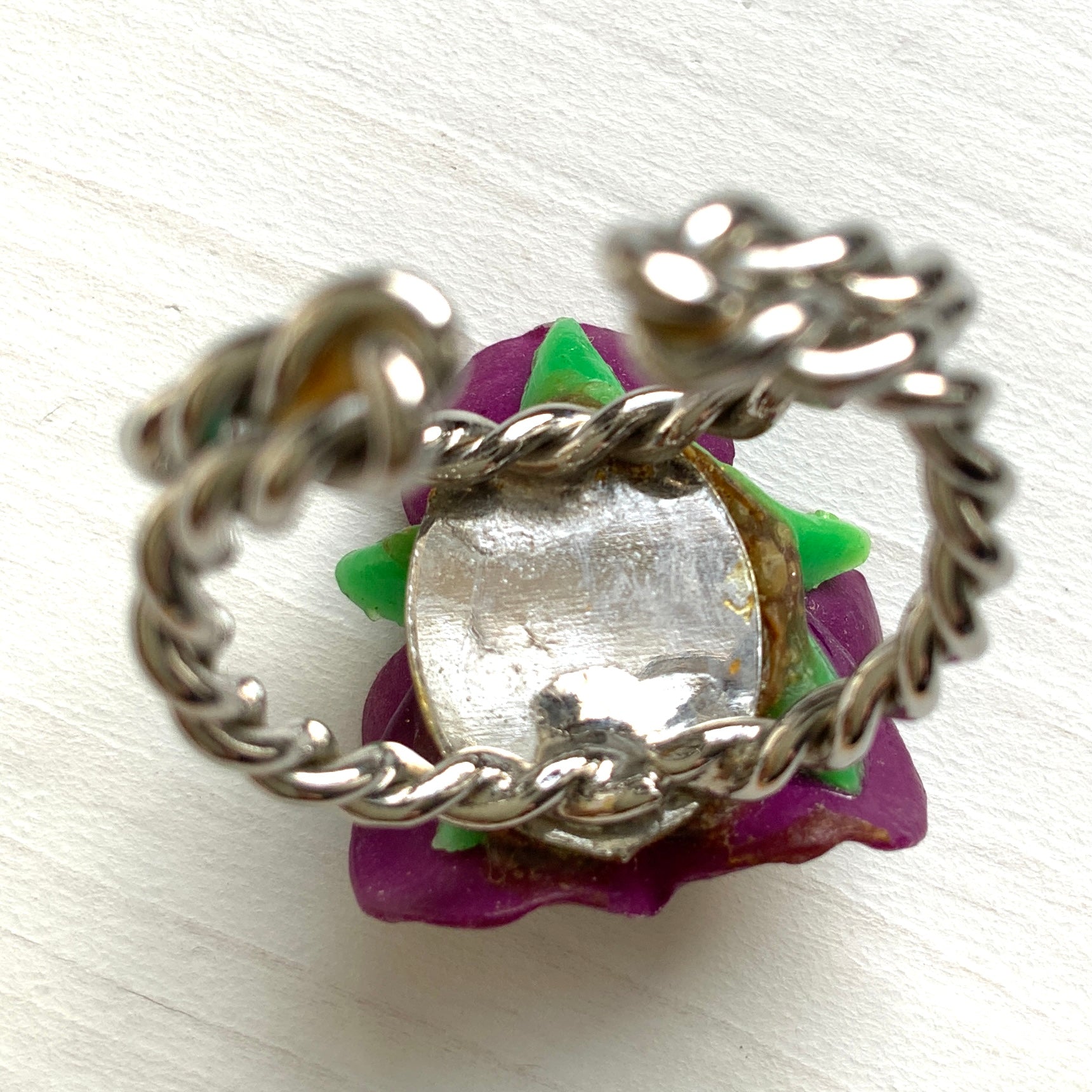 かわいらしいプラスチックのスミレがついたフリーサイズリング。