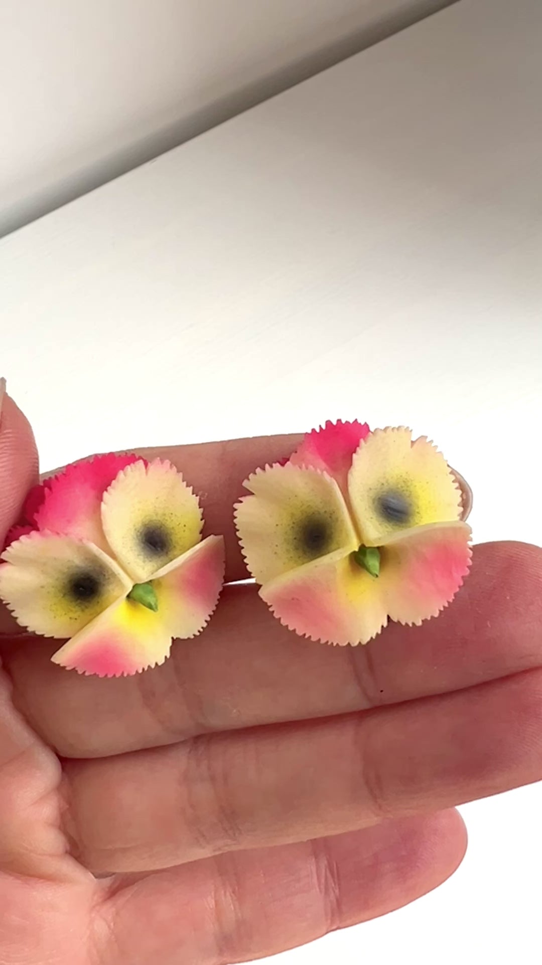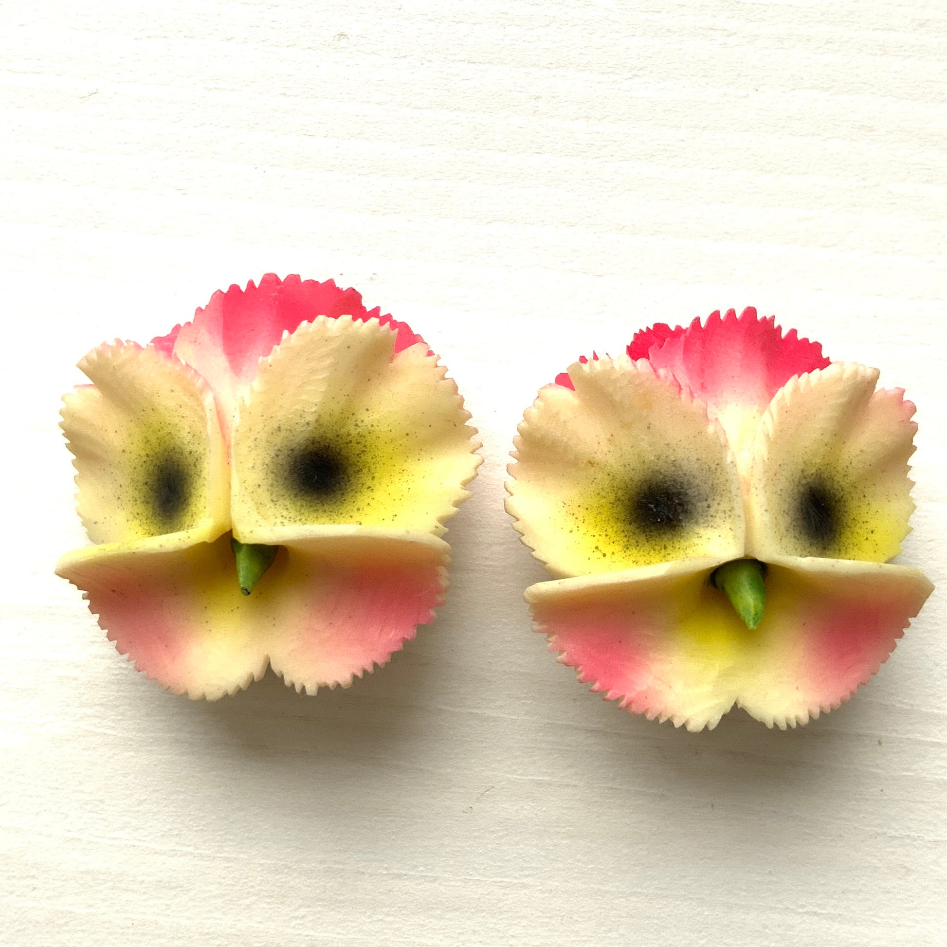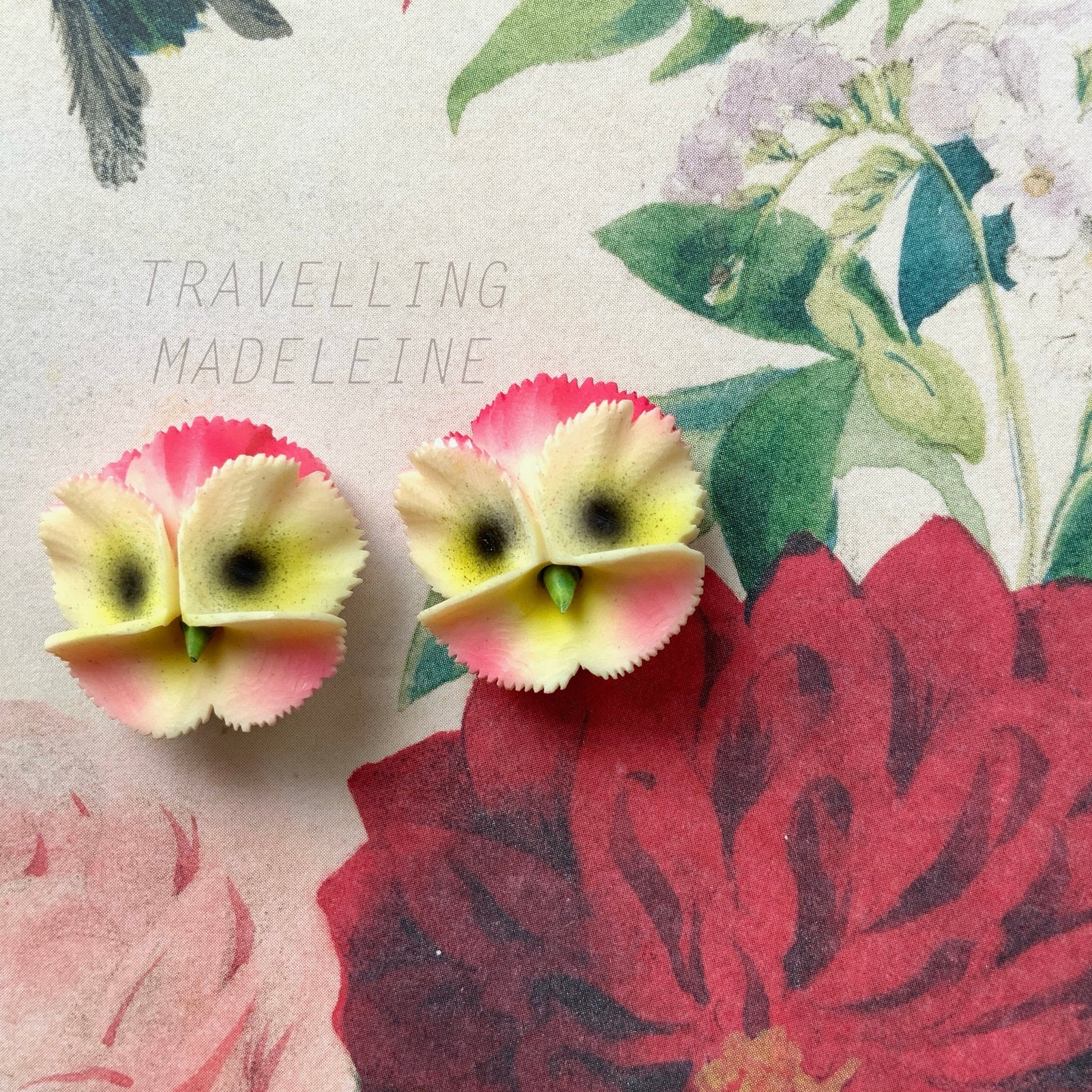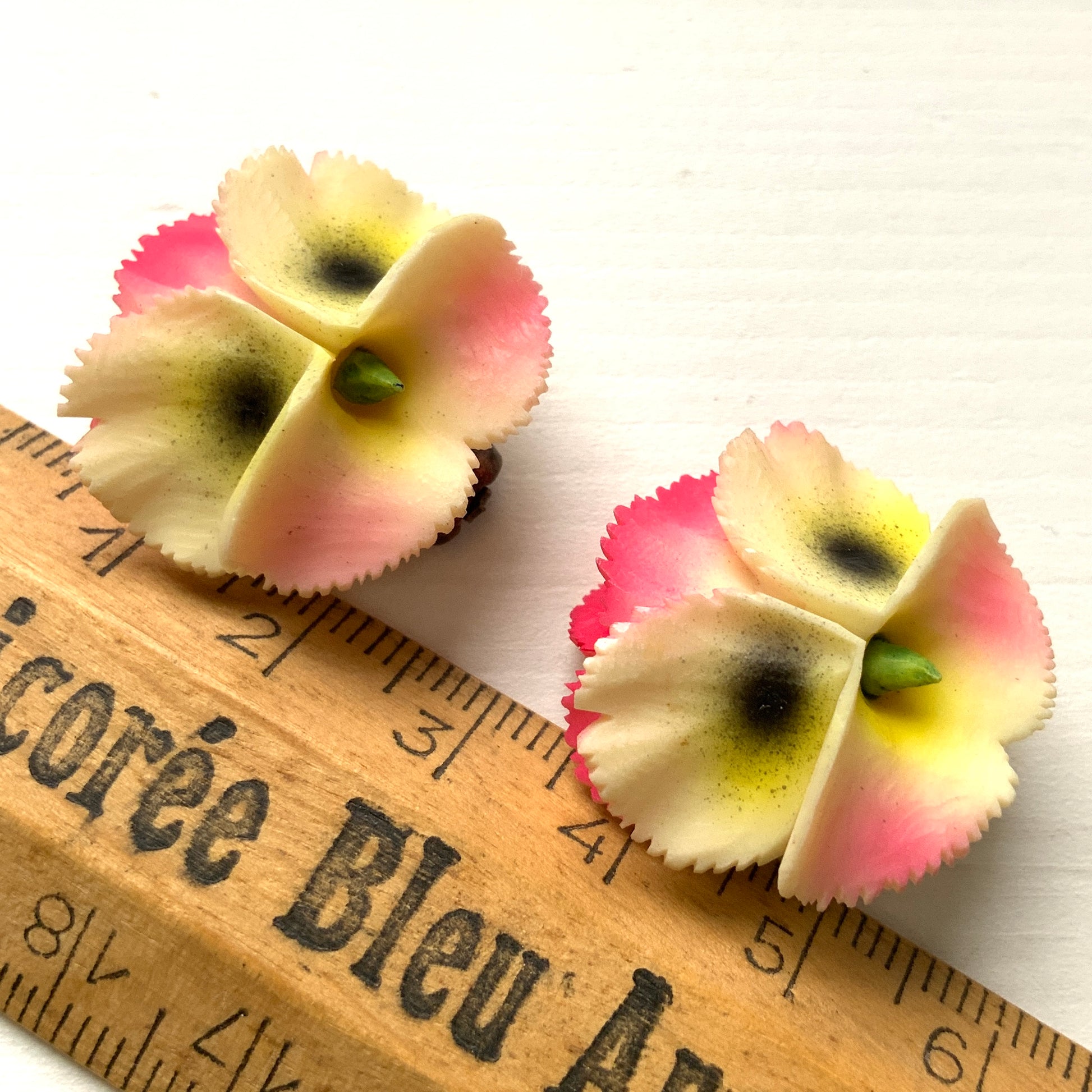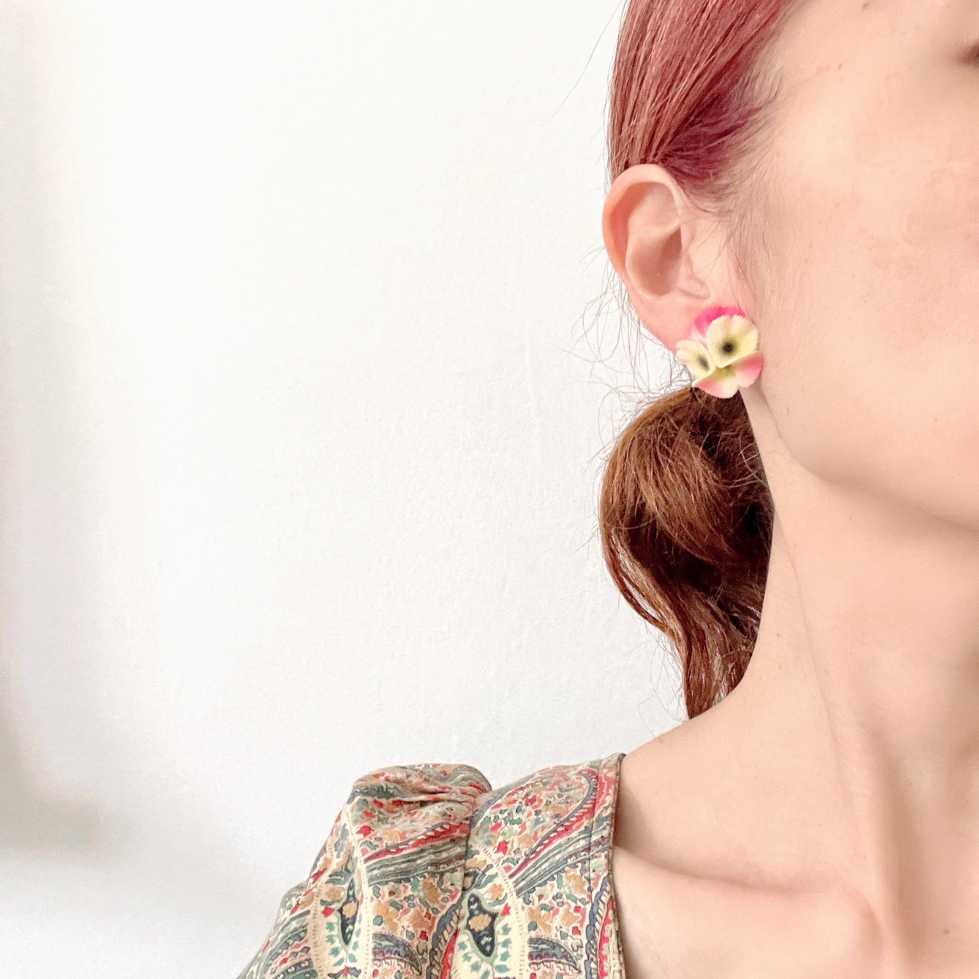 セルロイドで作られたピンクのパンジーのイヤリング。
