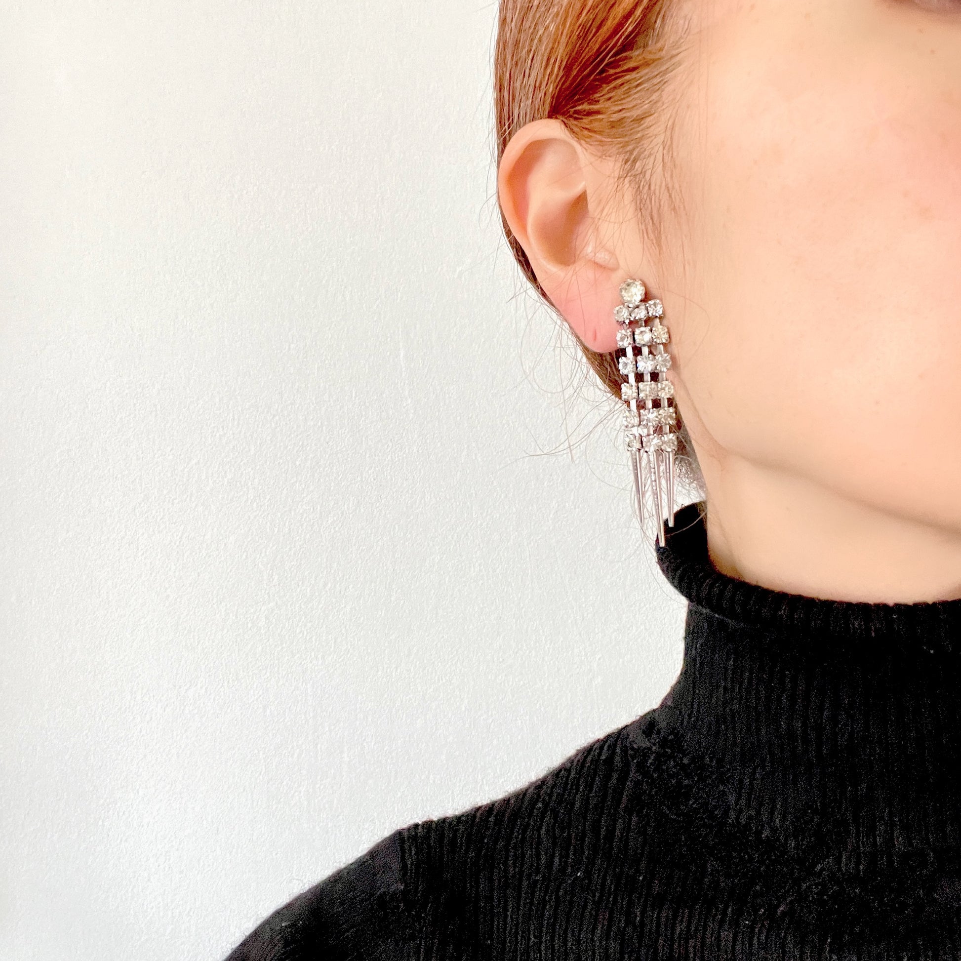 トーンのシャープなスパイクがラインストーンとともに揺れるシルバークリップイヤリング。