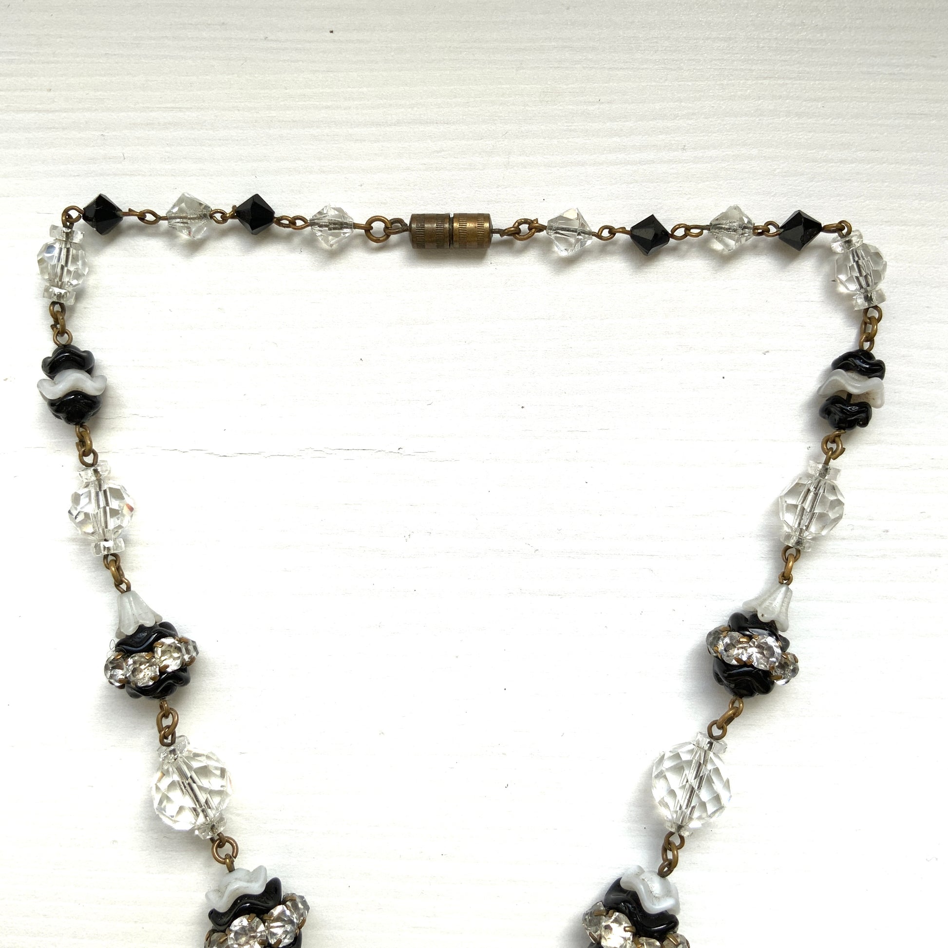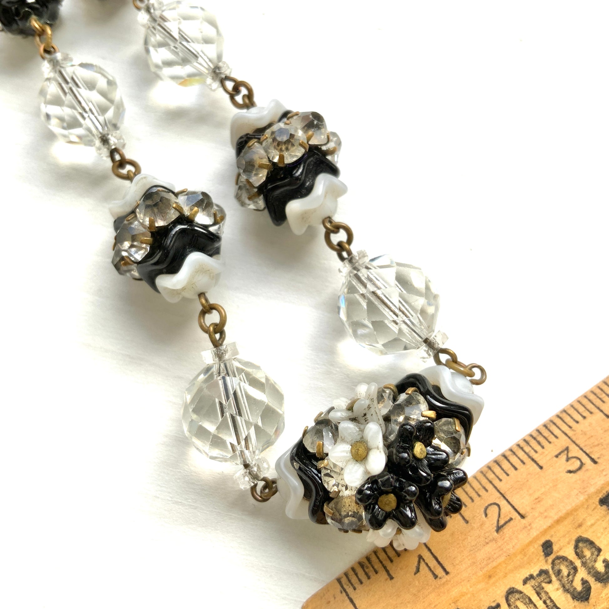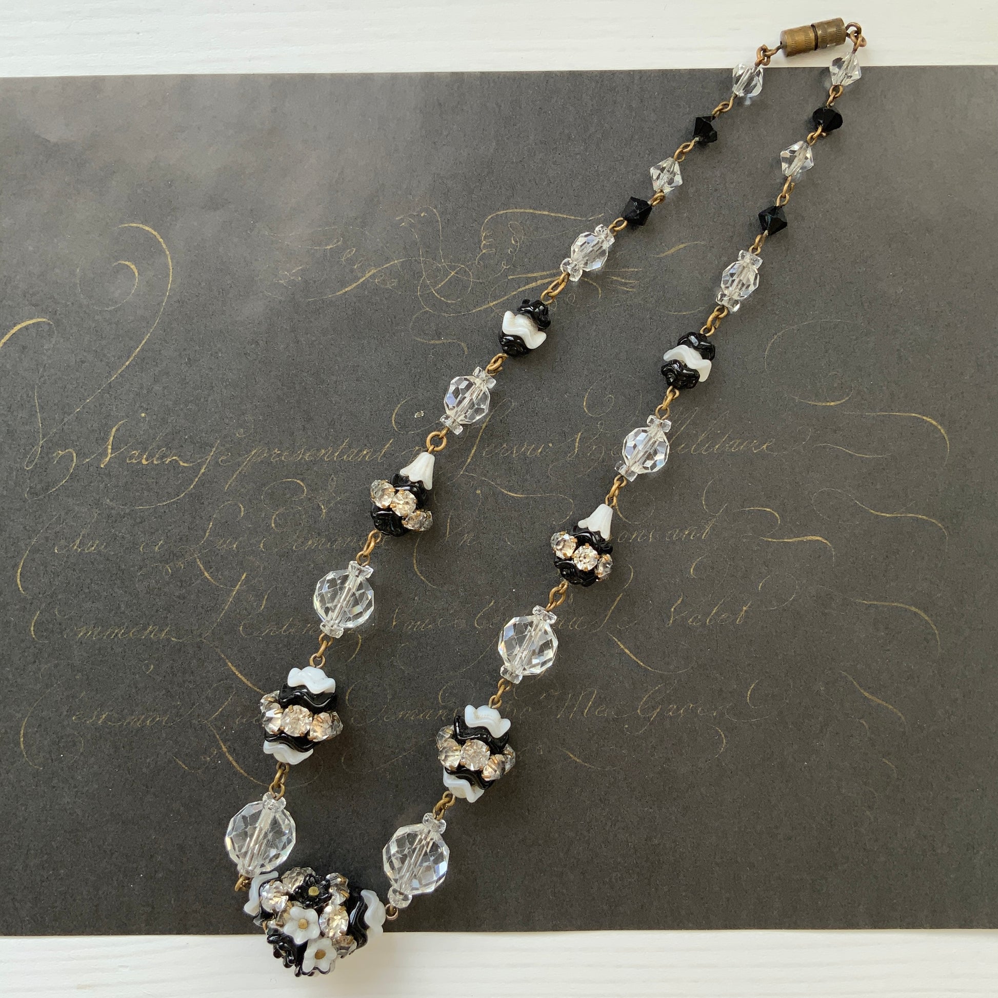 ヴィンテージ アールデコ クリア・ブラック・ホワイト グラスビーズ、ラインストーン、グラスフラワーネックレス