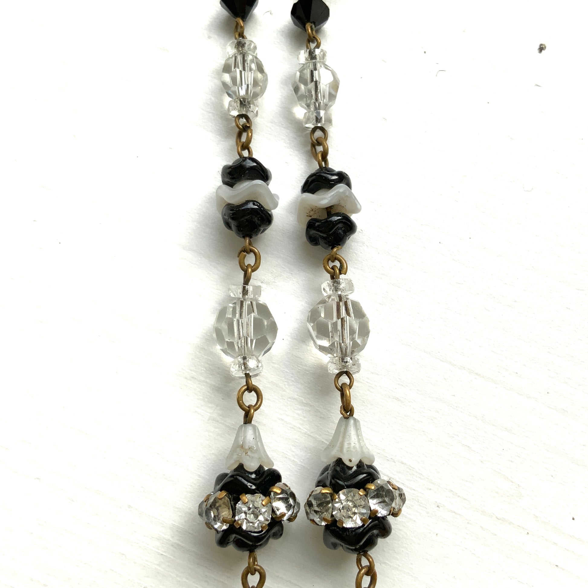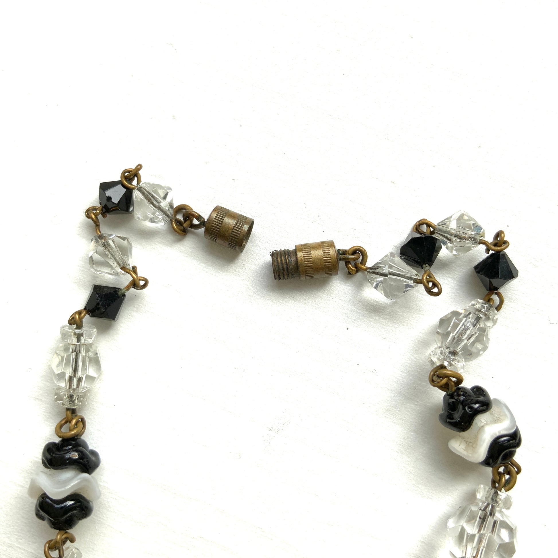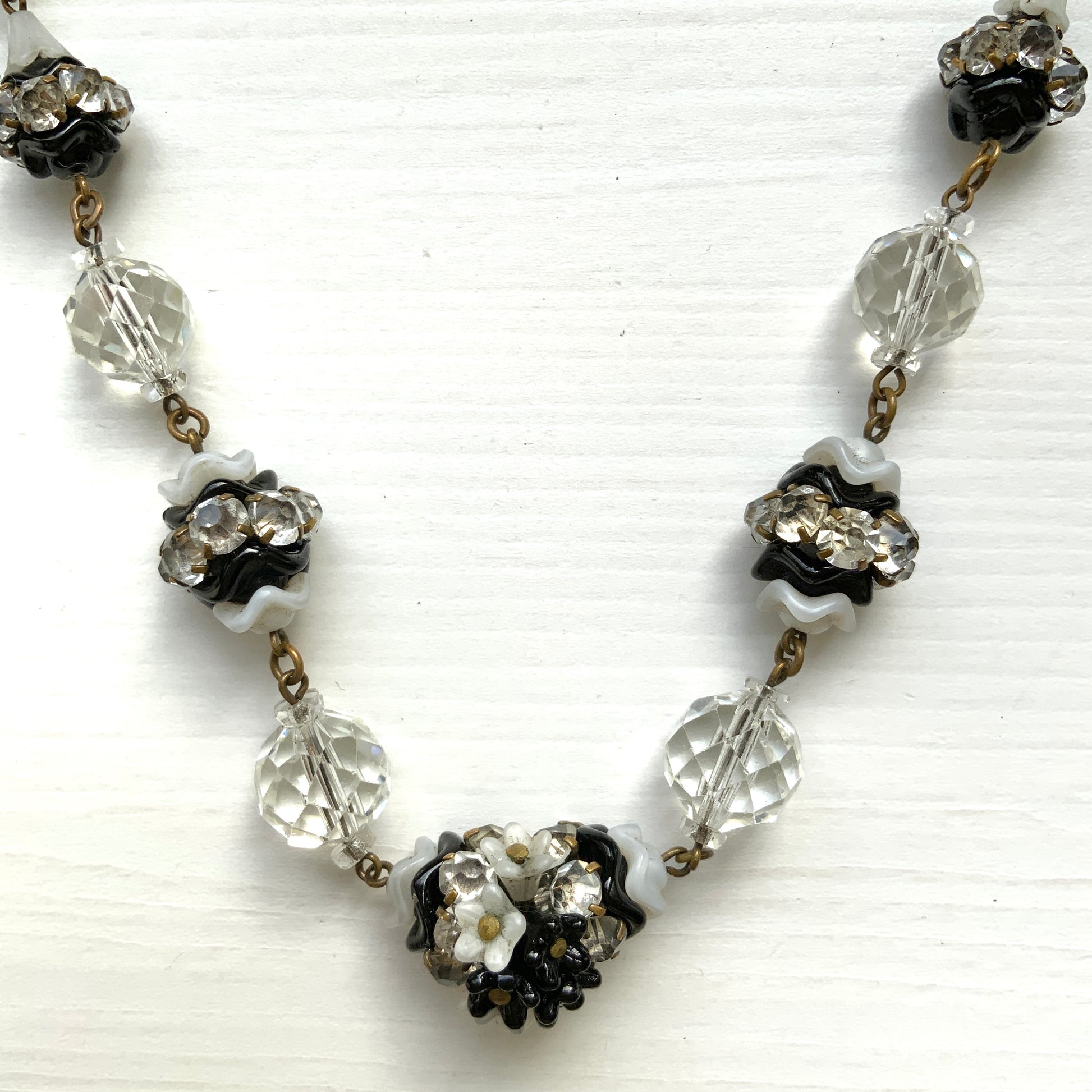 ヴィンテージ アールデコ クリア・ブラック・ホワイト グラスビーズ、ラインストーン、グラスフラワーネックレス