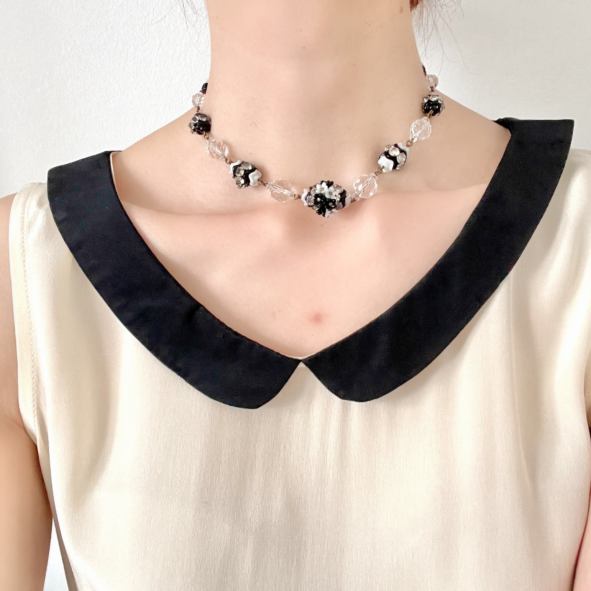 クリアのクリスタルビーズと、ブラックグラス、ホワイトサテングラスのビーズ、そしてラインストーンを使った華やかなネックレス。