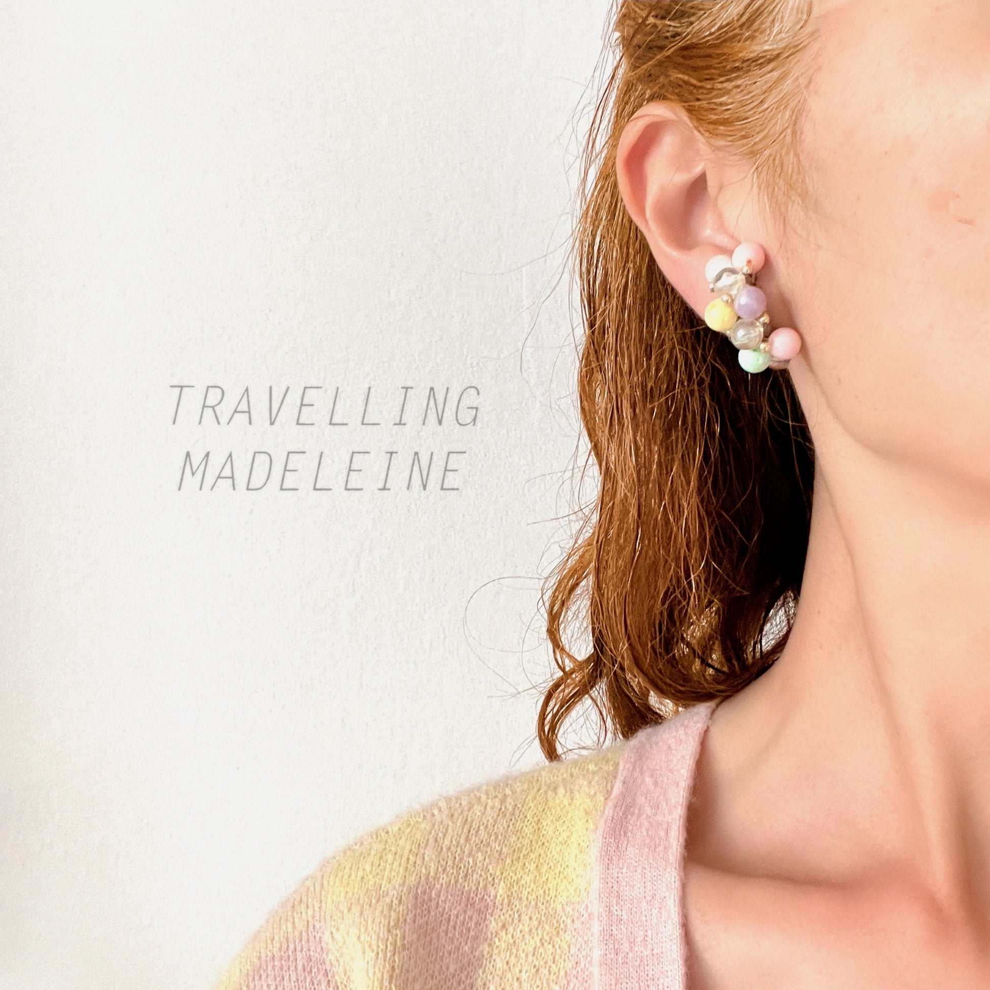 カラフルなプラスチックビーズがハーフフープになったクリップイヤリング。