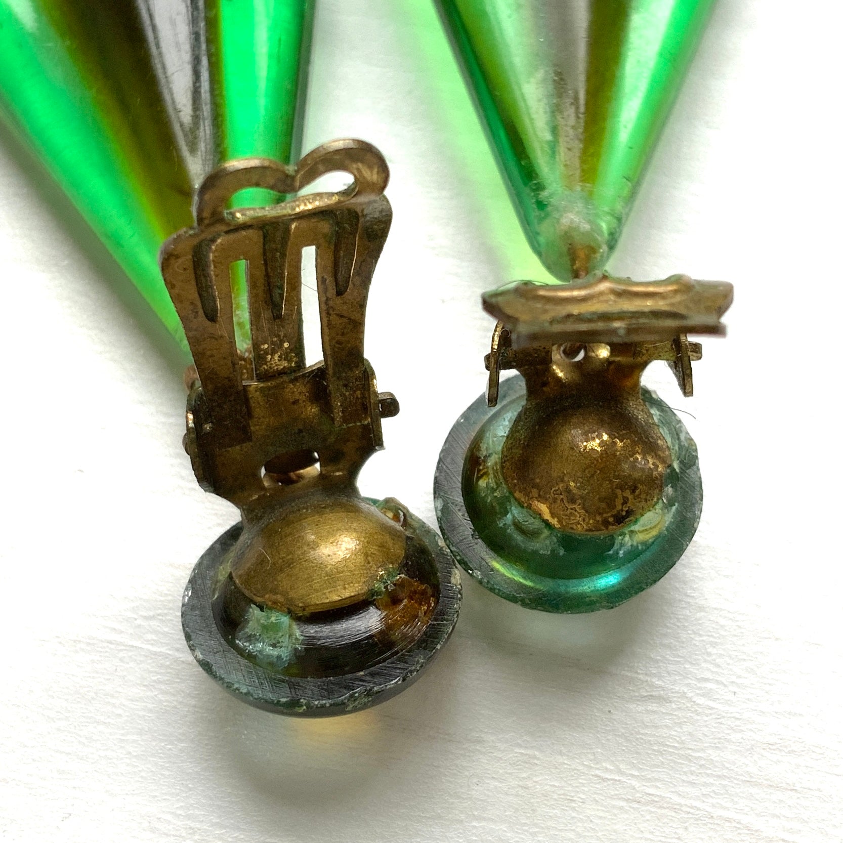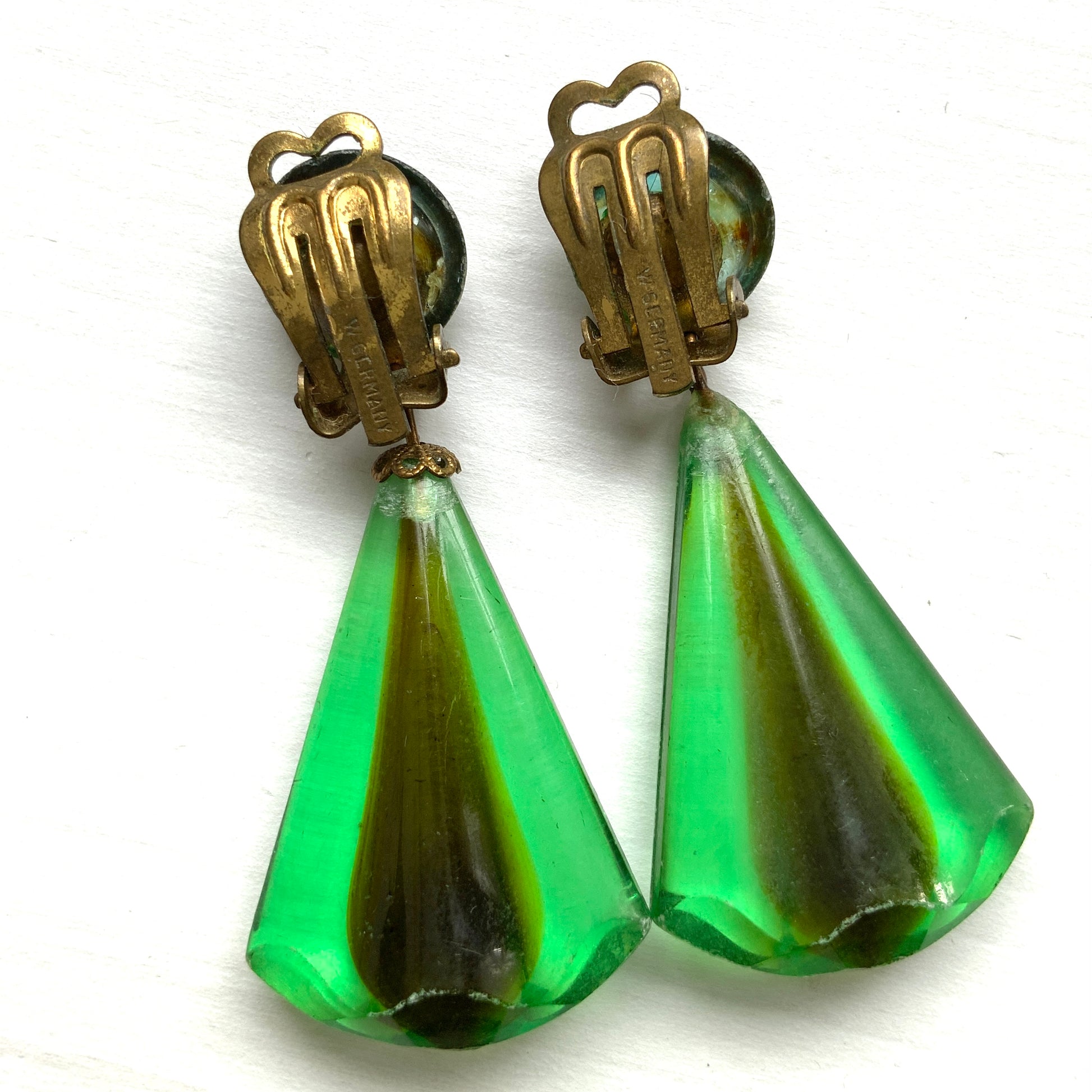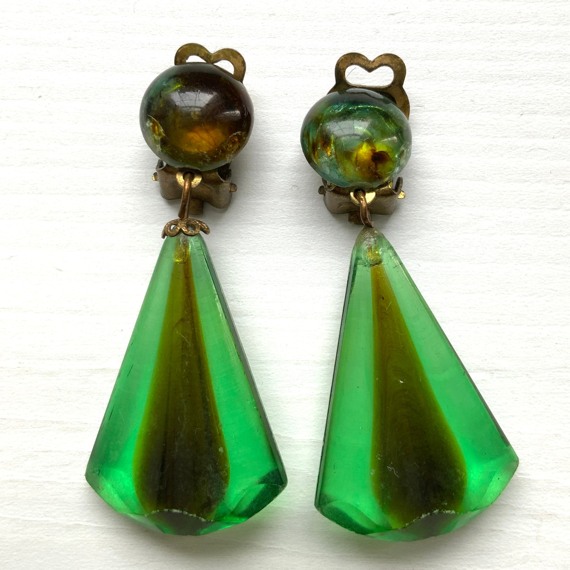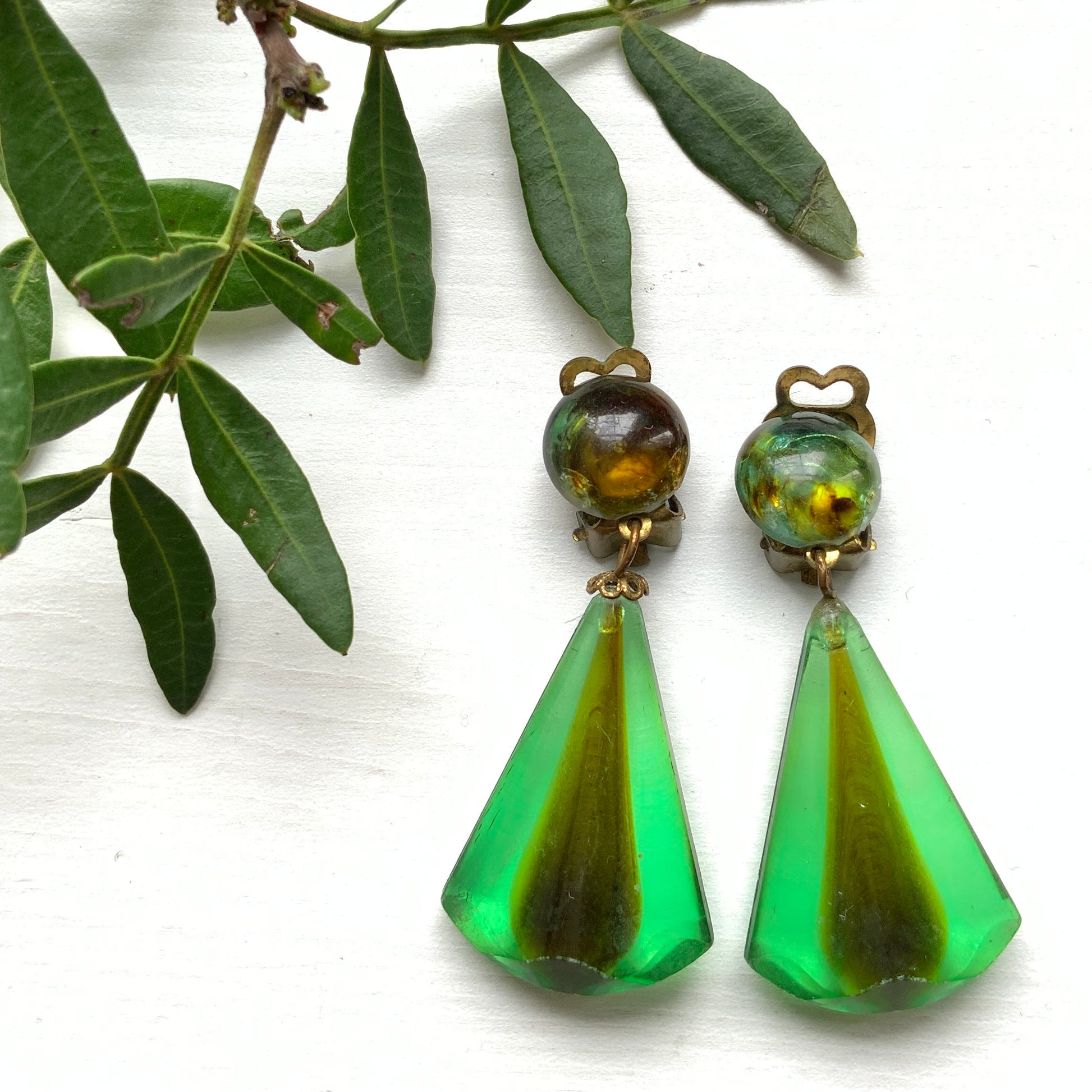 ヴィンテージ 1960年代 グリーン&アンバー バイカラープラスチック トライアングル クリップイヤリング