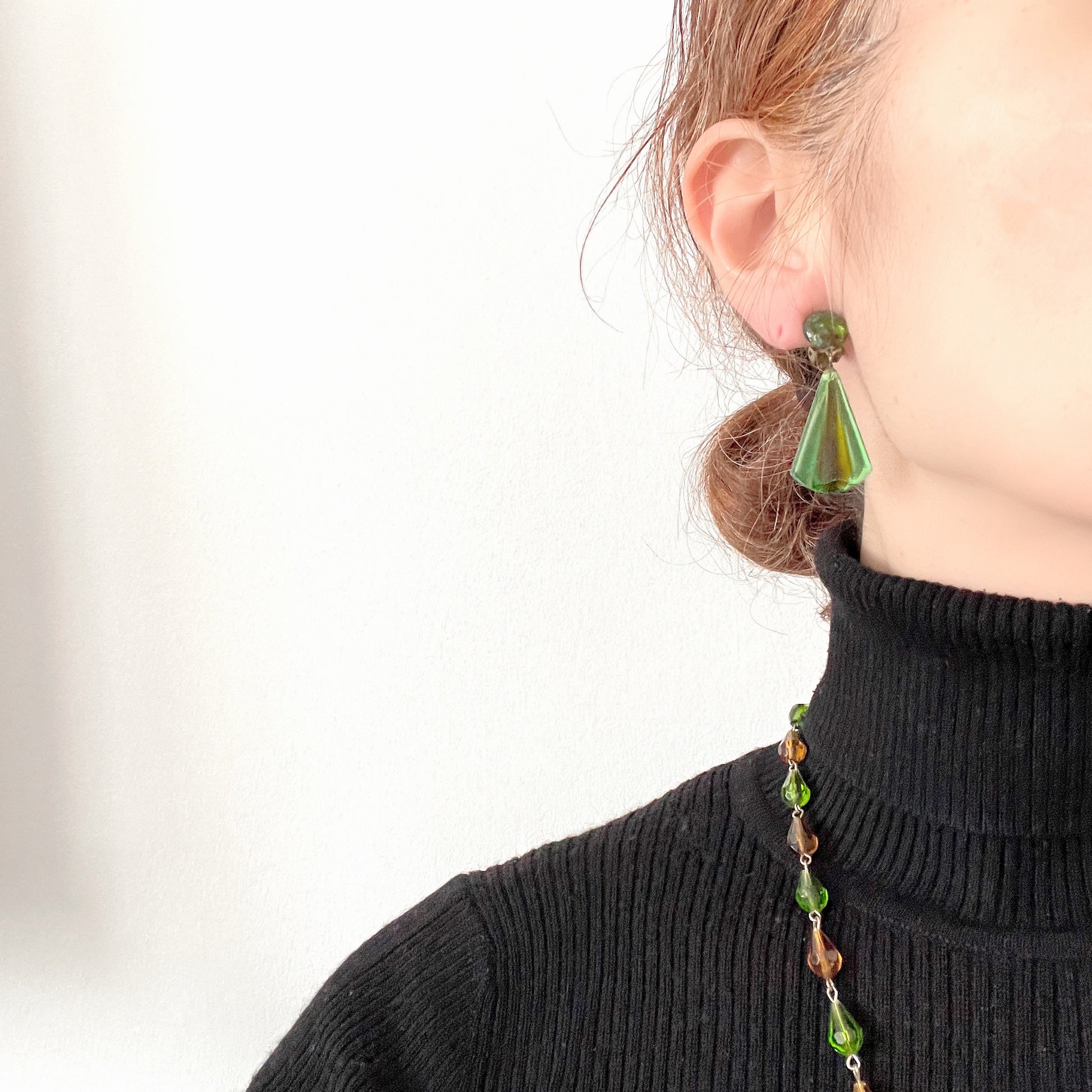 グリーンにアンバーカラーが入ったバイカラーのプラスチックトライアングルが揺れるクリップイヤリング。