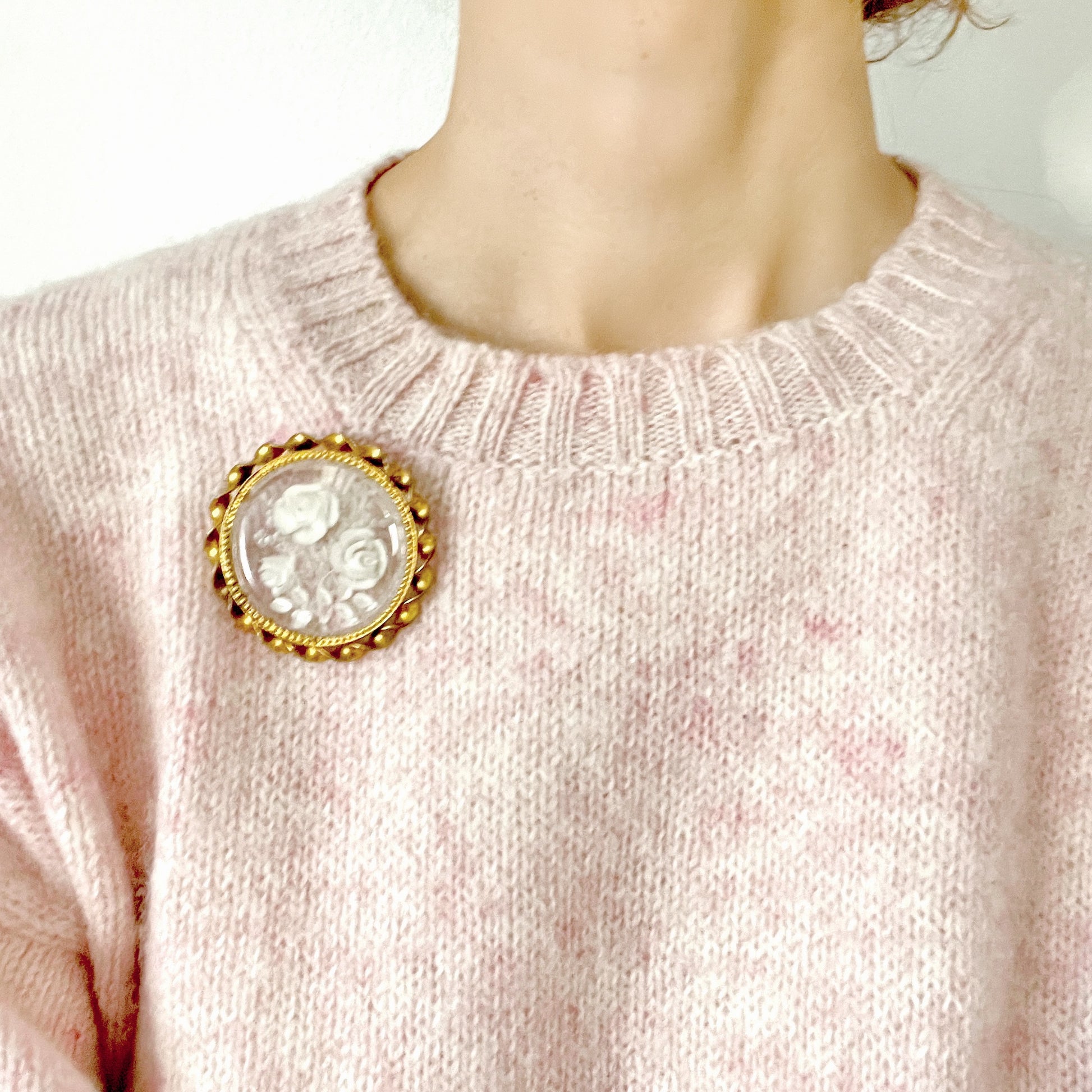 美しいバラの枝と、ホワイトベリーのような白い実のプラスチックのインタリオ(裏彫り)のブローチ 。