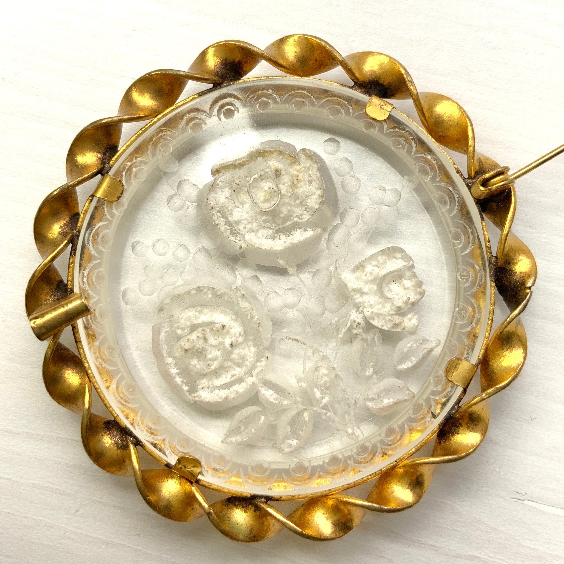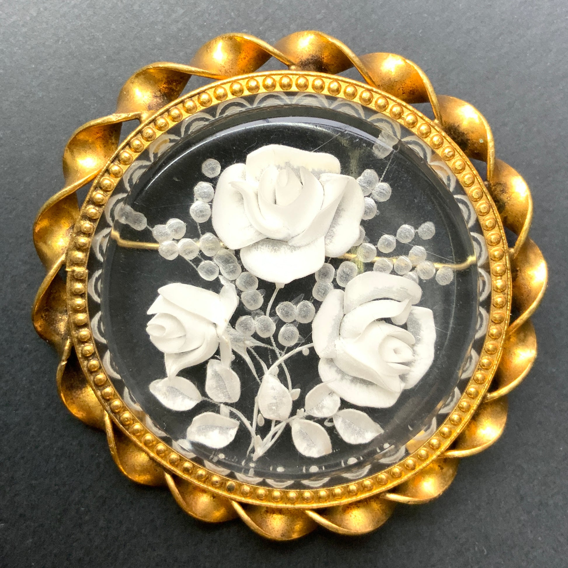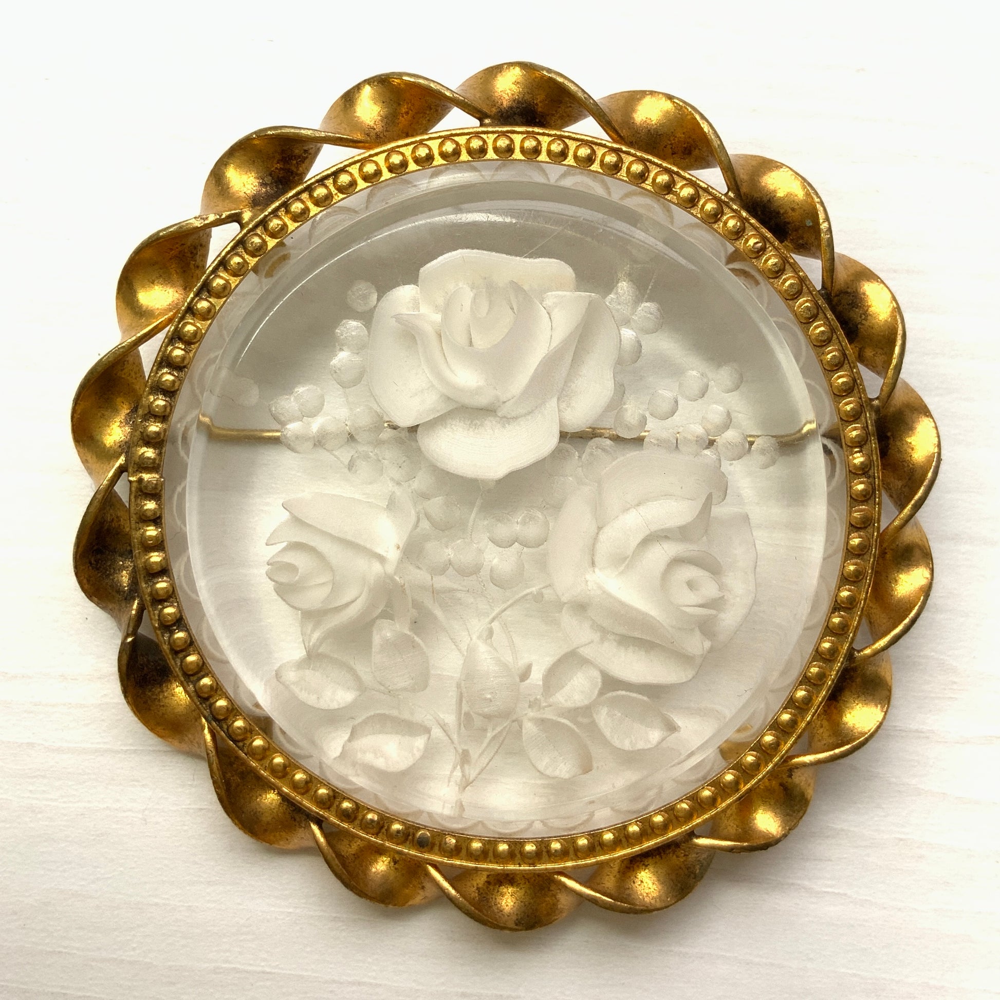 VINTAGE 1930-40's Reverse Carved White Rose Round Brooch
